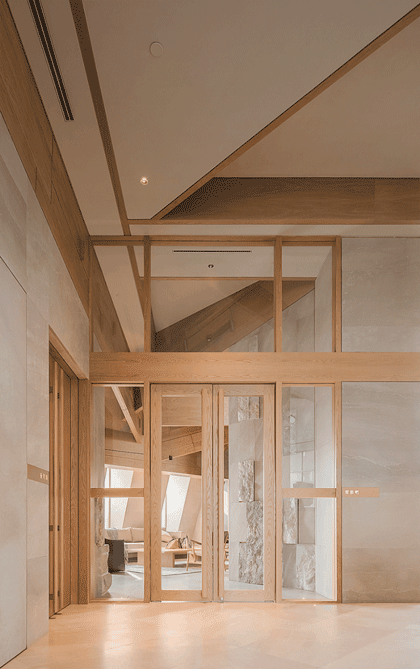 室内原有四个大平层,空间略显平淡,于是舍去三套最好的观景房,整合打造一个共享空间;将三层的空间上下连接为一体,包间面对共享区的墙体都处理成透明玻璃,保证整个室内空间的视野通透。