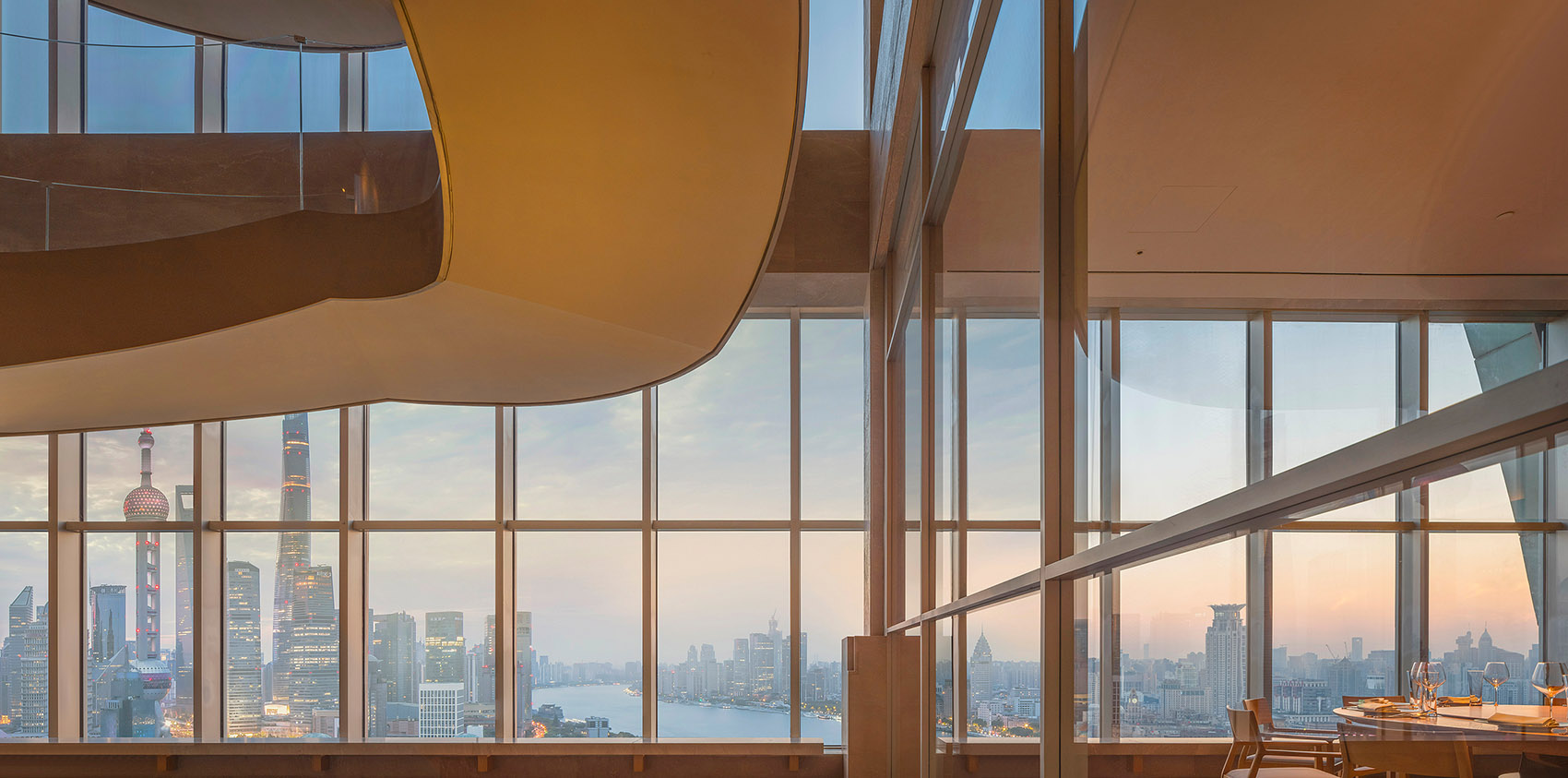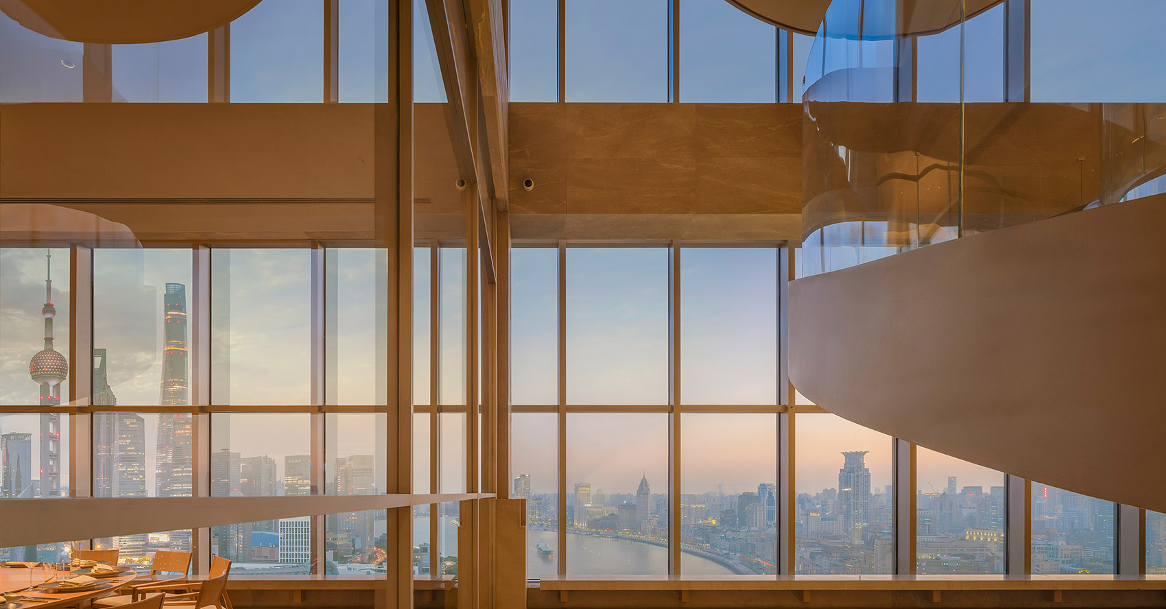 南北两侧的幕墙玻璃,引入了自然光线,室内和室外的景色自然交互,让客人更好感受身临其境大上海的美妙。