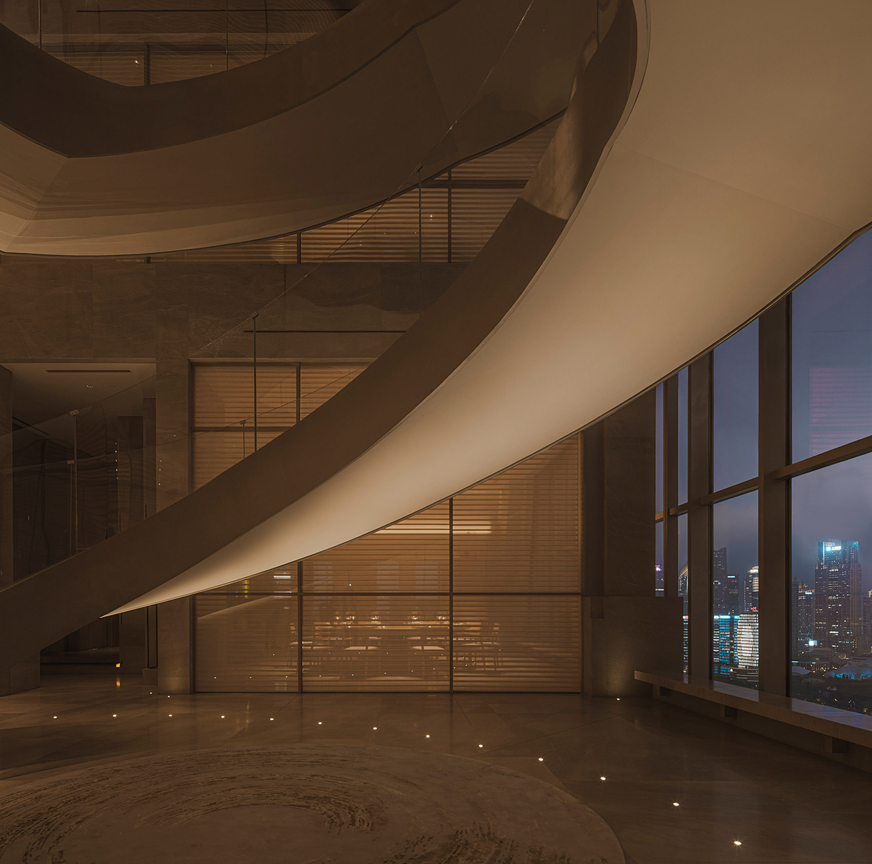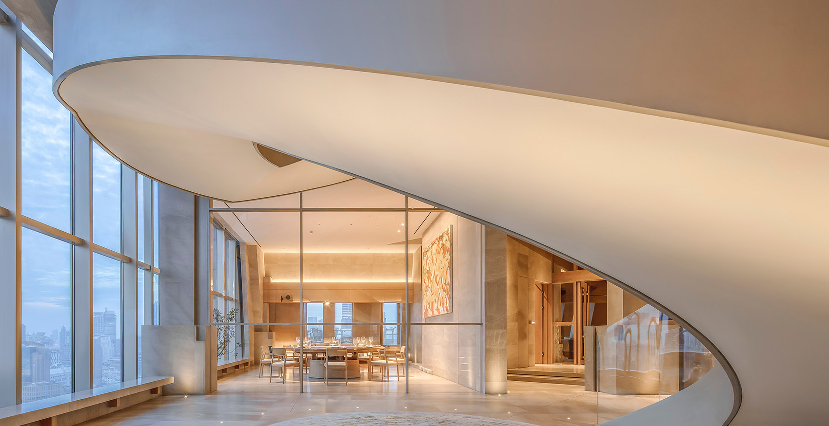 贯穿整个空间的观景旋梯,鸟瞰外滩一湾江水,仿如漂浮的彩带,漫舞其中!这一联系29至31层的旋转楼梯于共享区的中心位置,楼梯面纤薄轻巧,挑度悬空设计,线条简洁流畅,设计使用玻璃扶栏,减去视觉的阻隔。