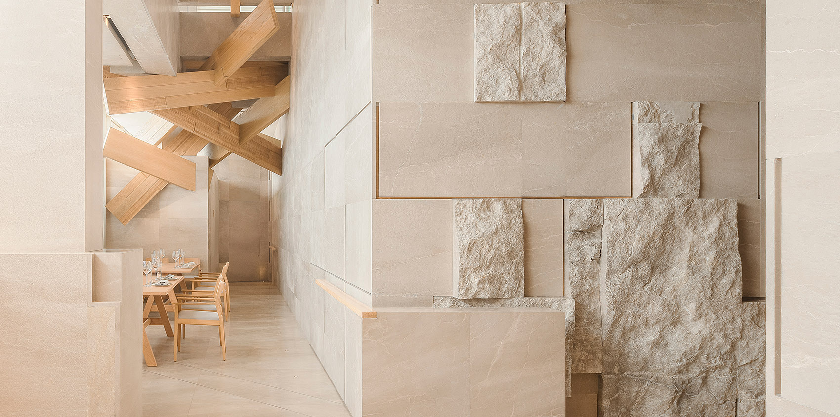 ▼木材穿插构造和粗旷的石材结合
