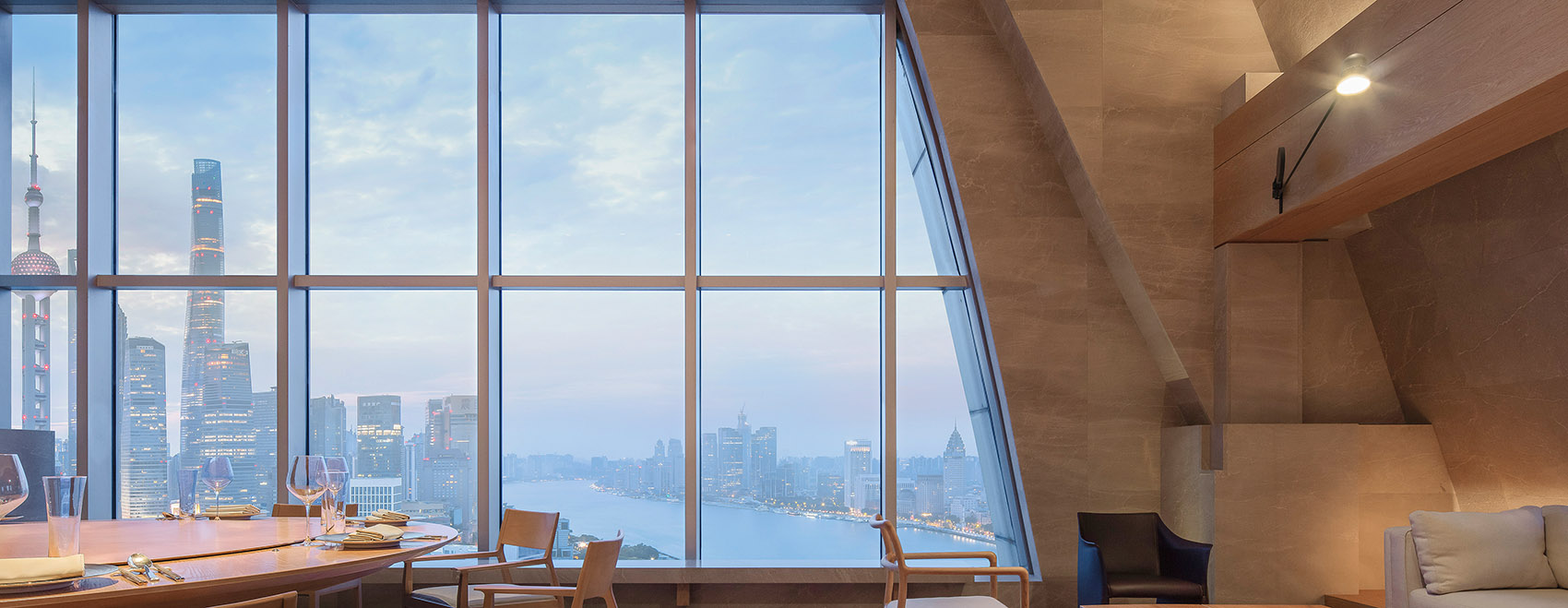 上海最好的观景位置条件,沪上餐饮界一大旗帜“晶采轩”餐厅,卓越出品与服务管理;这是一颗晶莹的珍珠,外滩缱绻一湾江水的平面就是晶采轩的剖面,条件至高无上有目共赏,我认为创造更开阔更通透的视野是整个空间塑造的核心要素。