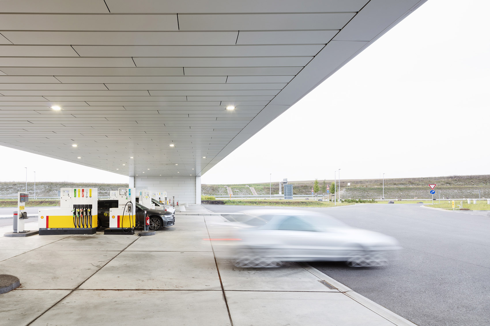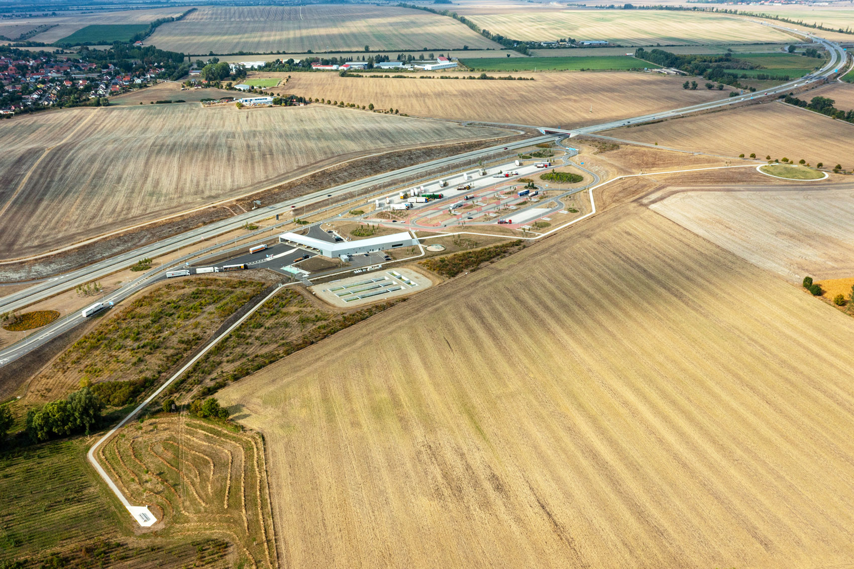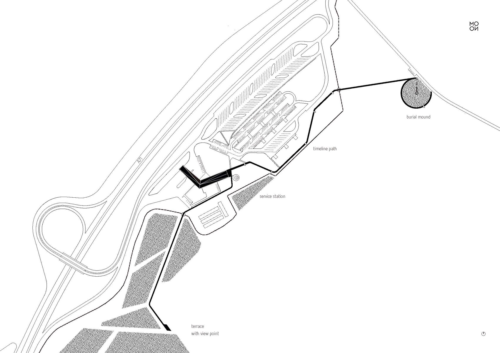 建筑主体被设计成一个由两翼组成的细长体量,完美地融入了平缓起伏的自然景观之中。灵感来源于附近社区发现的另一个考古遗址——一处同样可以追溯到青铜时代的长屋。封闭体量内不仅涵盖了服务区的所有功能,并设有一处展览空间,而与道路垂直的一翼则一直延伸至加油站的上方。最终,场地的入口以一个巨大的无柱屋顶为标志,勾勒出墓冢的第一道风景。