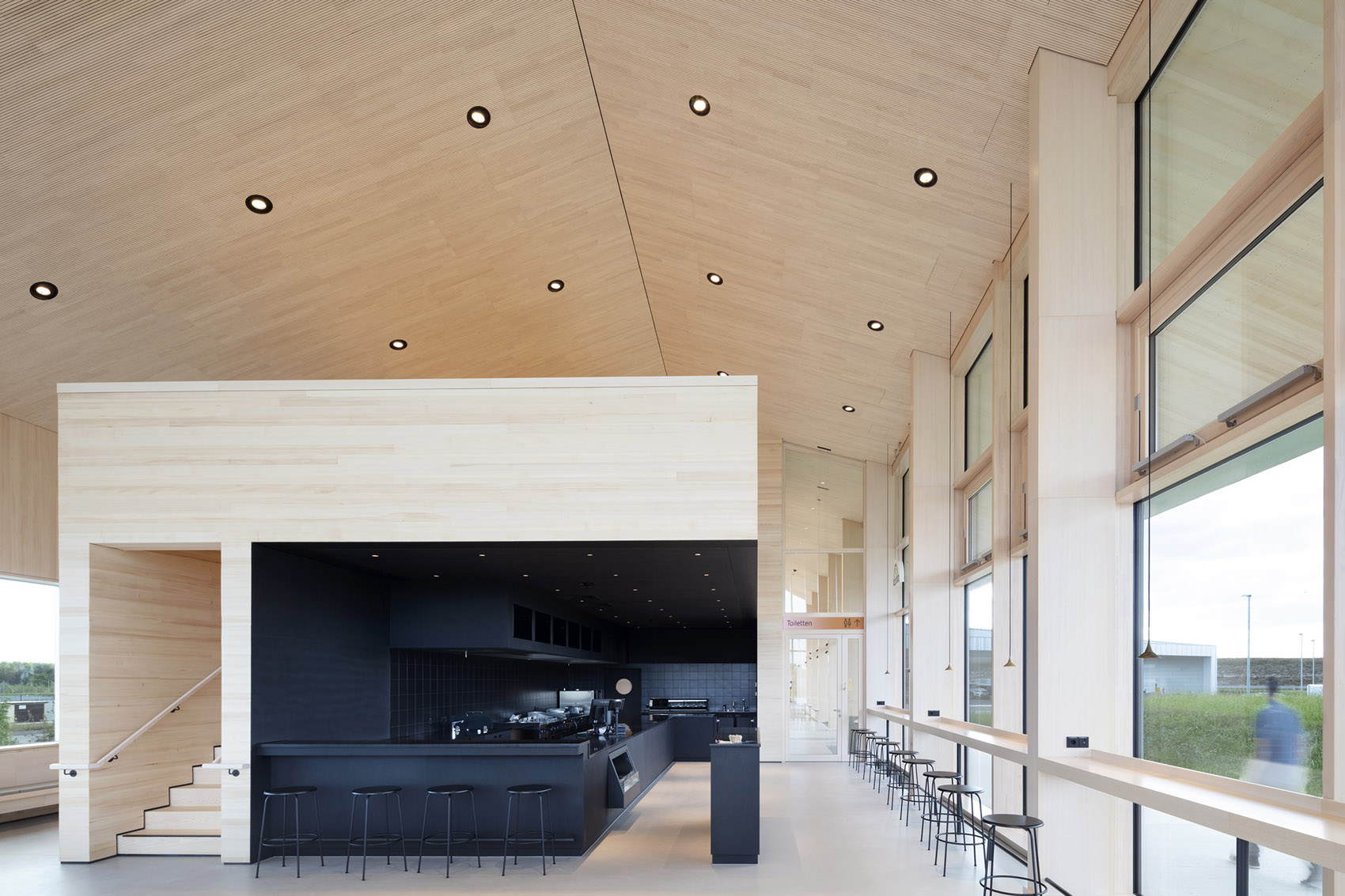 项目北侧,玻璃立面被移到后方,形成一处有顶的拱廊,用以引导游客前往两个主要入口。从这里开始,游客将进入既作为门厅空间,又作为分流区的展览空间。游客区被中央的大厅楼座分隔成不同的区域,下层为一个开放式的厨房空间。其中,实木包覆的墙壁和天花板为室内营造了温暖友好的氛围。浅色的石材地板将所有的设施空间连接起来,并为混凝土打造的前院空间、有顶拱廊以及自然步道提供了设计参考。