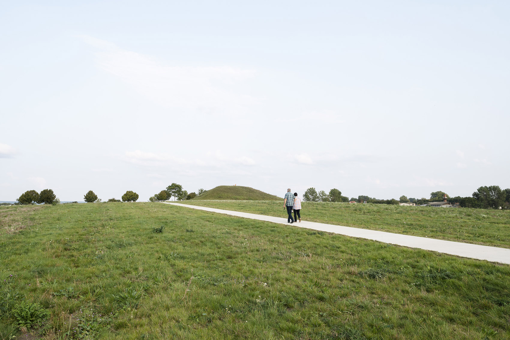 建筑与景观为营造平静克制的美感创造了机会,游客可以在此处体验到宁静氛围并停驻休憩。本次项目低调地伫立在这片广阔背景之中,以便Fürstenhügel可以占据中心位置成为该场地的主角。设计团队期望借此机会鼓励游客在此逗留,欣赏周围景致的同时,也可了解更多关于该地区的历史。这条教育步道不仅为通向墓冢提供了便捷的路径,同时也为建筑与景观之间建立了联系。整条步道以时间线的形式呈现,通过历史事件、考古发现和墓冢的建造过程,最后以环形步道包围的墓冢作为终点,将游客带回到过去的时光里。而项目中的另一特色——景观平台,游客可在这里欣赏被恢复的植被景观以及周围环境设施的全貌。