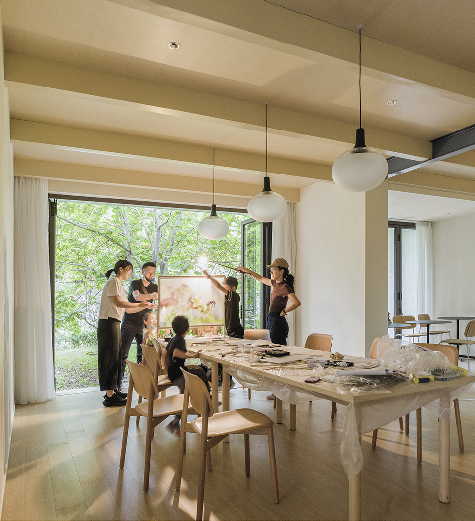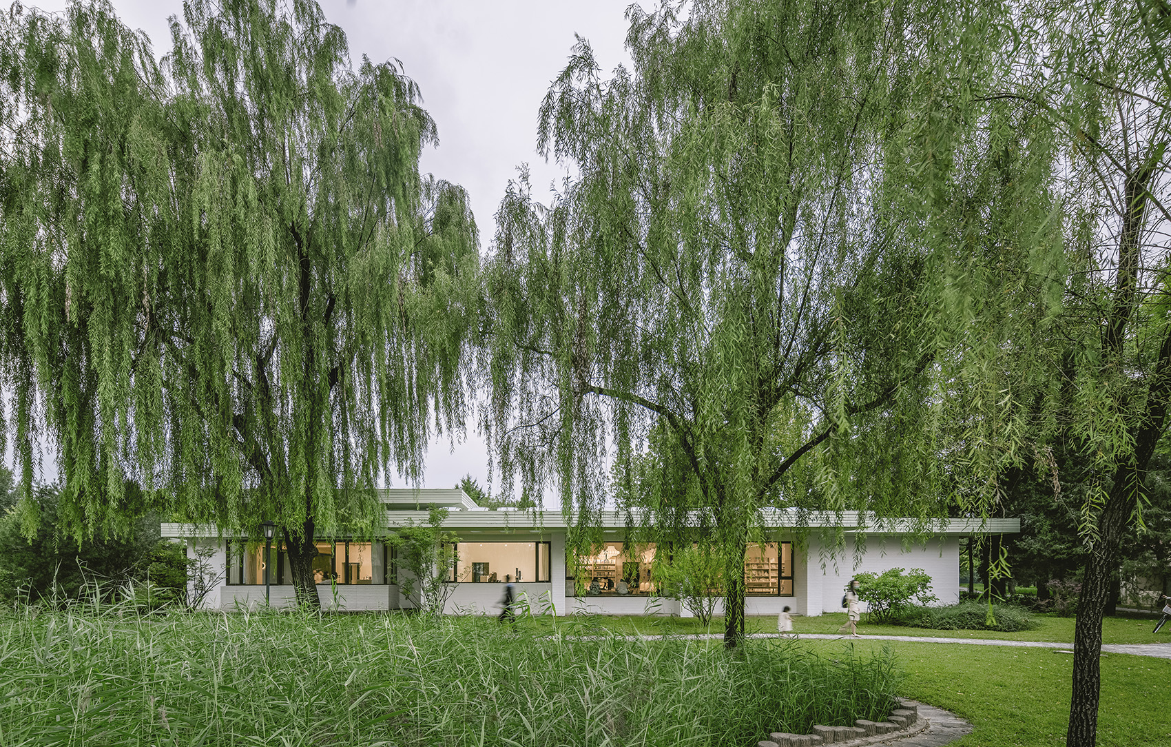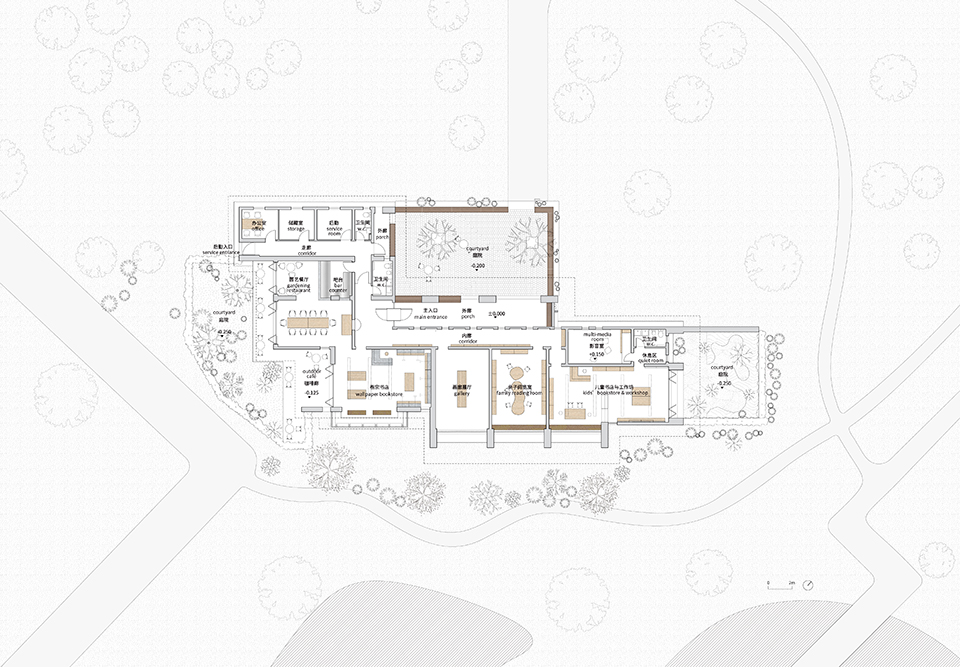 在同一片屋檐下的两家书店,利用同一栋别墅的不同房间改造而成,一家是大人的建筑书店,一家是儿童书店,它们既和谐又有微差。项目位于北京顺义,改造前是一栋坐落在湖畔密林里的单层别墅,室内由一条走廊串联若干房间,空间高度有4.8米和3.5米两种。这栋房子需要被改造成一个能同时容纳建筑书店(卷宗书店)、儿童书店(一善书店)、餐厅、画廊展厅和后勤办公的场所。