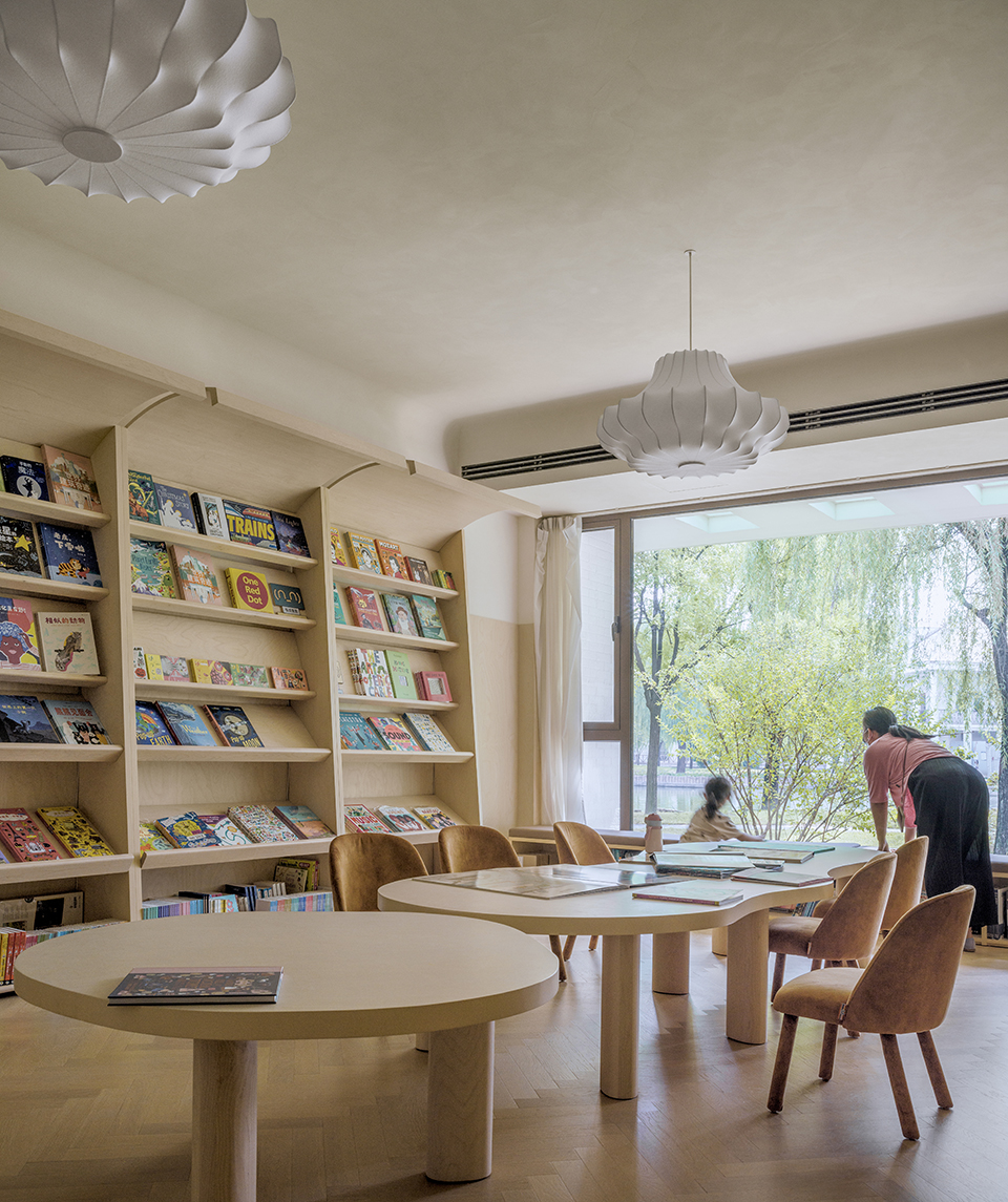 从门厅进入到内廊,来到了儿童书店的区域。木墙裙的饰面让空间的基调变得温暖柔和,我们希望儿童空间像家一样舒适,是可以让人坐下来的地方。儿童书店所在的三间原是别墅的卧室,我们只是拆除了卫生间的隔墙,使空间更完整,然后靠墙摆满了木制的书架,靠窗设置了长凳,房间中间放置低矮的大桌和书柜,降低了整个空间的重心,营造一种内向的包裹的氛围,无论坐在窗前还是灯下,都让人感到舒适而放松。