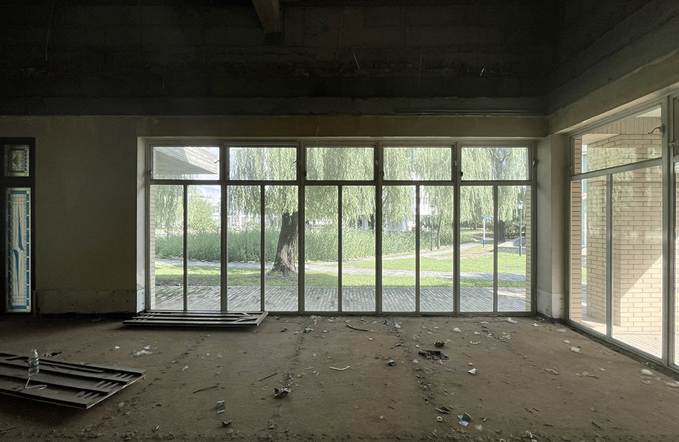 现状建筑的外立面是瓷砖贴面,品质不佳,局部也有剥落。从造价和工期角度考虑,我们决定用一层较厚的腻子弱化原有瓷砖的肌理,并制造出一些不均质和粗糙的手工痕迹,再覆盖亚光的涂料,让建筑表面没有那么呆板生硬。从湖对岸眺望,低矮建筑、朴素的外墙,和如画的风景融为一体。