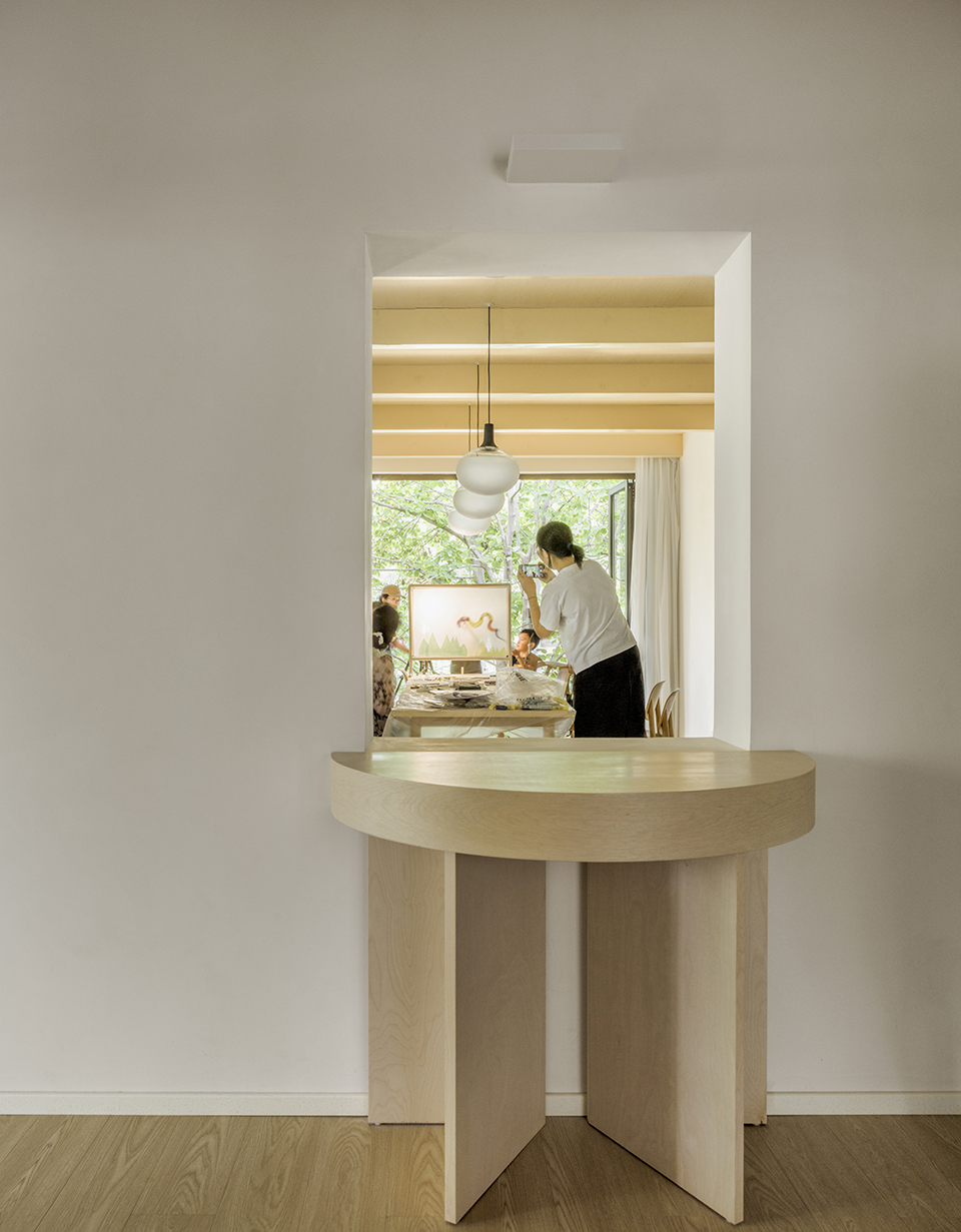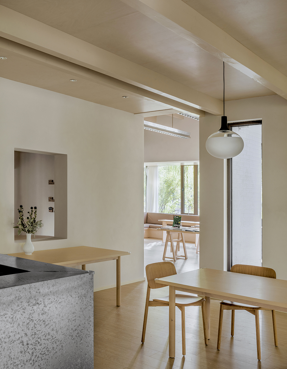 从外廊进入到门厅,视线通过餐厅隔墙上的窗洞,直接被引向室外的院子,层次一多,空间会显得更深远。我们把客厅和餐厅西南角的三面落地窗拆除,西面的两处替换成让人可以走到室外庭院的折叠门。南面的一处则向外扩展为凸窗,并设置阅读沙发,成为了建筑书店的阅读区。这样扩展了室内空间的宽度,感受也更舒展。卷宗书店和餐厅原本在空间上是连续的,通过打开的立面,又进一步将空间的连续延伸到室外。整个卷宗书店的一侧采用了木吊顶,让这片区域笼罩在同样的氛围下。同时利用吊顶的高度和板块的分割设置了空调风口,保持了室内的简洁。