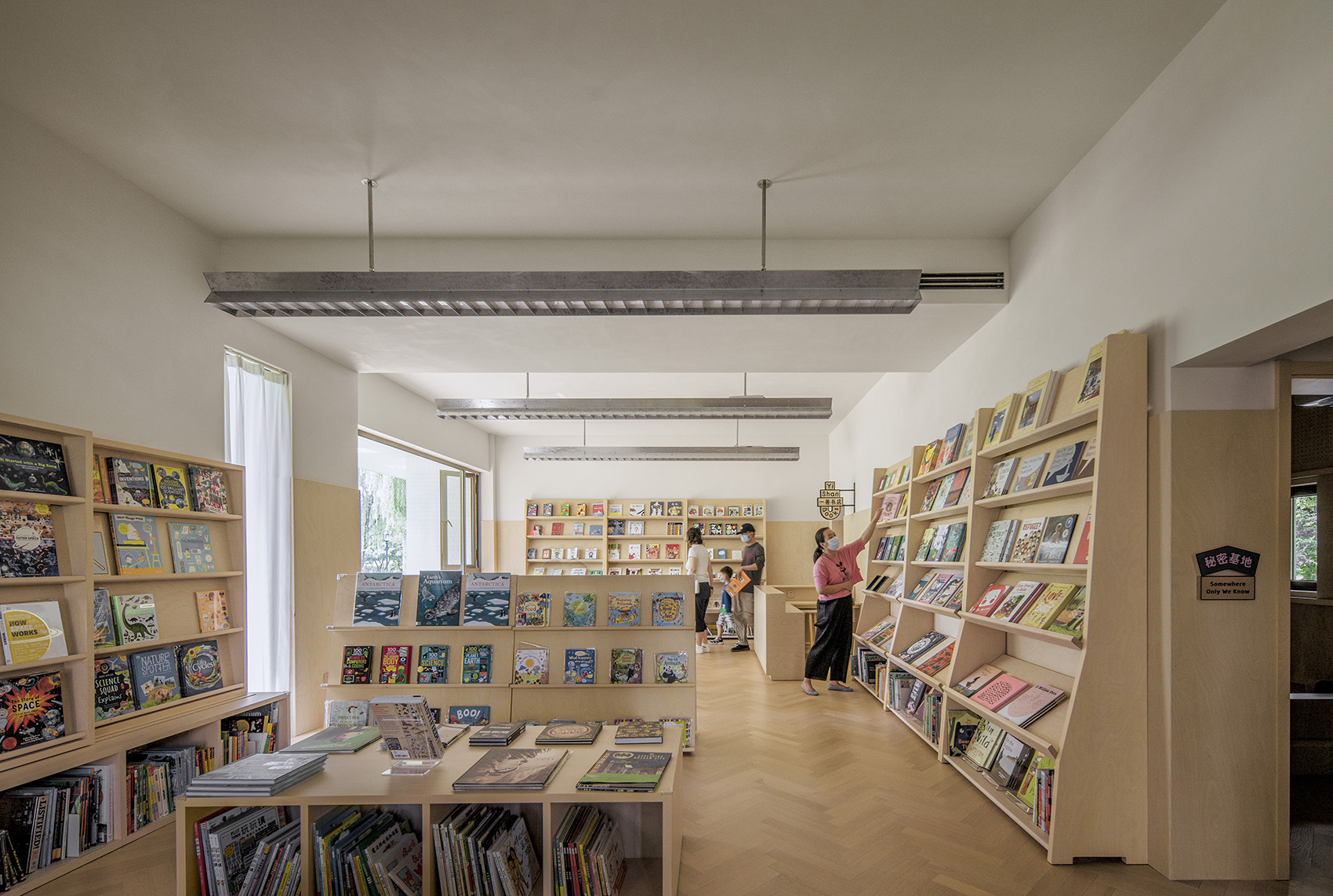 现状建筑是砖混结构,需要在保持原有承重墙和立面洞口完全不变的前提下,规划内部空间的使用。我们利用原来空间较高的门厅、客厅和餐厅,分别作为书店入口、卷宗书店的阅读区和咖啡区,同时把靠近流线尽头且空间较低的三间房间,作为儿童书店,那里既安静又私密。这样,同一个屋檐下既包含了建筑书店,又容纳了儿童书店,两者有不同的空间逻辑。我们希望建筑书店的空间是连续而外向的,儿童书店则是内向的、包裹感强的,同时两者在风格上既和谐又有微差。