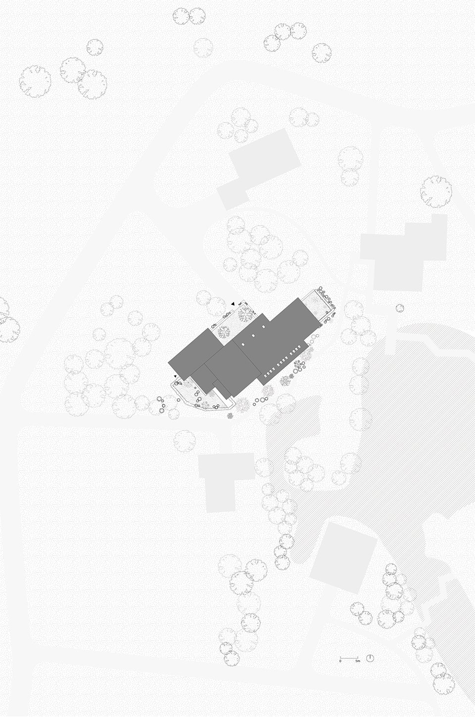 现状建筑北侧原来的入口和车行道路直接相连,东侧与斜对面的别墅对视,西侧紧邻嘈杂的步道,建筑外围的场地没有太强的领域感。我们首先在房子的东北西三个面各加了一个院子,增添了从外部进入建筑的空间层次,这也为将来举办户外活动预留出场地。入口前院中补种了两棵树,在夏季可以提供一些树荫。原本的院墙,由于物业管理方对其高度做出了限制,于是院墙改成了长凳。西侧和东侧的两个院子,只是简单用低矮的树篱围合,尽可能保留了现状的植物。