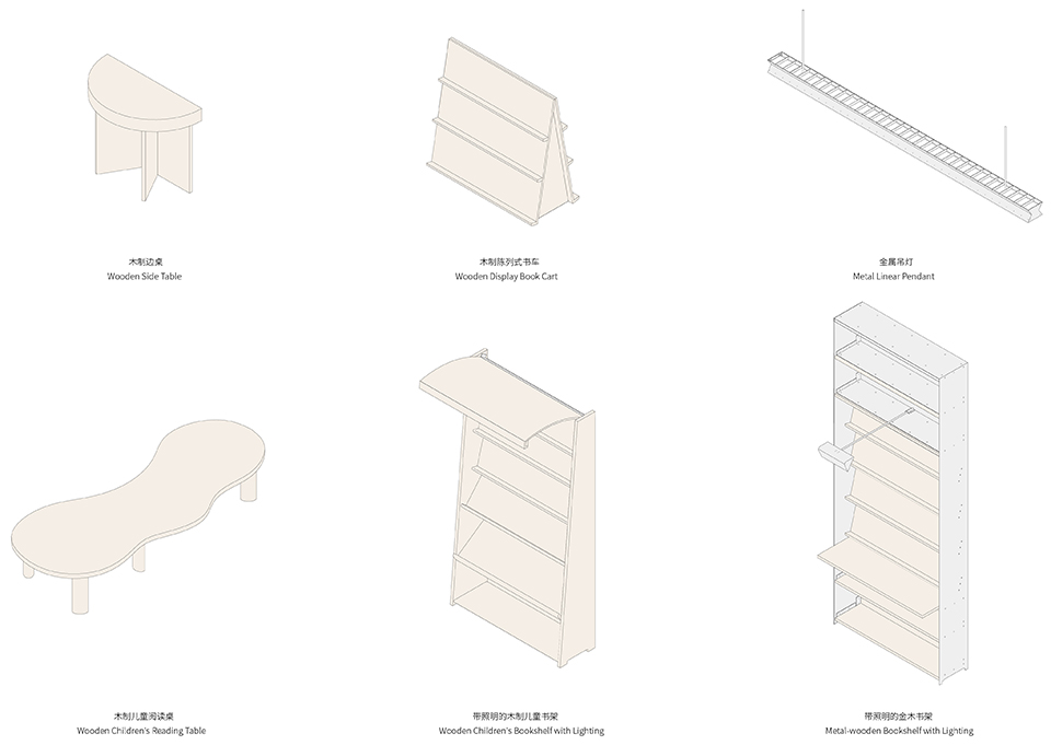 我们为书店设计了家具和灯具。大吊灯由镀锌钢板制成,巨大的形体可以统治整个空间氛围。足够的发光面积让光源的可视面保持柔和,上下发光,夜晚室内也有均匀的光照。卷宗书店的书架延续自我们之前为第一家卷宗书店所做的设计,自带光源,避免了在天花上安装射灯,保持了天花的相对整洁。至于儿童的书架,我们首先考虑的是如何方便儿童选书。童书有时候并不轻薄,而且常常开本很大,根据儿童身高,我们把倒数第二层设计成 “可以大致翻阅层”,我们希望比较厚重的书可以放在这一层,方便儿童挑选。较高的层都是封面朝外,方便儿童判断,家长协助拿取。最下面一层是密集摆放层。书架上部伸出弧形的挑板为照亮书架提供柔和的光源。