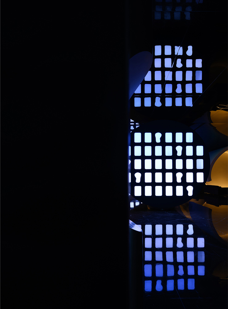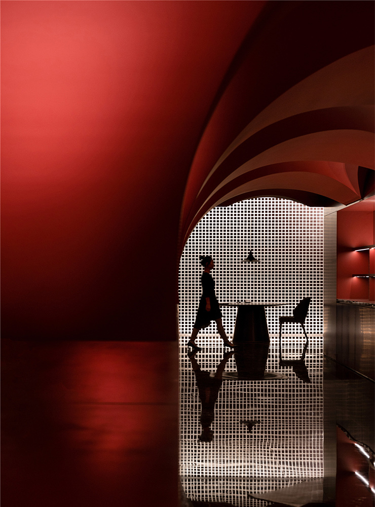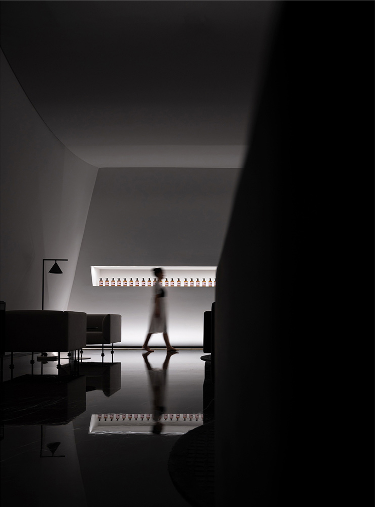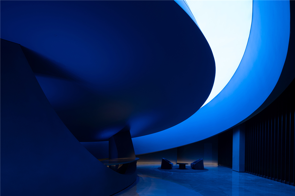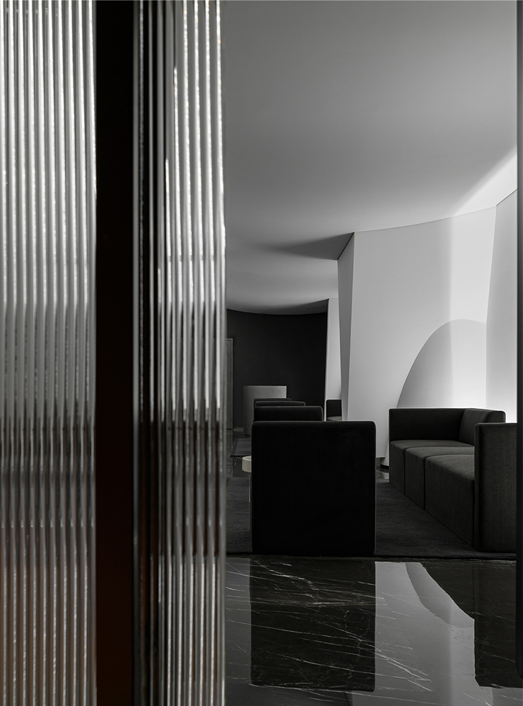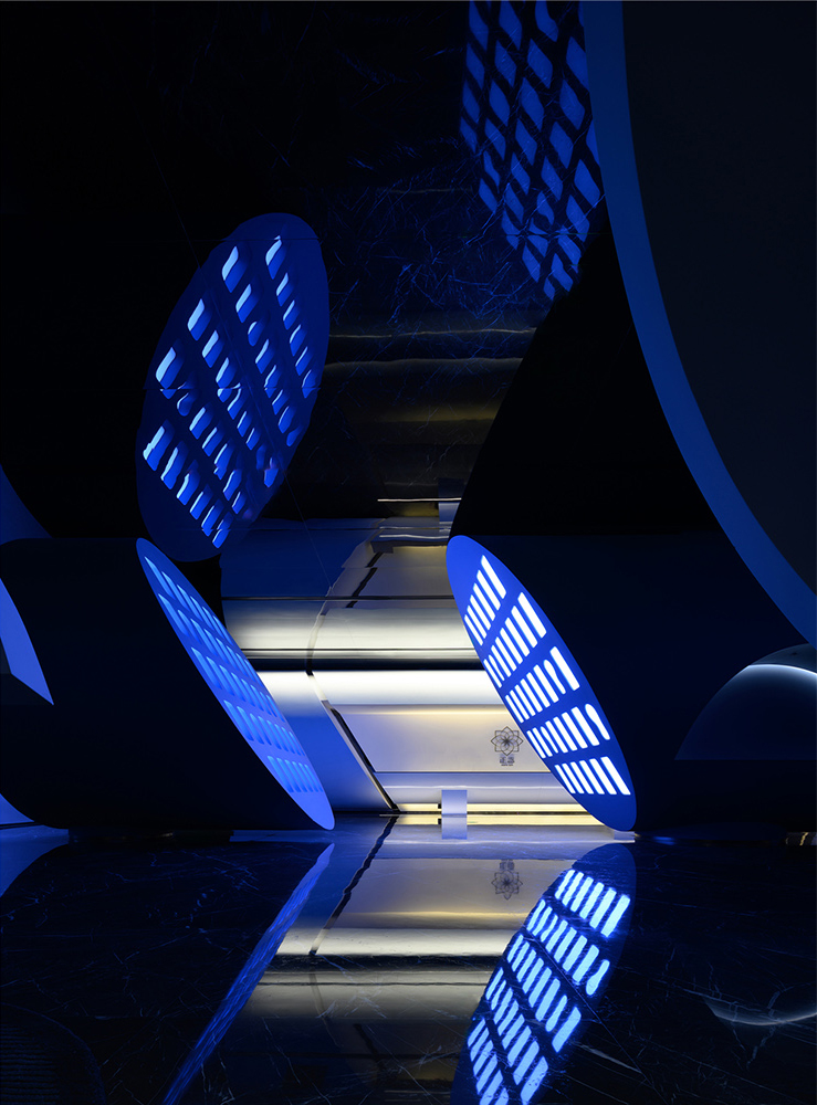 项目并非传统的室内设计,灵动的曲线造型跳脱外在的形式化和结构化,打破了边界,完美地演绎着建筑与艺术的关联。与此同时,形体的多种组合也传达了持续性、神秘的迷失感,配合着光线的交错与重叠,辅以高光泽度材质模糊了动态视觉对边界的定义。它的复杂性也寓言着空间中安静而优雅的氛围,意图让人们在虚实相间的影像中发现另一个世界。
