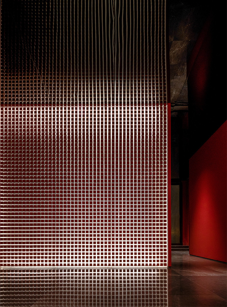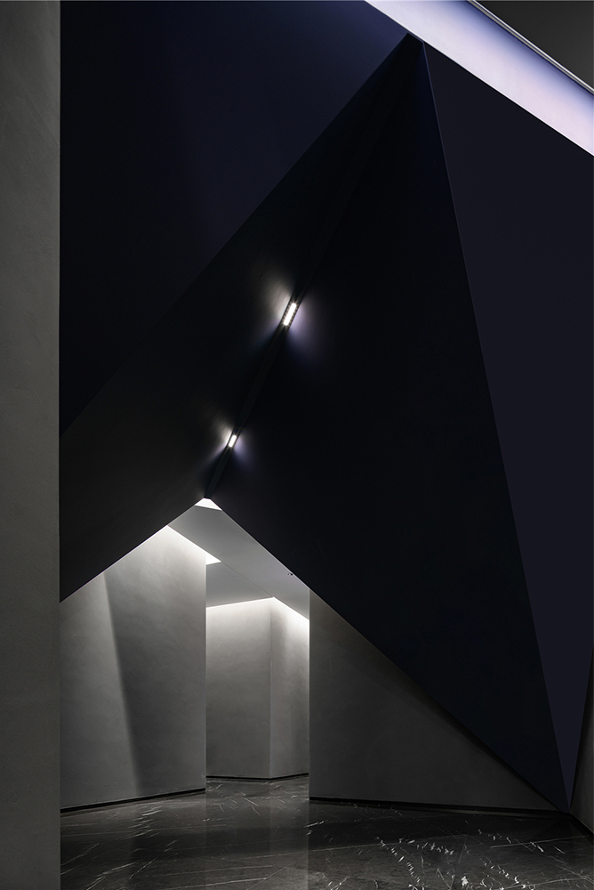 在打造“微城市”空间界面的同时,打破平整里的平庸通俗,辅以对比质感强烈的石材和涂料,不断碰撞出有趣多彩的转折空间。纯粹的形体关系在色彩和灯光的烘托下,使人进入到环境中,便被强烈的艺术气氛包围。