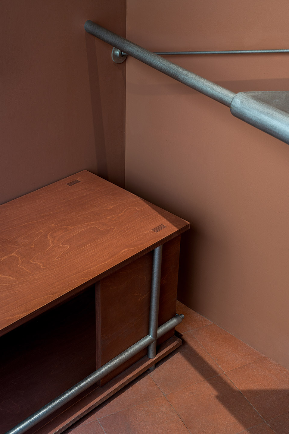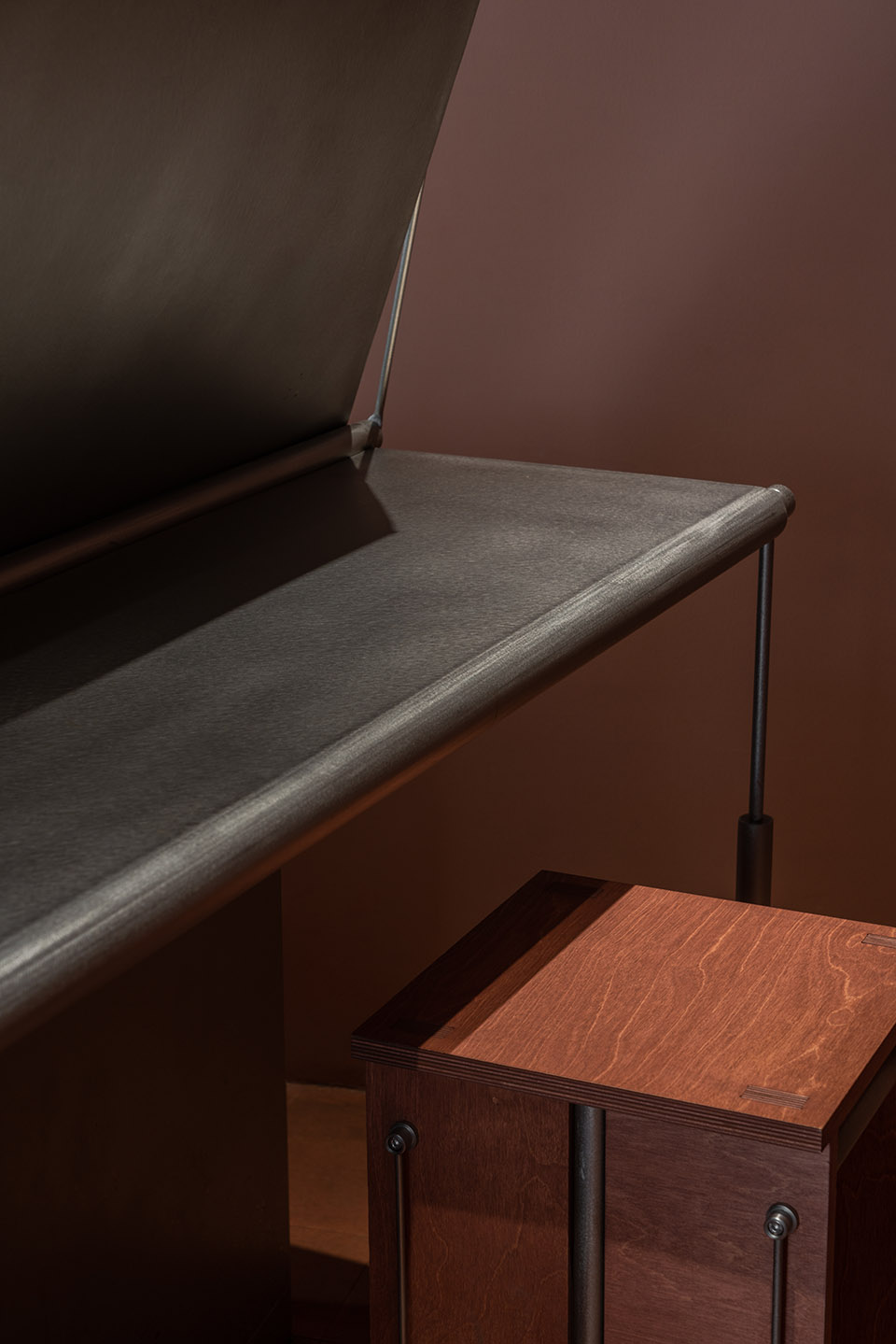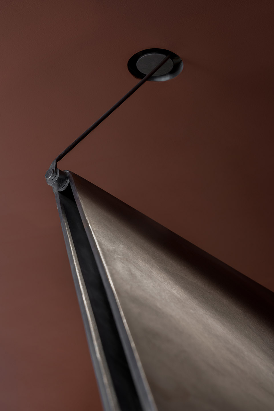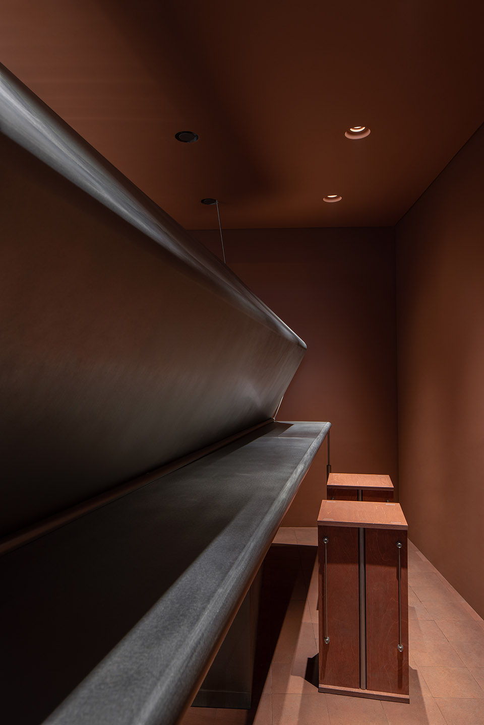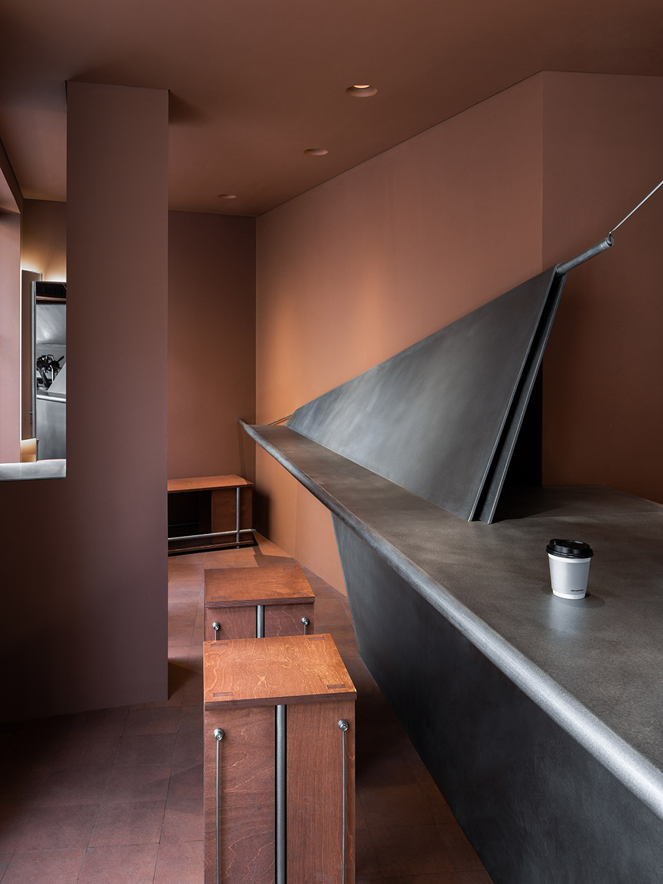 不锈钢它稳定、坚硬、耐蚀,成型性好,无疑是作为咖啡台的优选材料之一。但这次,MAS将它变得“柔软”起来。通过墙、顶、地面支点与横向滚轴,使其转换成纸张的形态,搭建组合,形成极具张力视觉感受。