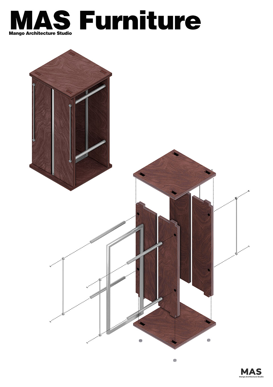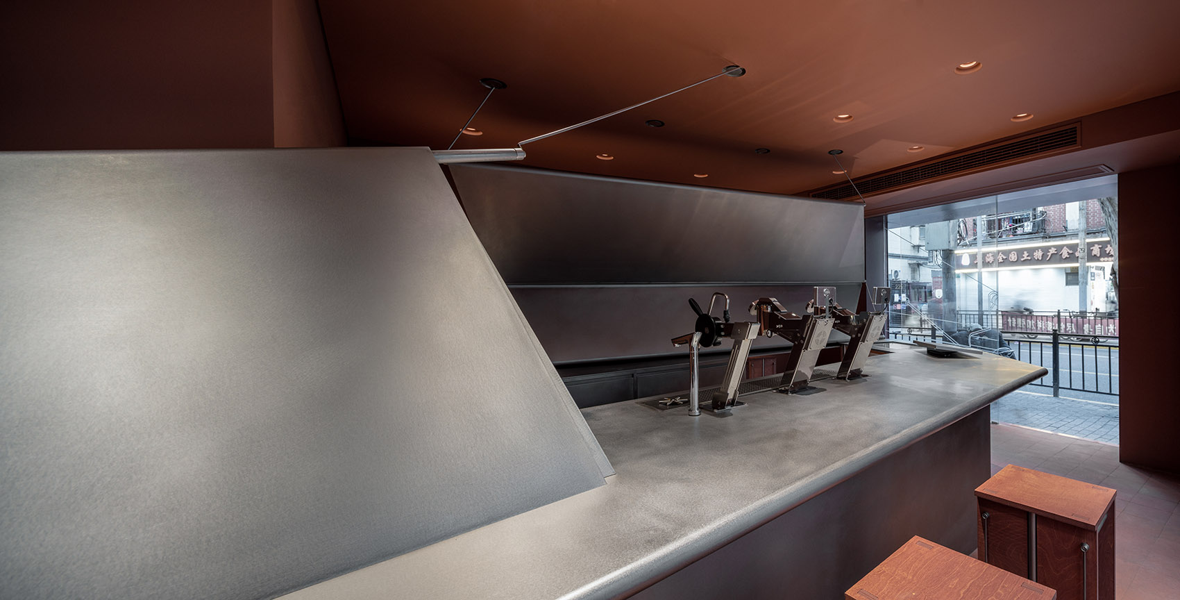 MAS在空间内设计定制了一组统一语言的家具,前场的吧椅,后场的长椅、短凳及小圆桌。在与人直接接触的物件使用了深色的木材,造型轻盈且具有结构感,希望捕捉一点老上海复古味道和似曾相识的市井感。
