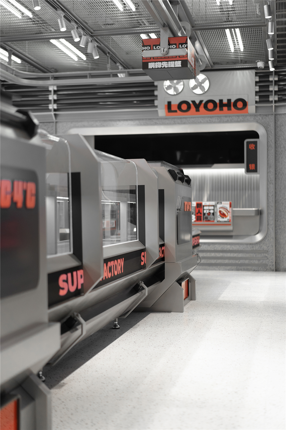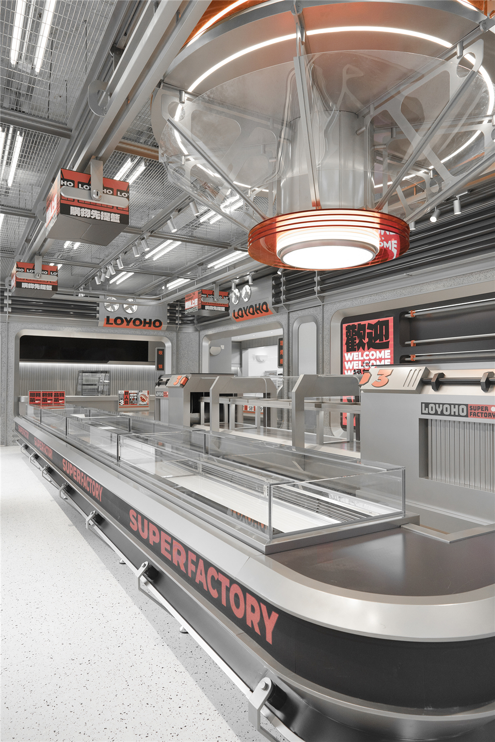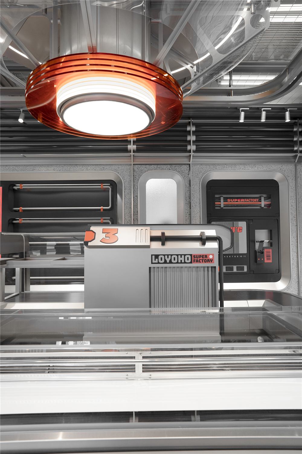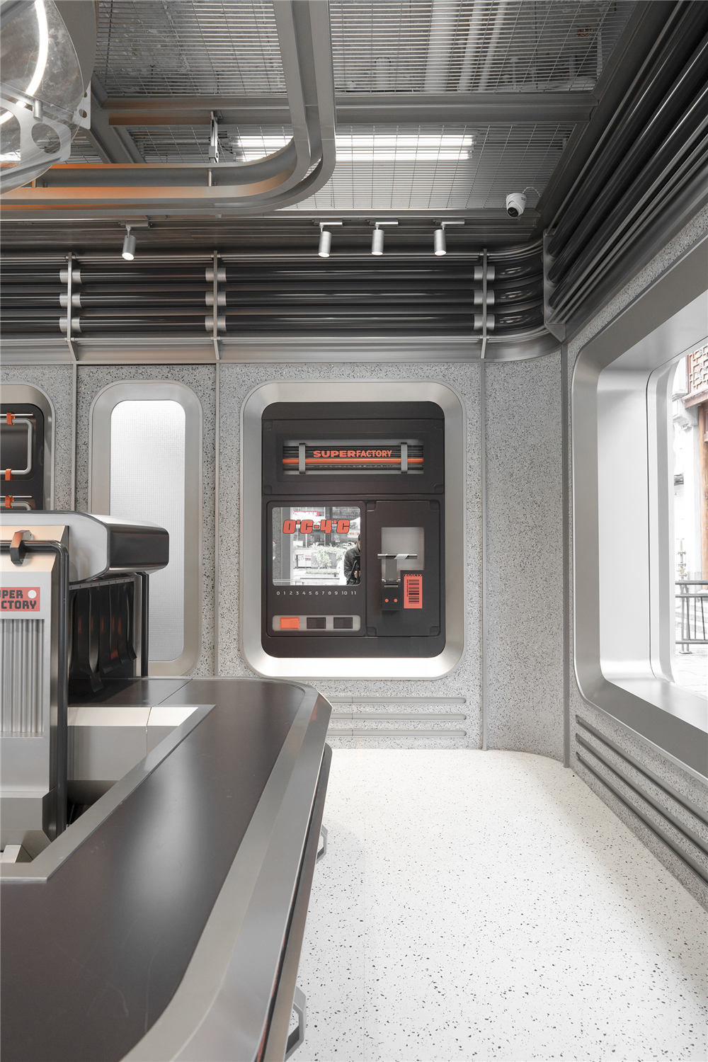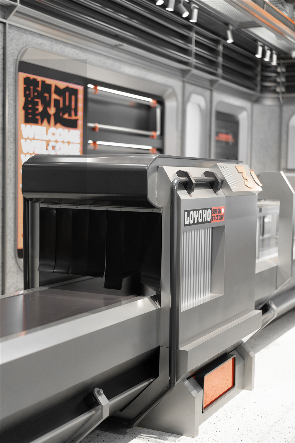 进入到室内空间,一个巨大的“工业环”是空间中的核心。机械感的环形生产线,是制饼厂的生命线。也是产品展示,选购的载体。悬挂的漏斗形装置,像不断的在为生产输送原料。吊挂的运输线在循环往复地把生产好的产品输送到客人手中。一系列的结构设计,都是让客人可以沉浸于“制饼厂”的主题中。室内空间立面,均以不同尺度的窗口为结构,每一个窗口也有其特殊的功能,有展示产品,有售卖产品,有联通室内外景观,也有收银结账。有秩序的贯穿了空间各个功能模块。橙红色的品牌视觉延伸到空间的每一个触点,动态与静态相结合的多维展示方式为空间赋予了多彩的活力,同时也增加了产品信息展示和更多的信息表达途径。
