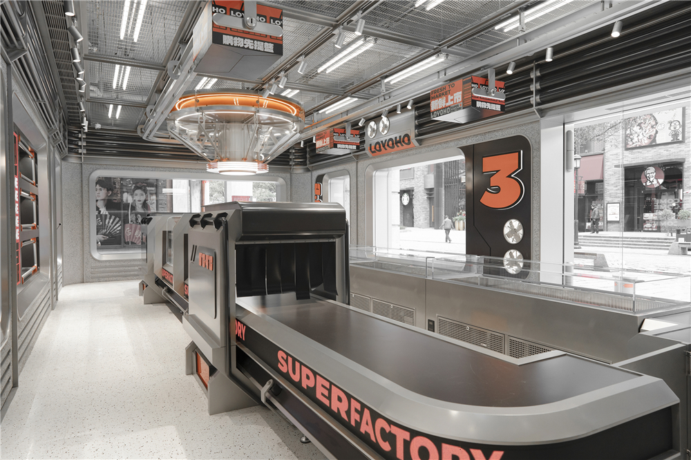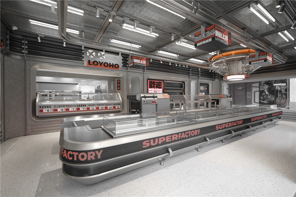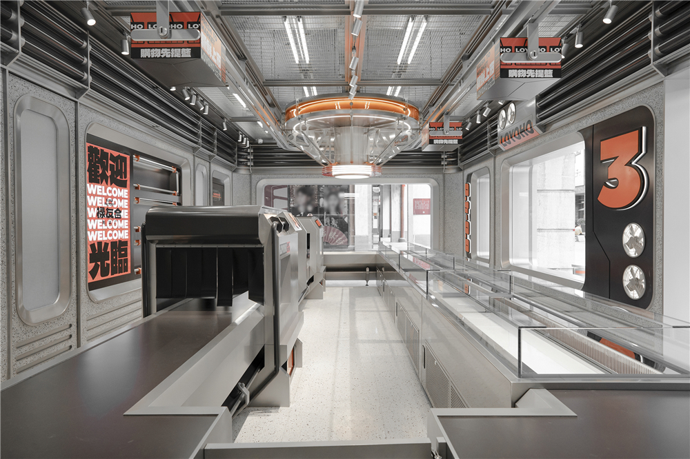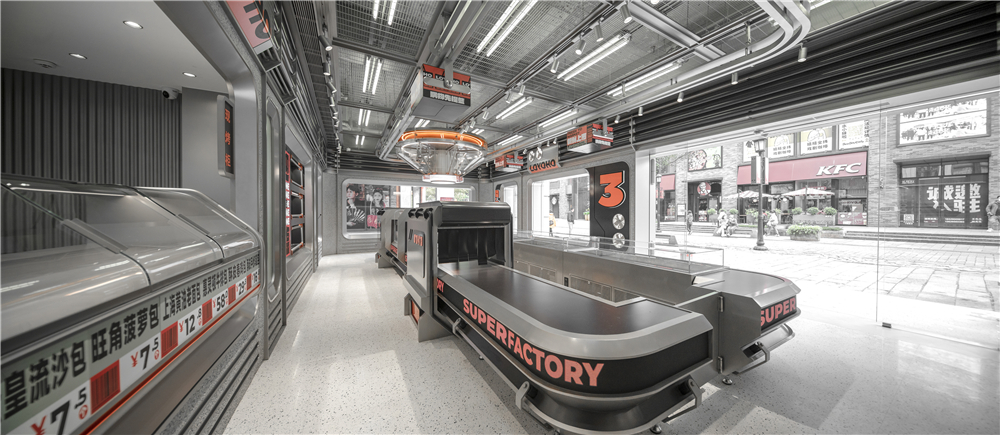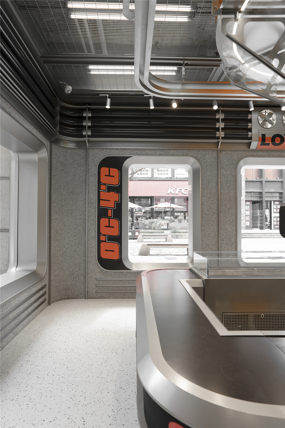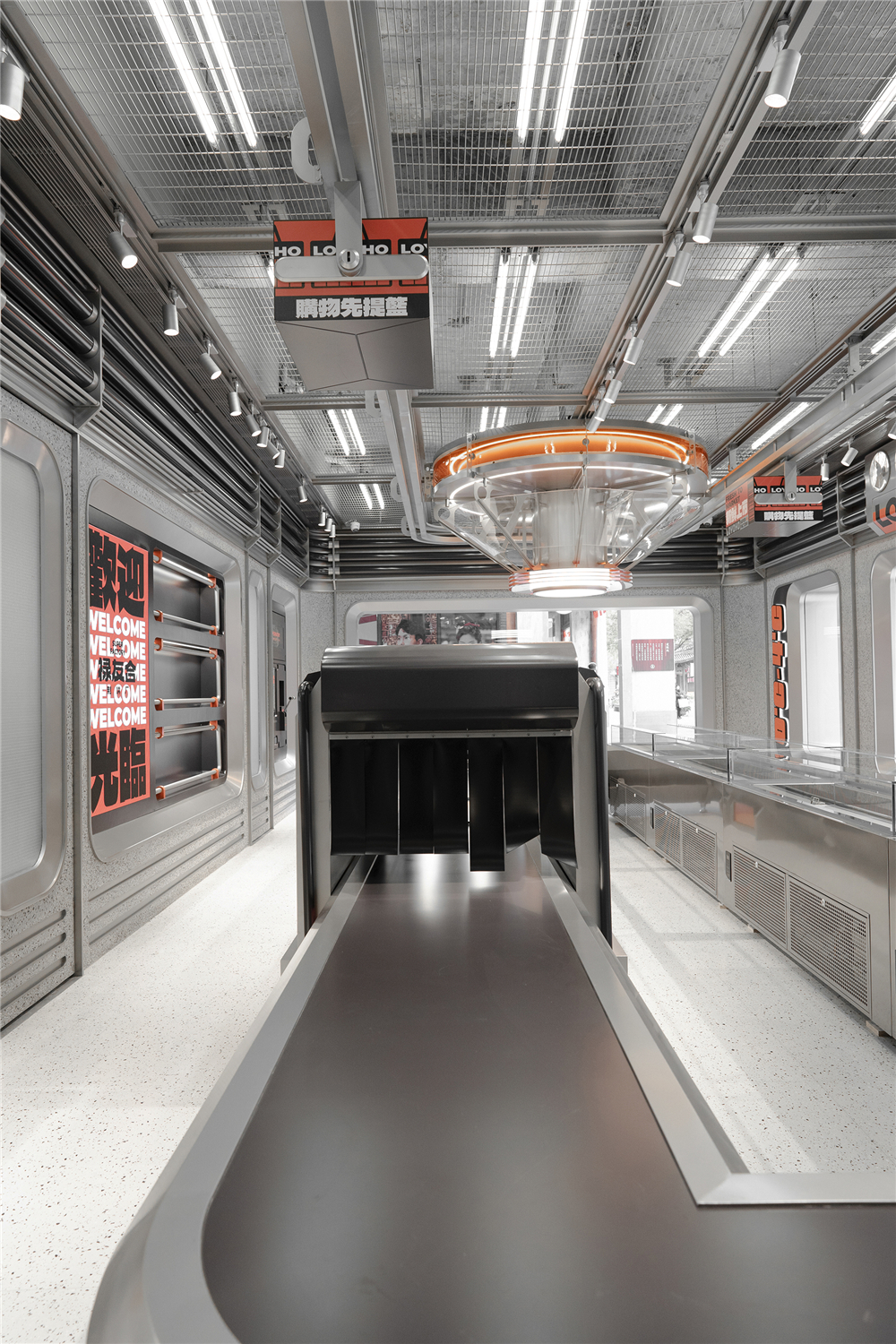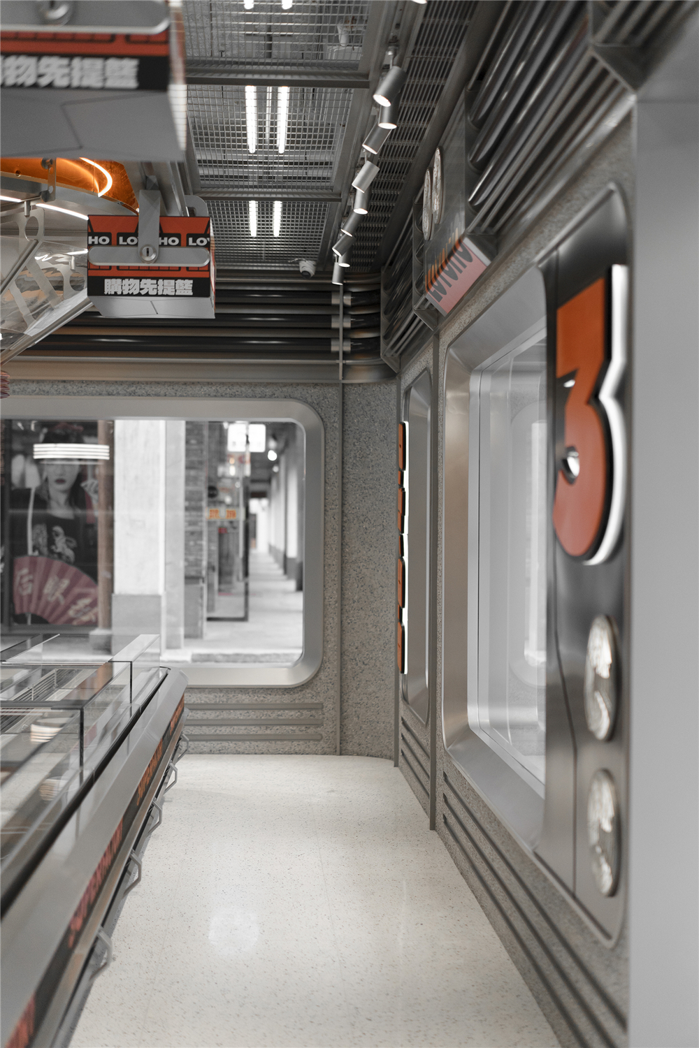 进入到室内空间,一个巨大的“工业环”是空间中的核心。机械感的环形生产线,是制饼厂的生命线。也是产品展示,选购的载体。悬挂的漏斗形装置,像不断的在为生产输送原料。吊挂的运输线在循环往复地把生产好的产品输送到客人手中。一系列的结构设计,都是让客人可以沉浸于“制饼厂”的主题中。室内空间立面,均以不同尺度的窗口为结构,每一个窗口也有其特殊的功能,有展示产品,有售卖产品,有联通室内外景观,也有收银结账。有秩序的贯穿了空间各个功能模块。橙红色的品牌视觉延伸到空间的每一个触点,动态与静态相结合的多维展示方式为空间赋予了多彩的活力,同时也增加了产品信息展示和更多的信息表达途径。