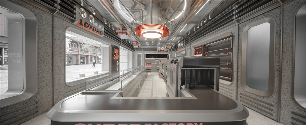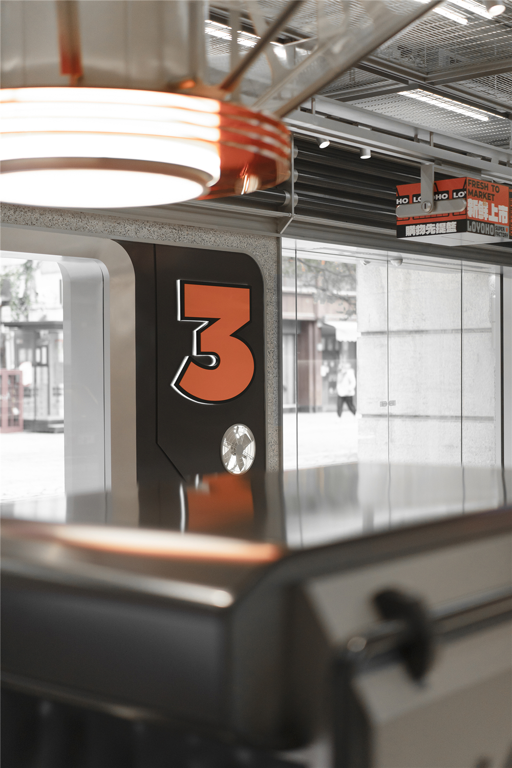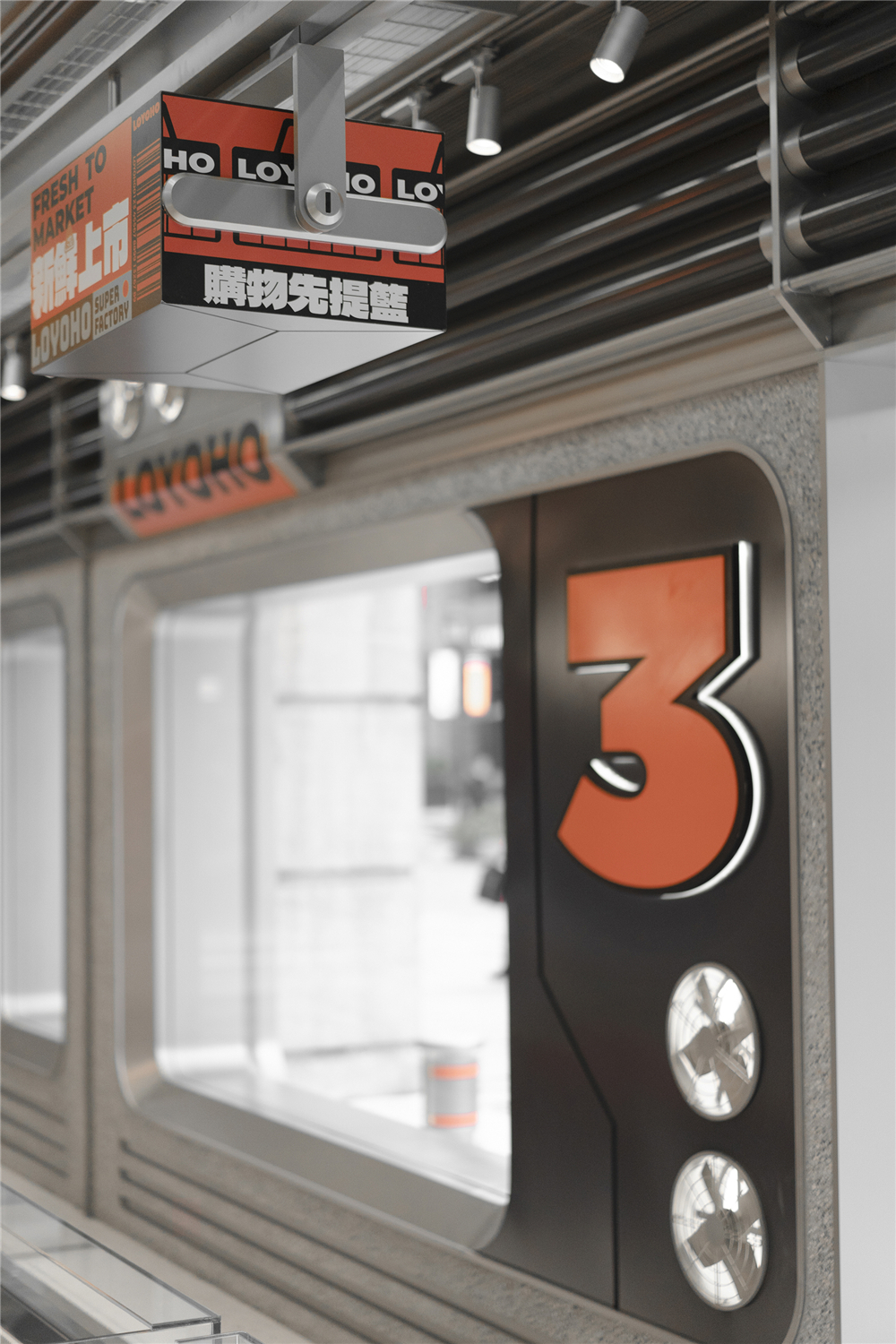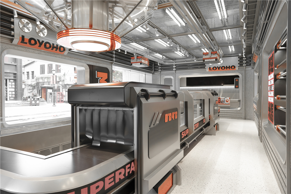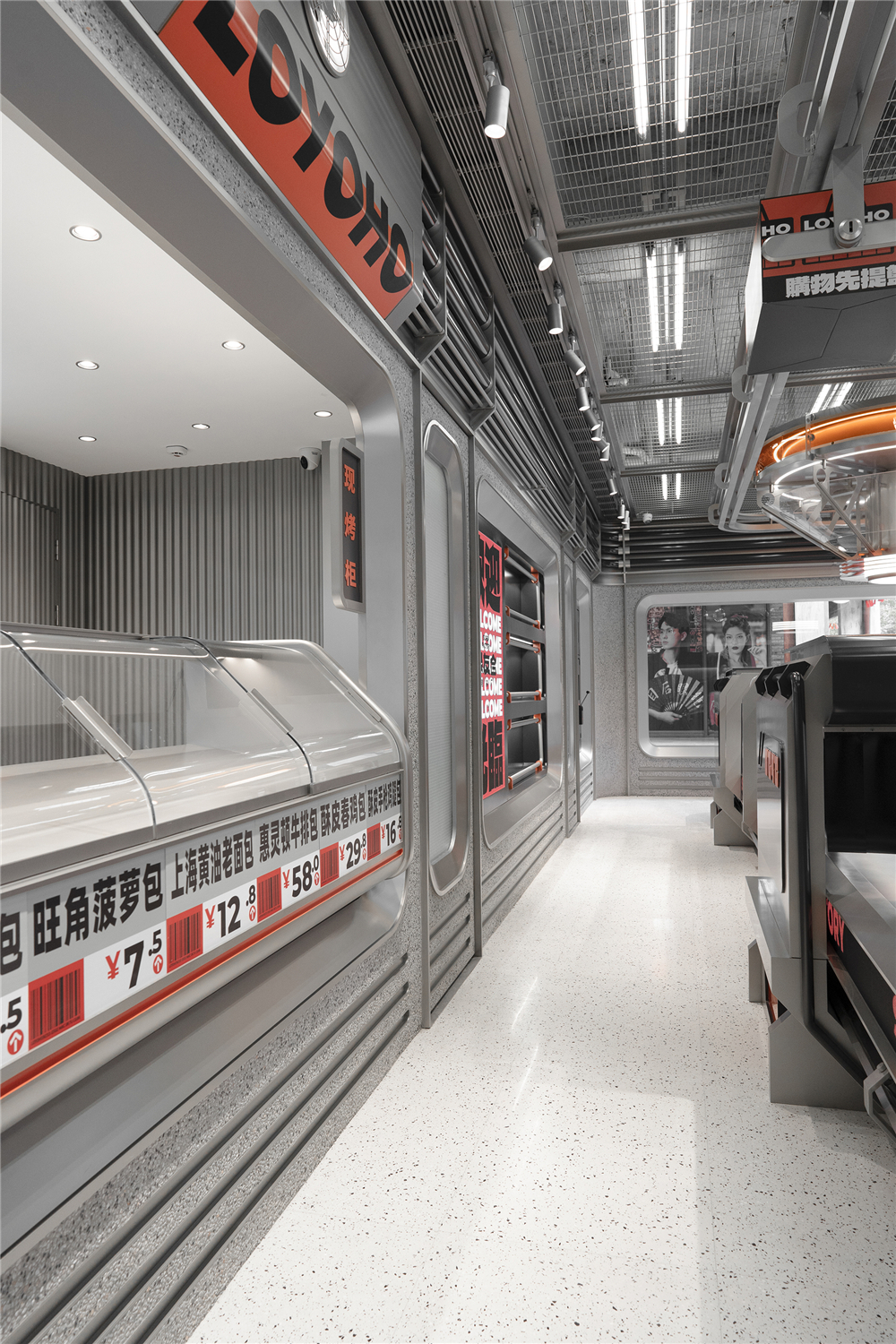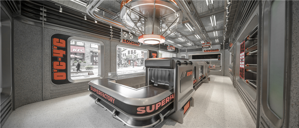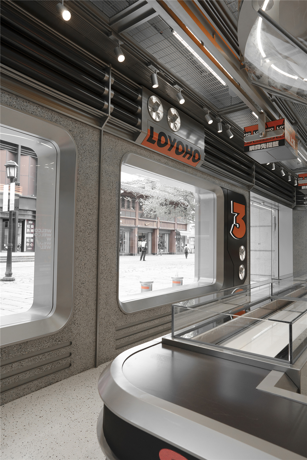 进入到室内空间,一个巨大的“工业环”是空间中的核心。机械感的环形生产线,是制饼厂的生命线。也是产品展示,选购的载体。悬挂的漏斗形装置,像不断的在为生产输送原料。吊挂的运输线在循环往复地把生产好的产品输送到客人手中。一系列的结构设计,都是让客人可以沉浸于“制饼厂”的主题中。室内空间立面,均以不同尺度的窗口为结构,每一个窗口也有其特殊的功能,有展示产品,有售卖产品,有联通室内外景观,也有收银结账。有秩序的贯穿了空间各个功能模块。橙红色的品牌视觉延伸到空间的每一个触点,动态与静态相结合的多维展示方式为空间赋予了多彩的活力,同时也增加了产品信息展示和更多的信息表达途径。