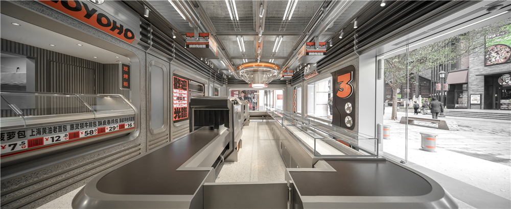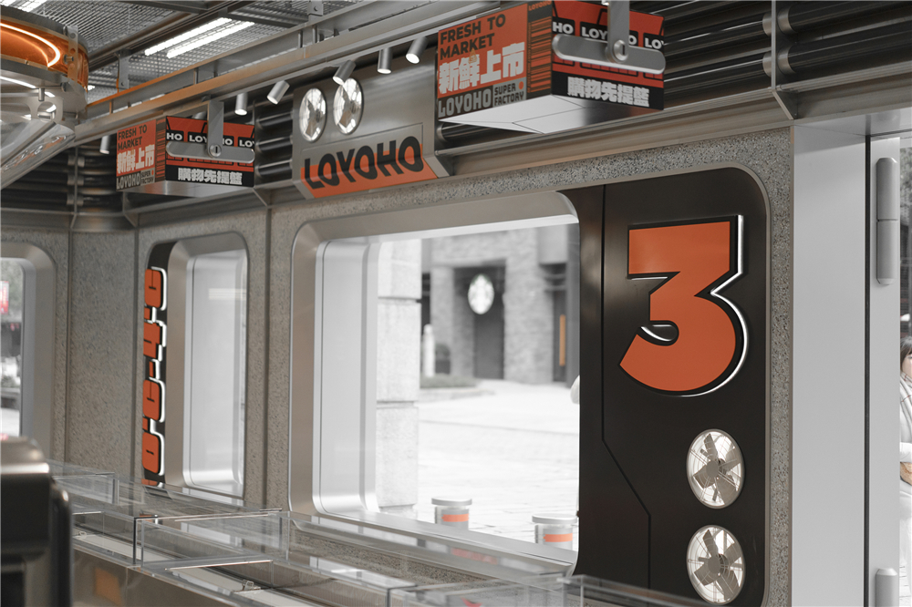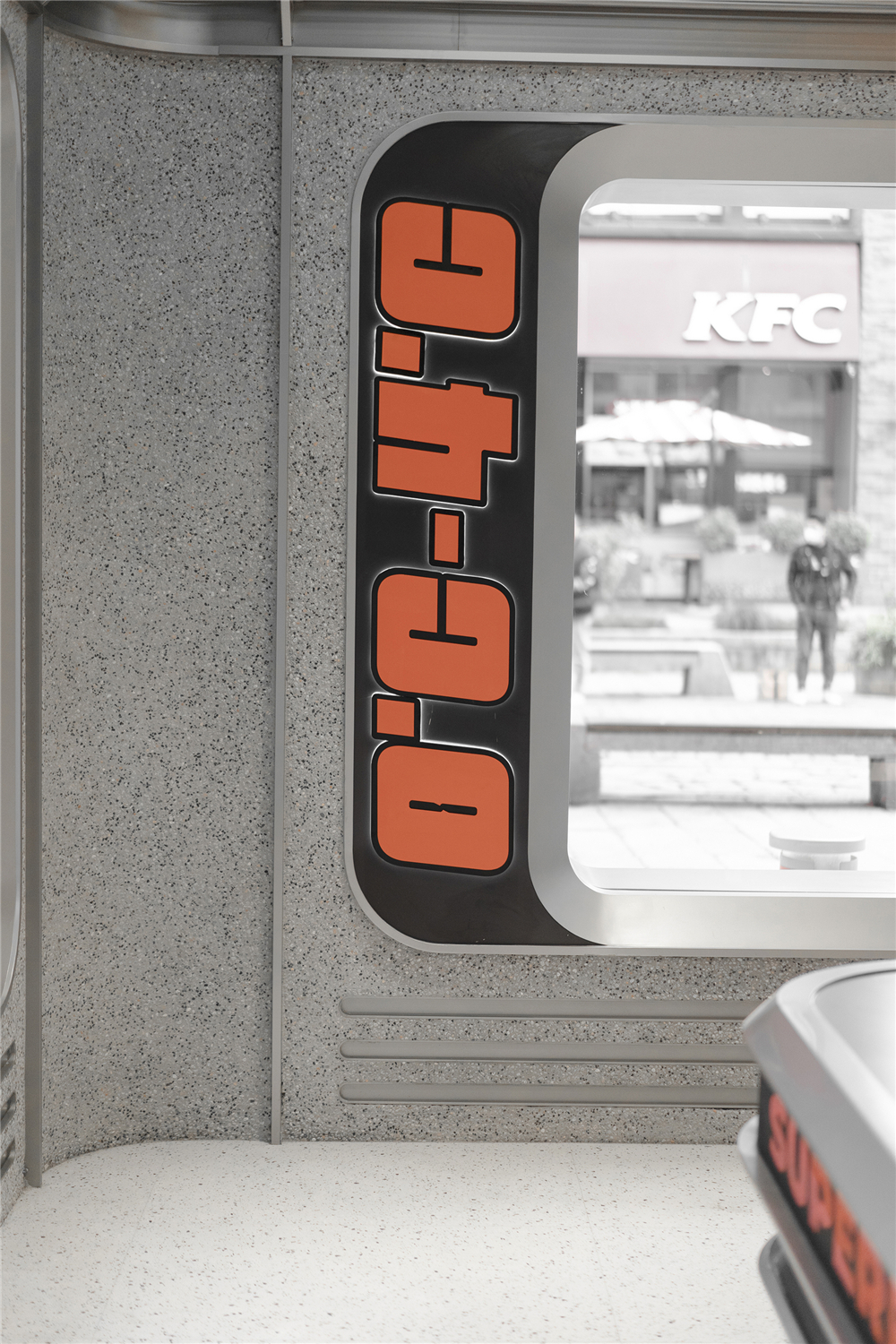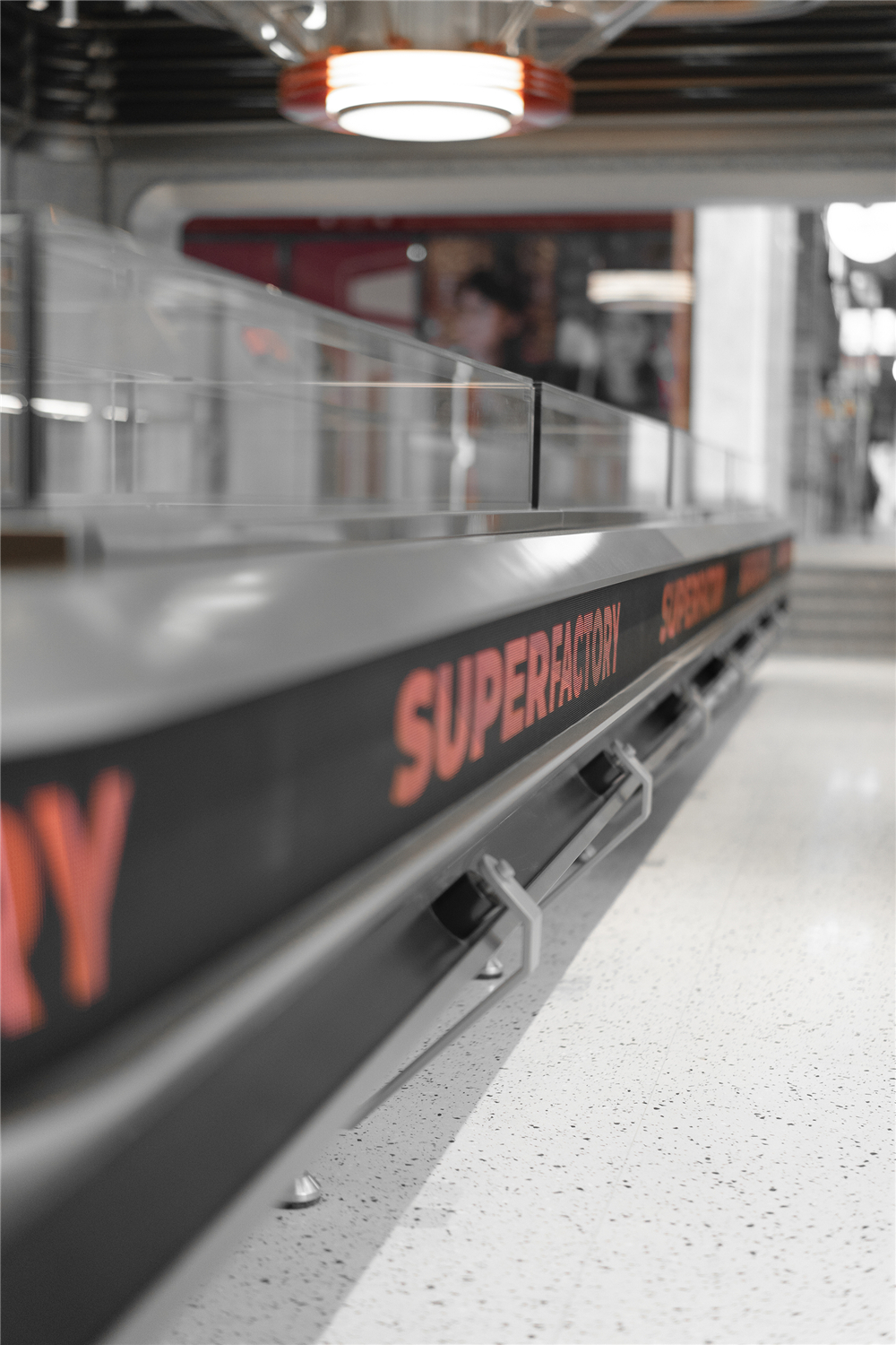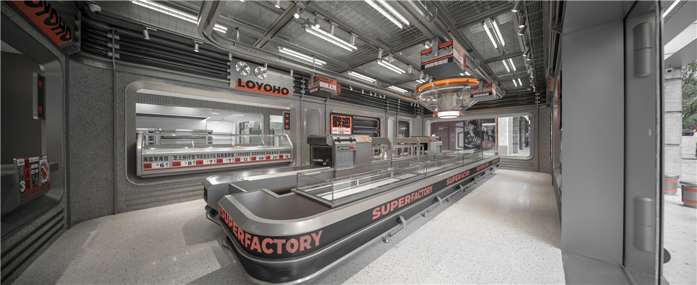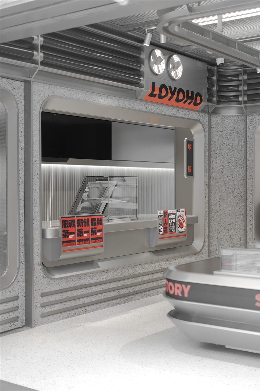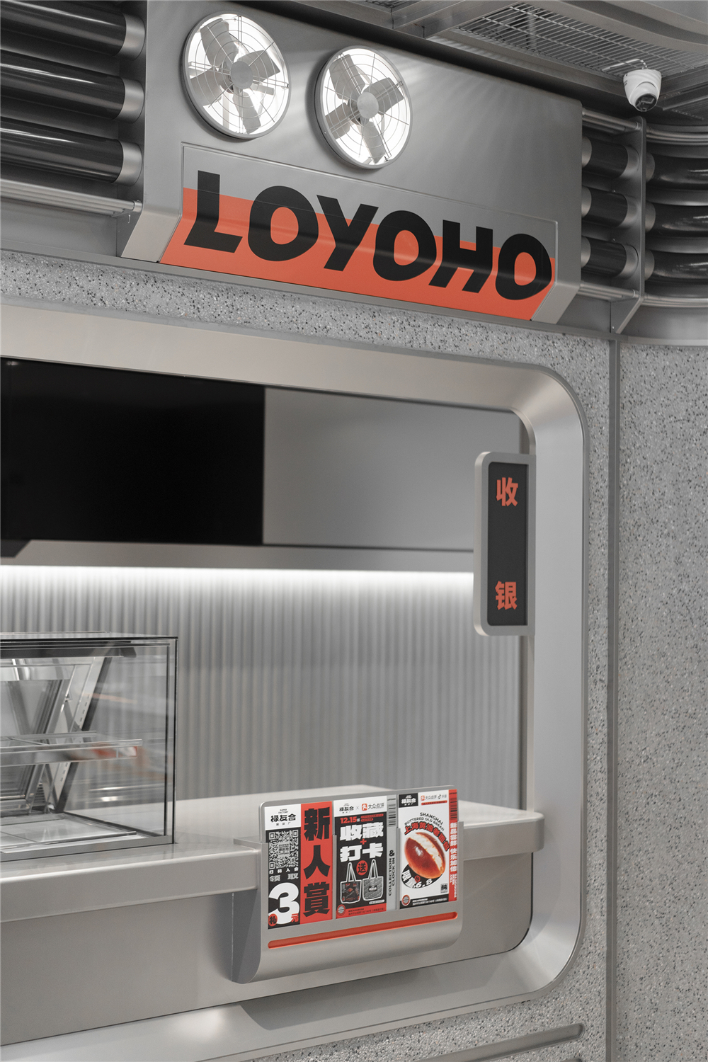 进入到室内空间,一个巨大的“工业环”是空间中的核心。机械感的环形生产线,是制饼厂的生命线。也是产品展示,选购的载体。悬挂的漏斗形装置,像不断的在为生产输送原料。吊挂的运输线在循环往复地把生产好的产品输送到客人手中。一系列的结构设计,都是让客人可以沉浸于“制饼厂”的主题中。室内空间立面,均以不同尺度的窗口为结构,每一个窗口也有其特殊的功能,有展示产品,有售卖产品,有联通室内外景观,也有收银结账。有秩序的贯穿了空间各个功能模块。橙红色的品牌视觉延伸到空间的每一个触点,动态与静态相结合的多维展示方式为空间赋予了多彩的活力,同时也增加了产品信息展示和更多的信息表达途径。