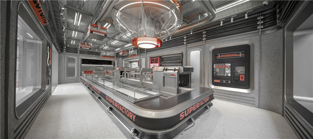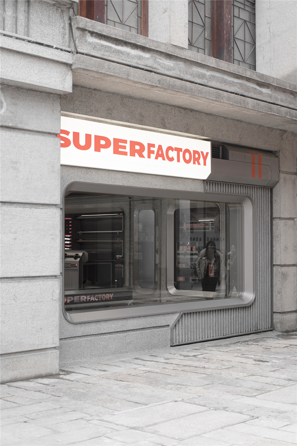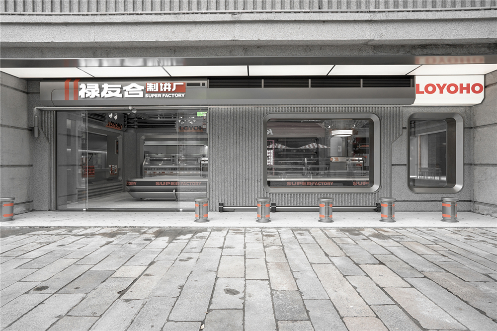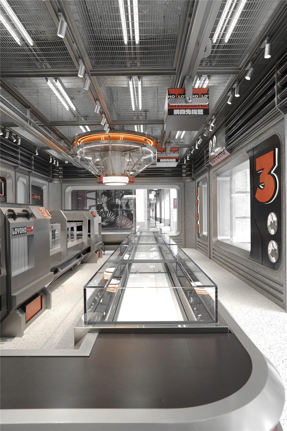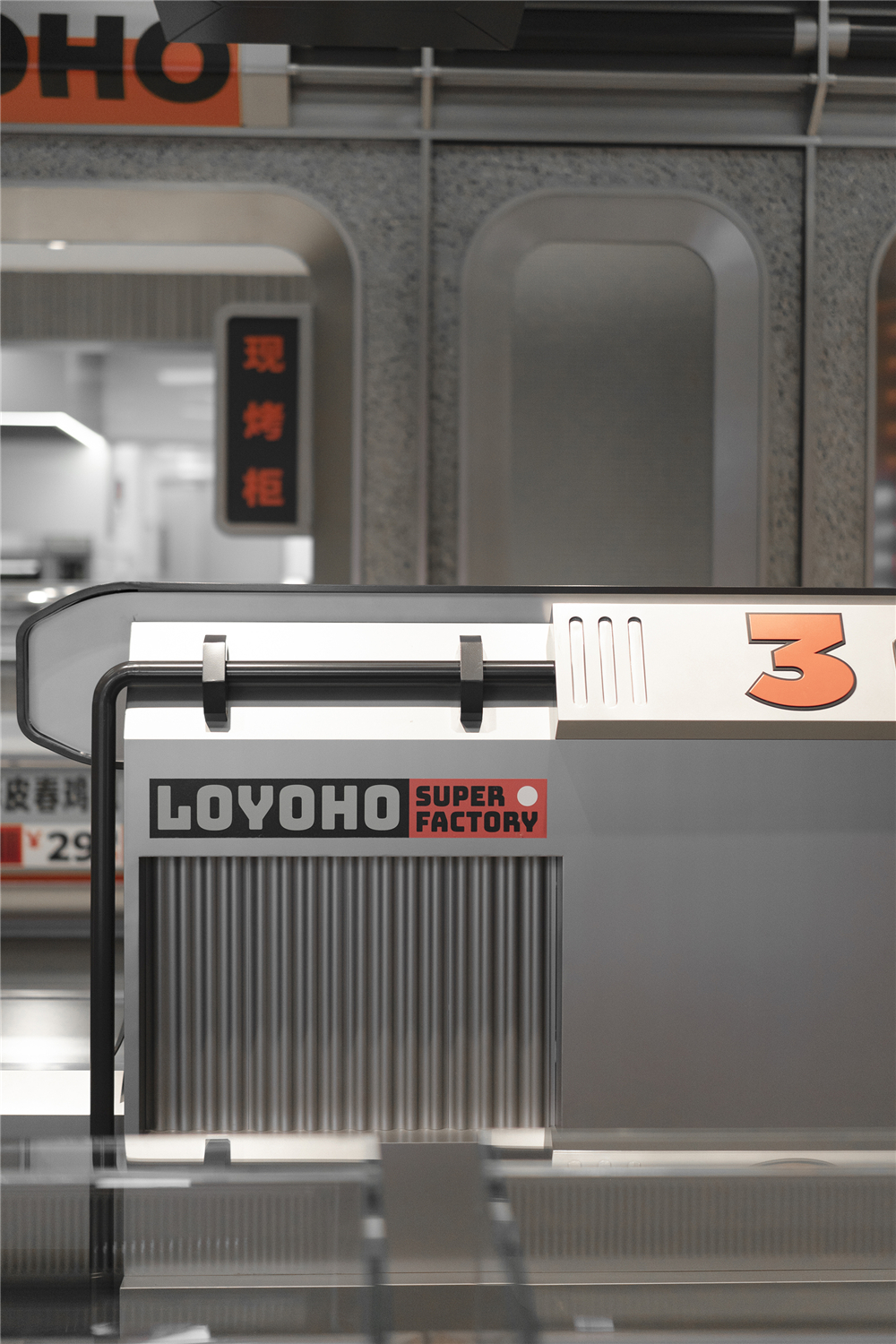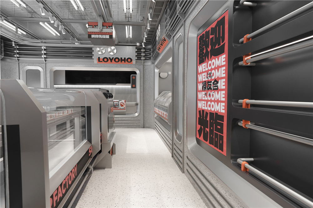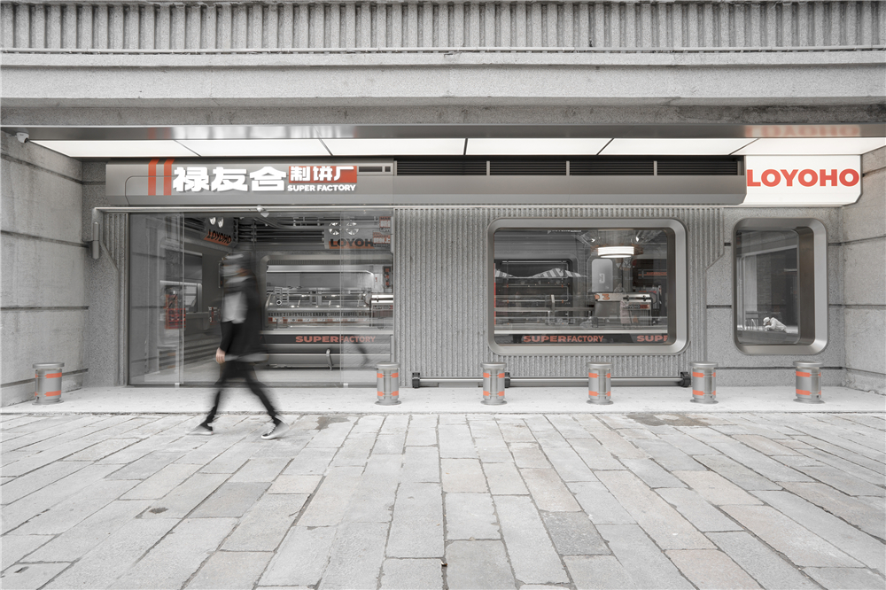 进入到室内空间,一个巨大的“工业环”是空间中的核心。机械感的环形生产线,是制饼厂的生命线。也是产品展示,选购的载体。悬挂的漏斗形装置,像不断的在为生产输送原料。吊挂的运输线在循环往复地把生产好的产品输送到客人手中。一系列的结构设计,都是让客人可以沉浸于“制饼厂”的主题中。室内空间立面,均以不同尺度的窗口为结构,每一个窗口也有其特殊的功能,有展示产品,有售卖产品,有联通室内外景观,也有收银结账。有秩序的贯穿了空间各个功能模块。橙红色的品牌视觉延伸到空间的每一个触点,动态与静态相结合的多维展示方式为空间赋予了多彩的活力,同时也增加了产品信息展示和更多的信息表达途径。