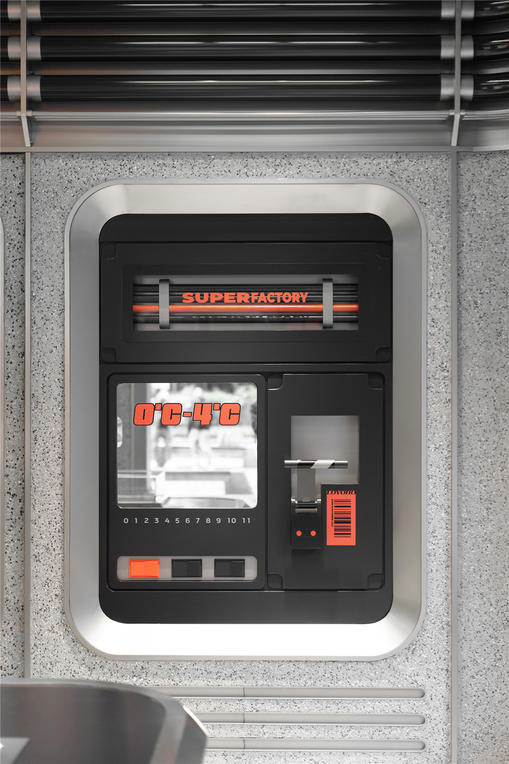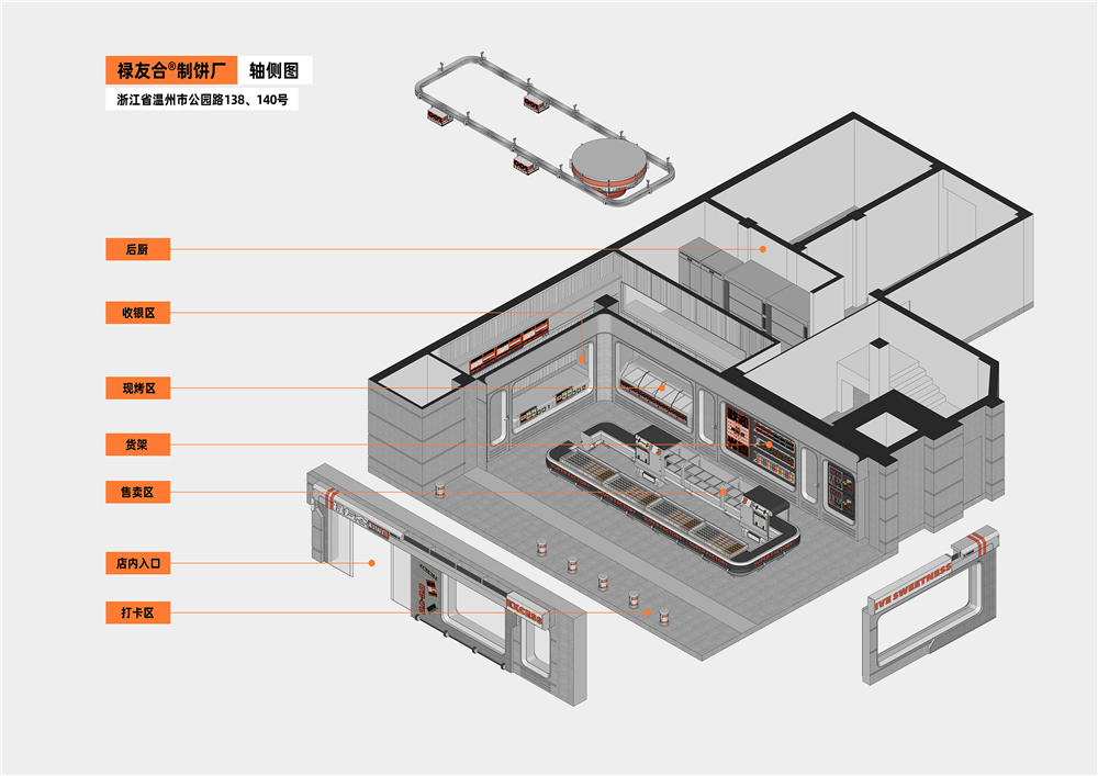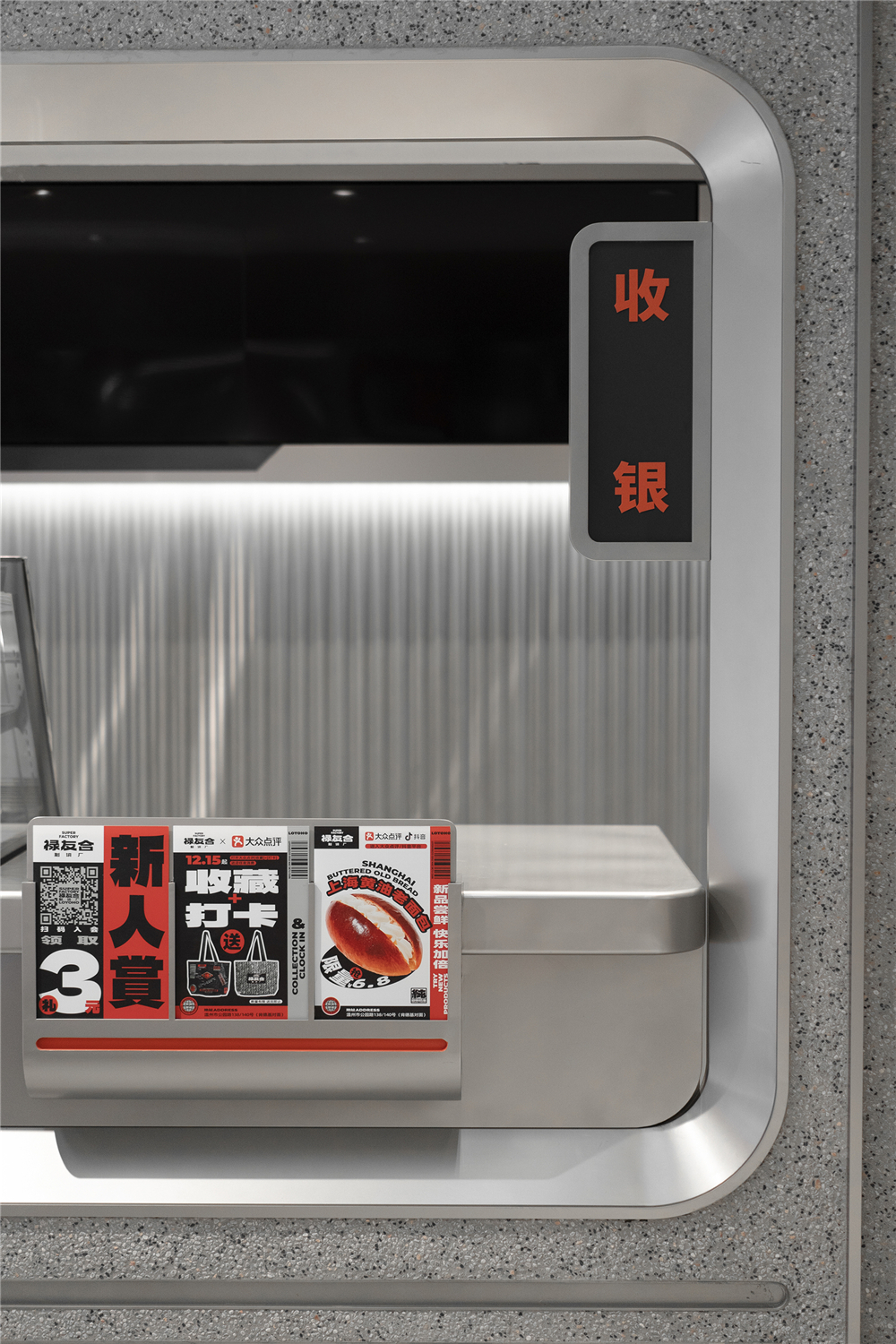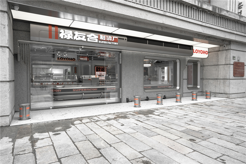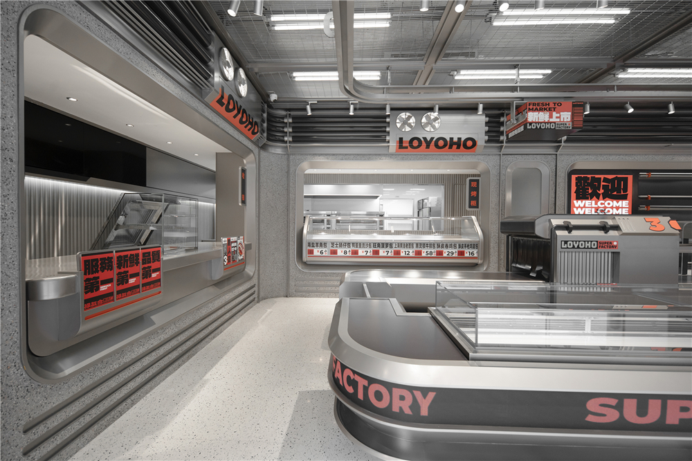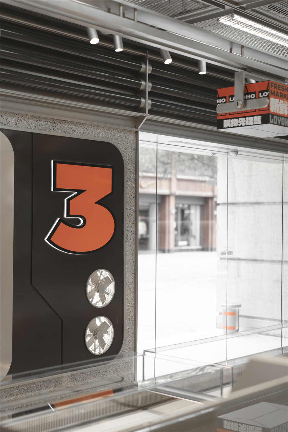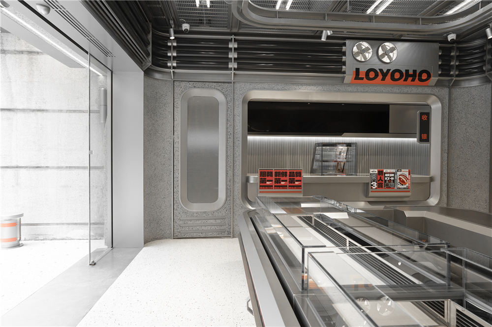 进入到室内空间,一个巨大的“工业环”是空间中的核心。机械感的环形生产线,是制饼厂的生命线。也是产品展示,选购的载体。悬挂的漏斗形装置,像不断的在为生产输送原料。吊挂的运输线在循环往复地把生产好的产品输送到客人手中。一系列的结构设计,都是让客人可以沉浸于“制饼厂”的主题中。室内空间立面,均以不同尺度的窗口为结构,每一个窗口也有其特殊的功能,有展示产品,有售卖产品,有联通室内外景观,也有收银结账。有秩序的贯穿了空间各个功能模块。橙红色的品牌视觉延伸到空间的每一个触点,动态与静态相结合的多维展示方式为空间赋予了多彩的活力,同时也增加了产品信息展示和更多的信息表达途径。