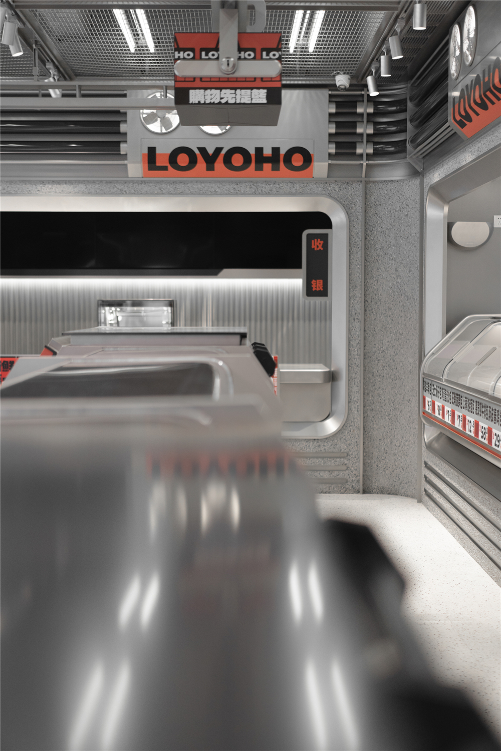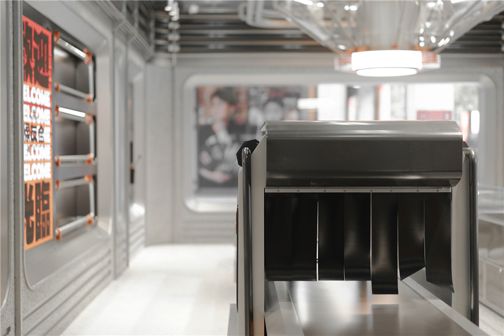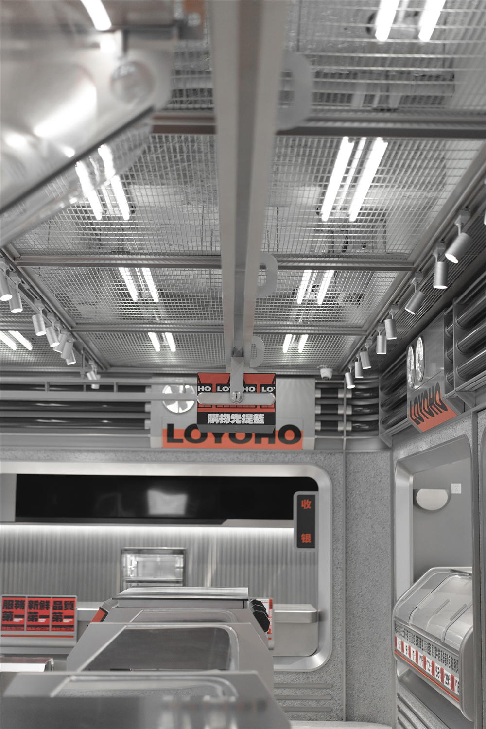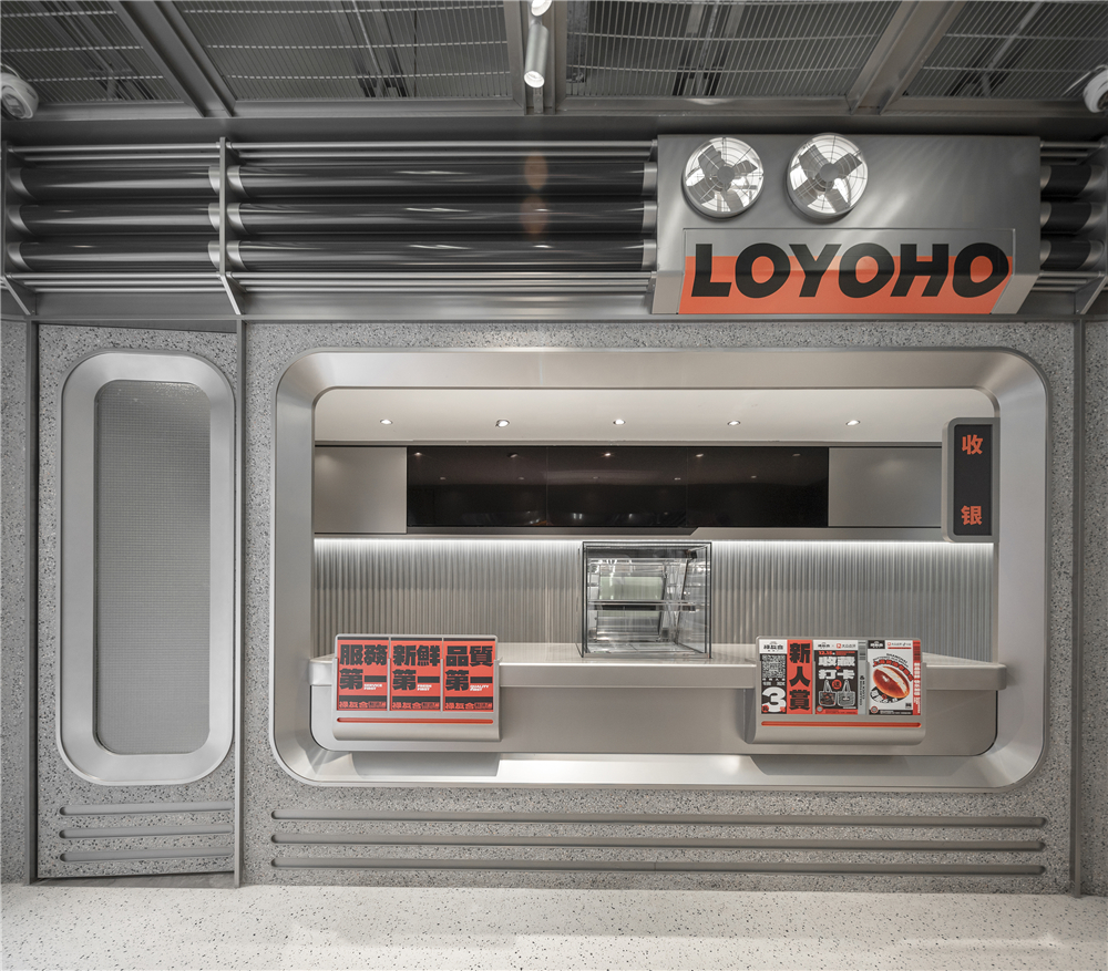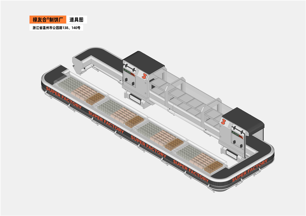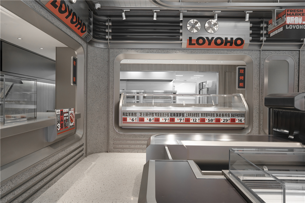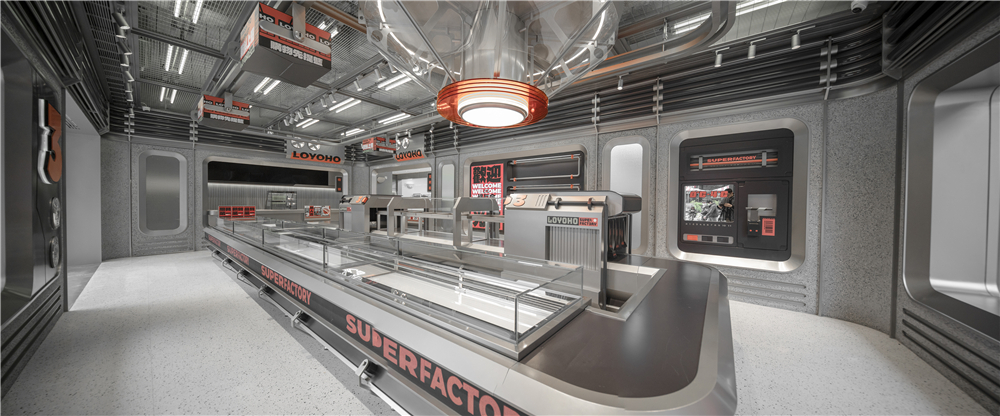 进入到室内空间,一个巨大的“工业环”是空间中的核心。机械感的环形生产线,是制饼厂的生命线。也是产品展示,选购的载体。悬挂的漏斗形装置,像不断的在为生产输送原料。吊挂的运输线在循环往复地把生产好的产品输送到客人手中。一系列的结构设计,都是让客人可以沉浸于“制饼厂”的主题中。室内空间立面,均以不同尺度的窗口为结构,每一个窗口也有其特殊的功能,有展示产品,有售卖产品,有联通室内外景观,也有收银结账。有秩序的贯穿了空间各个功能模块。橙红色的品牌视觉延伸到空间的每一个触点,动态与静态相结合的多维展示方式为空间赋予了多彩的活力,同时也增加了产品信息展示和更多的信息表达途径。