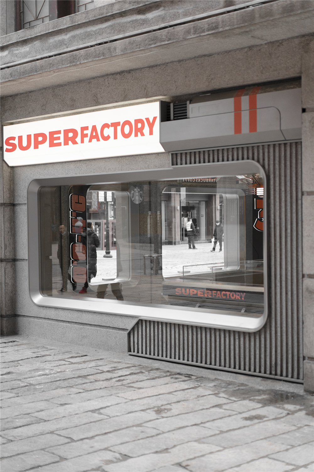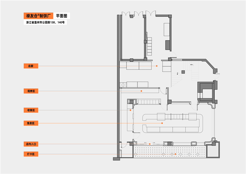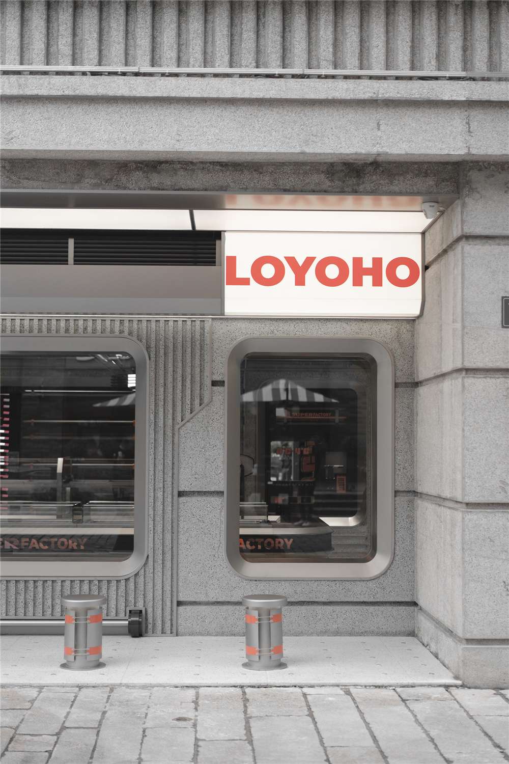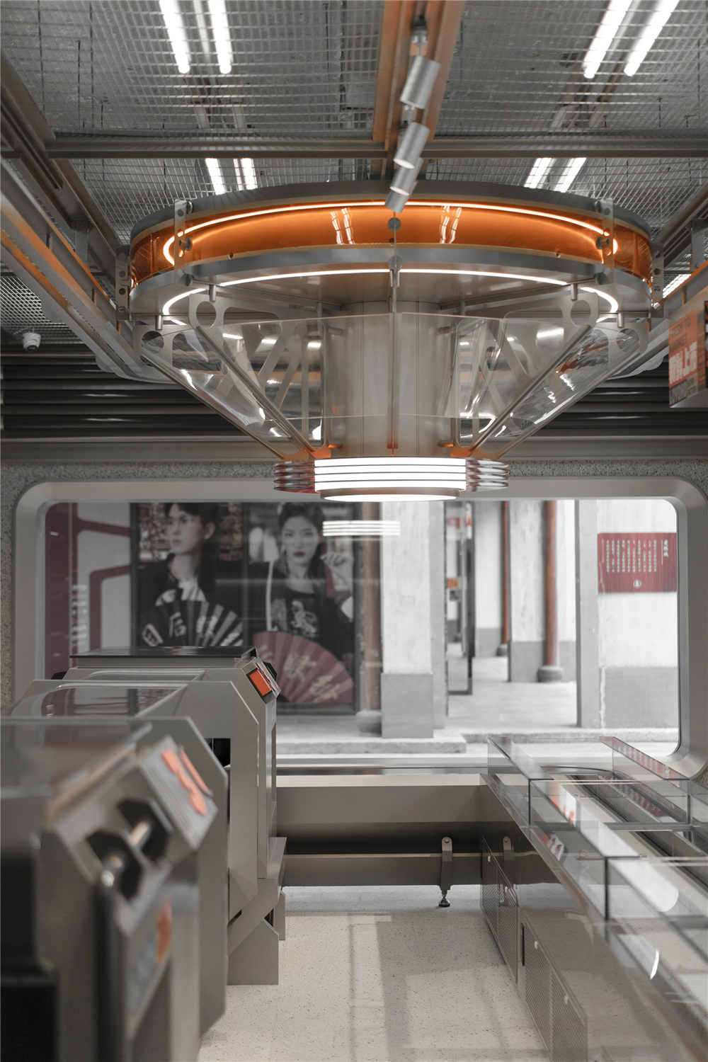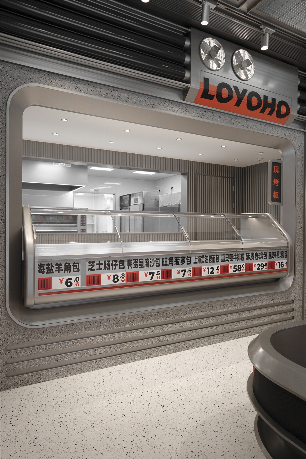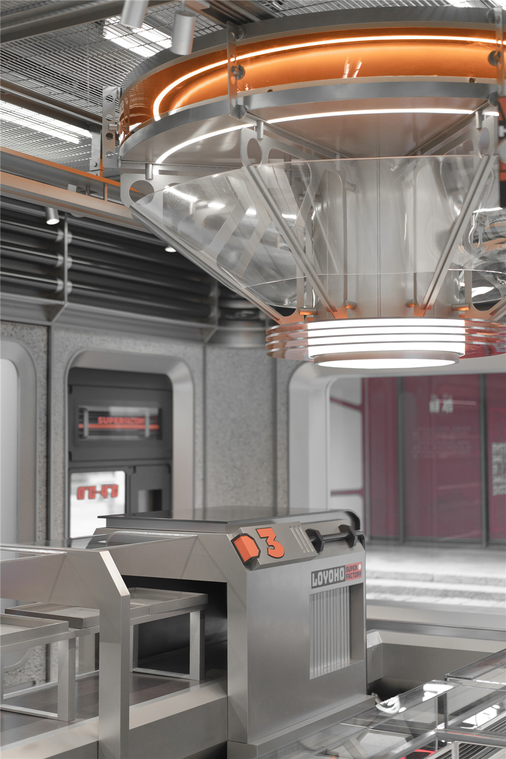 进入到室内空间,一个巨大的“工业环”是空间中的核心。机械感的环形生产线,是制饼厂的生命线。也是产品展示,选购的载体。悬挂的漏斗形装置,像不断的在为生产输送原料。吊挂的运输线在循环往复地把生产好的产品输送到客人手中。一系列的结构设计,都是让客人可以沉浸于“制饼厂”的主题中。室内空间立面,均以不同尺度的窗口为结构,每一个窗口也有其特殊的功能,有展示产品,有售卖产品,有联通室内外景观,也有收银结账。有秩序的贯穿了空间各个功能模块。橙红色的品牌视觉延伸到空间的每一个触点,动态与静态相结合的多维展示方式为空间赋予了多彩的活力,同时也增加了产品信息展示和更多的信息表达途径。