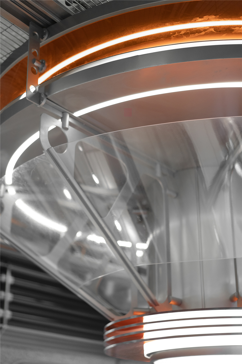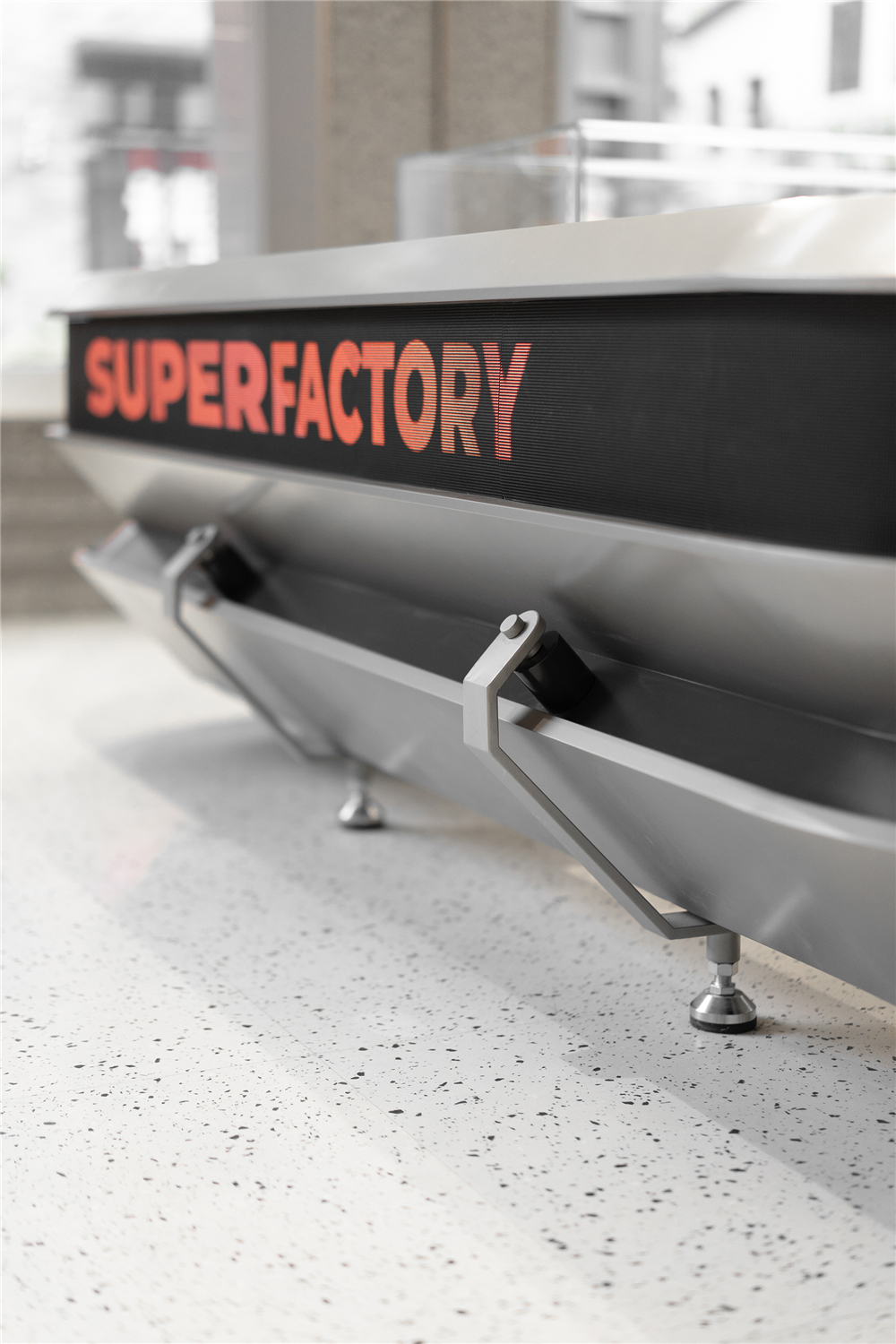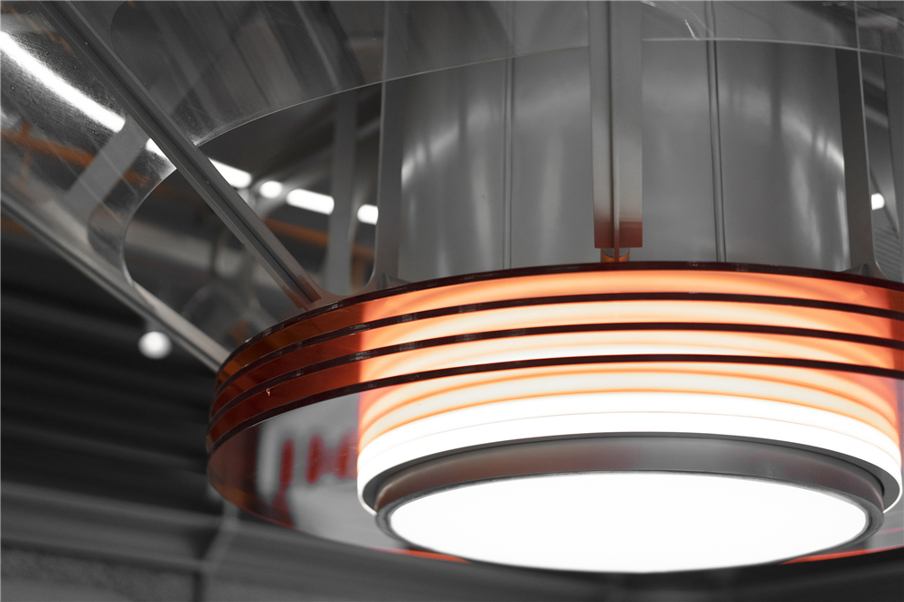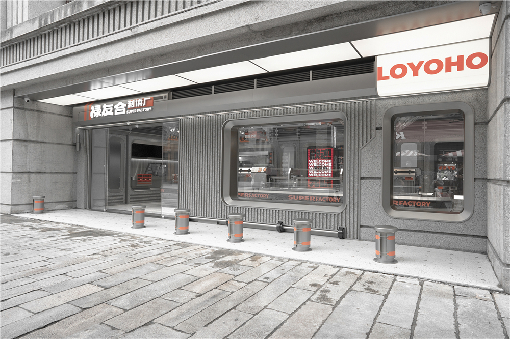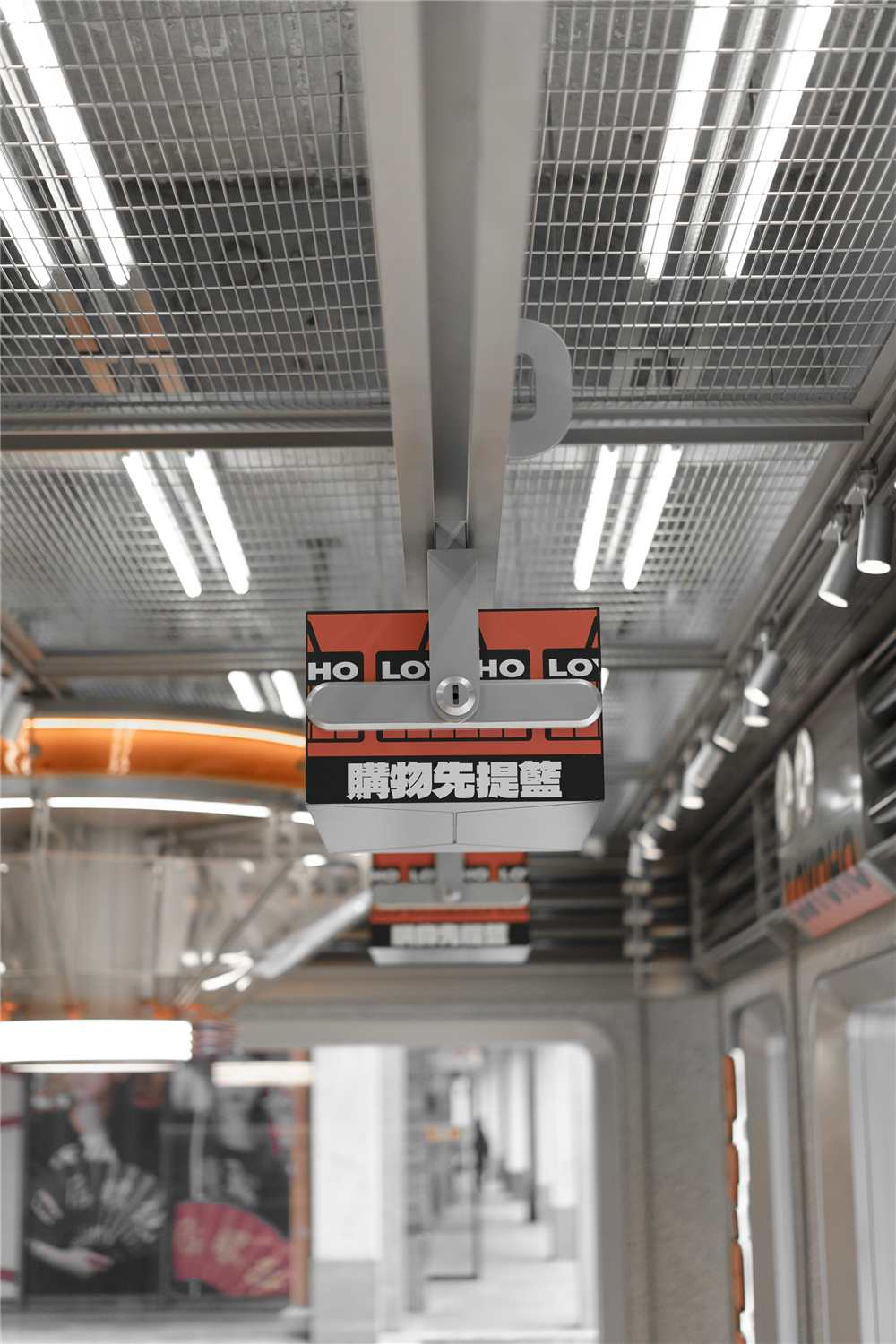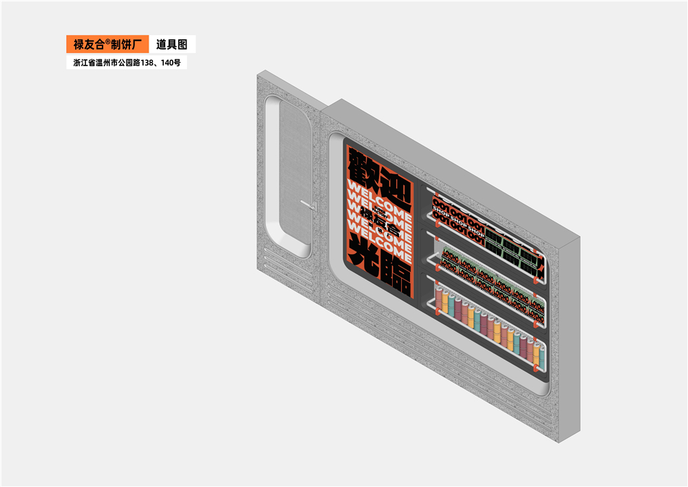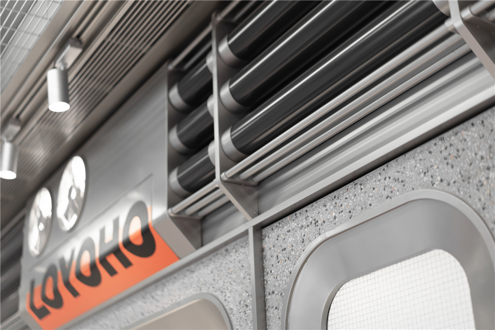 进入到室内空间,一个巨大的“工业环”是空间中的核心。机械感的环形生产线,是制饼厂的生命线。也是产品展示,选购的载体。悬挂的漏斗形装置,像不断的在为生产输送原料。吊挂的运输线在循环往复地把生产好的产品输送到客人手中。一系列的结构设计,都是让客人可以沉浸于“制饼厂”的主题中。室内空间立面,均以不同尺度的窗口为结构,每一个窗口也有其特殊的功能,有展示产品,有售卖产品,有联通室内外景观,也有收银结账。有秩序的贯穿了空间各个功能模块。橙红色的品牌视觉延伸到空间的每一个触点,动态与静态相结合的多维展示方式为空间赋予了多彩的活力,同时也增加了产品信息展示和更多的信息表达途径。