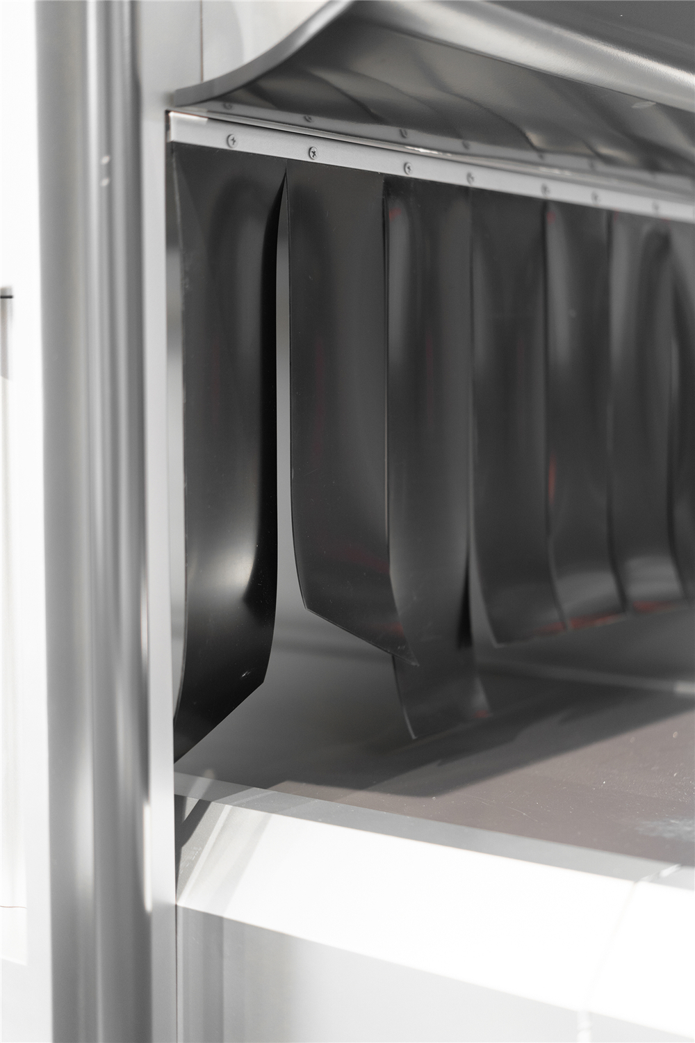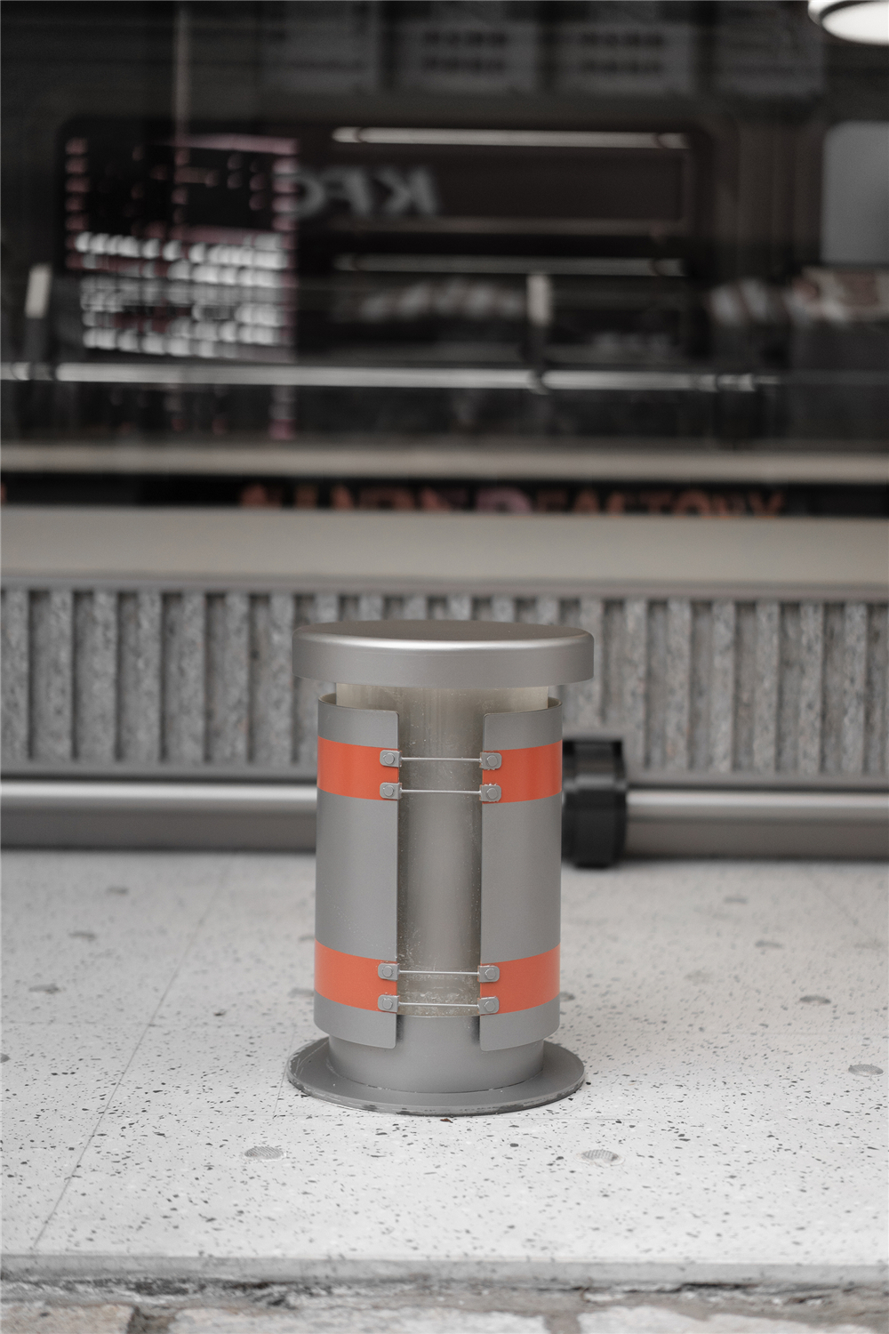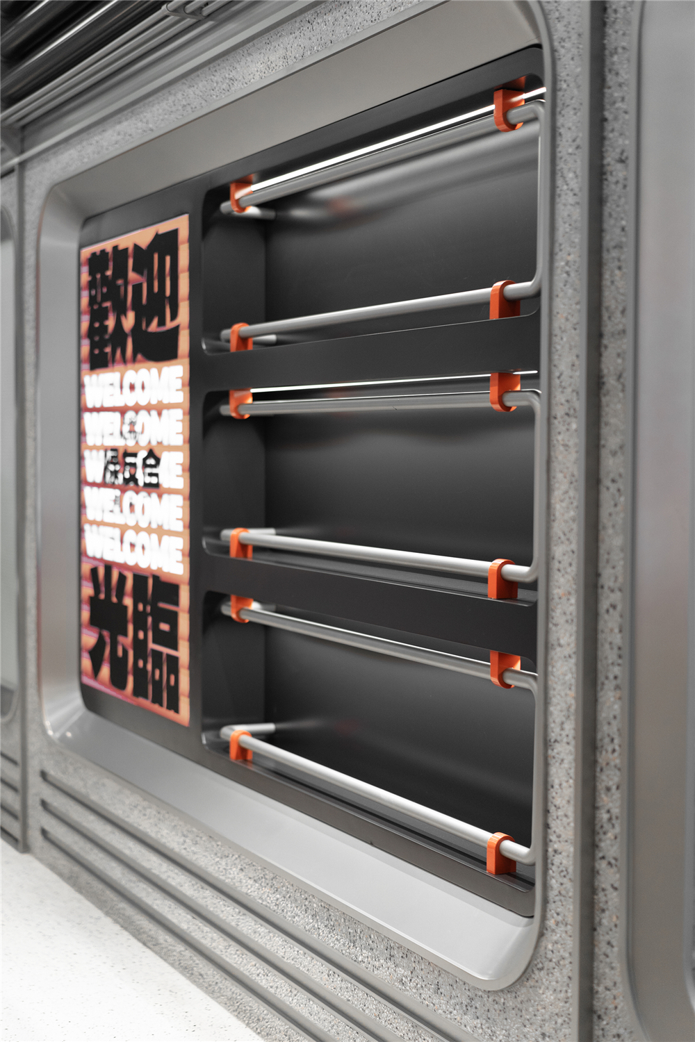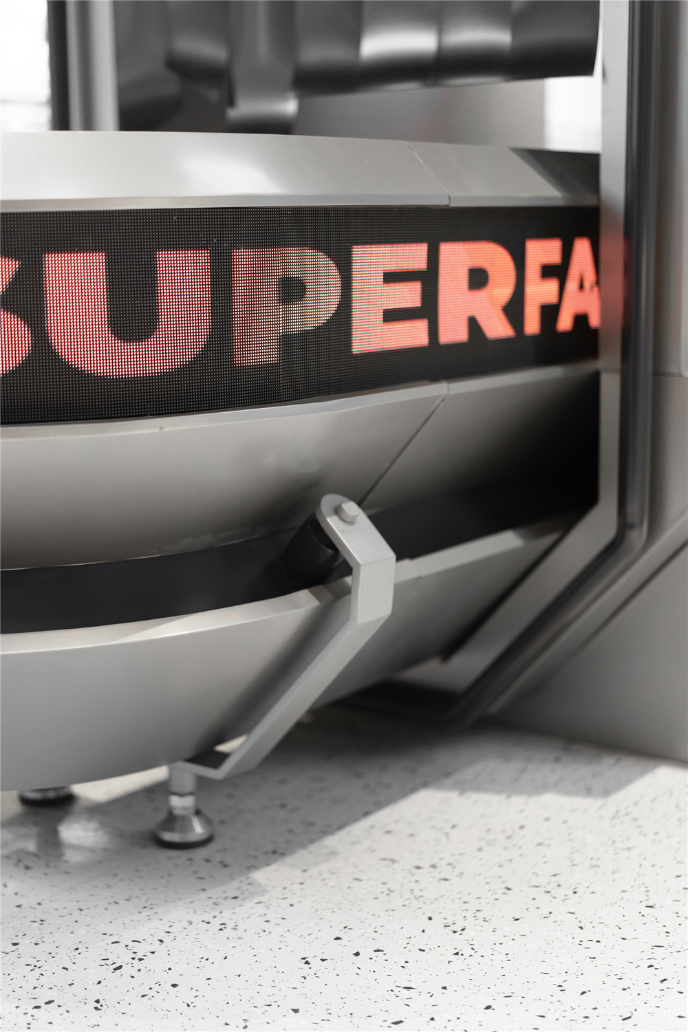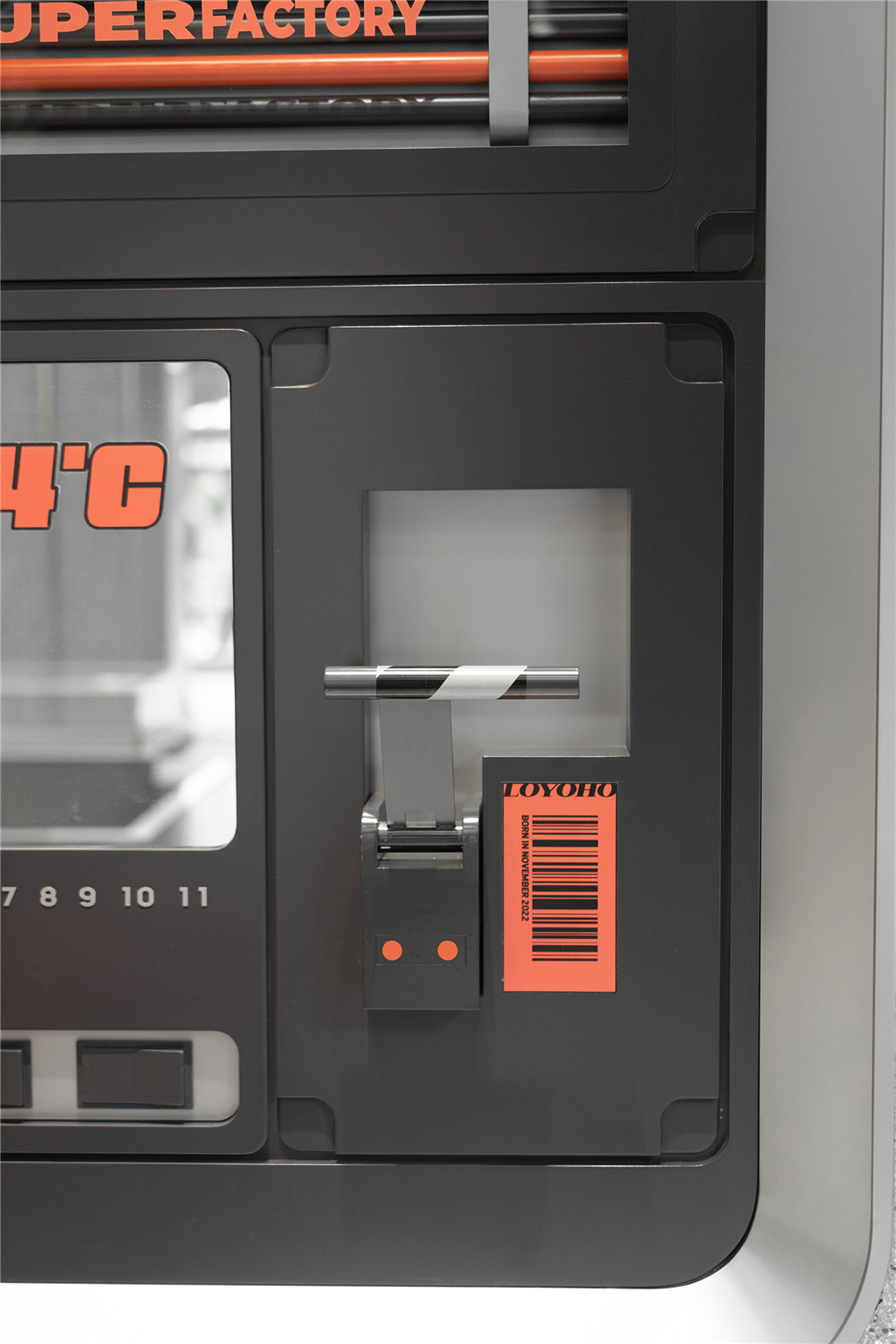 进入到室内空间,一个巨大的“工业环”是空间中的核心。机械感的环形生产线,是制饼厂的生命线。也是产品展示,选购的载体。悬挂的漏斗形装置,像不断的在为生产输送原料。吊挂的运输线在循环往复地把生产好的产品输送到客人手中。一系列的结构设计,都是让客人可以沉浸于“制饼厂”的主题中。室内空间立面,均以不同尺度的窗口为结构,每一个窗口也有其特殊的功能,有展示产品,有售卖产品,有联通室内外景观,也有收银结账。有秩序的贯穿了空间各个功能模块。橙红色的品牌视觉延伸到空间的每一个触点,动态与静态相结合的多维展示方式为空间赋予了多彩的活力,同时也增加了产品信息展示和更多的信息表达途径。