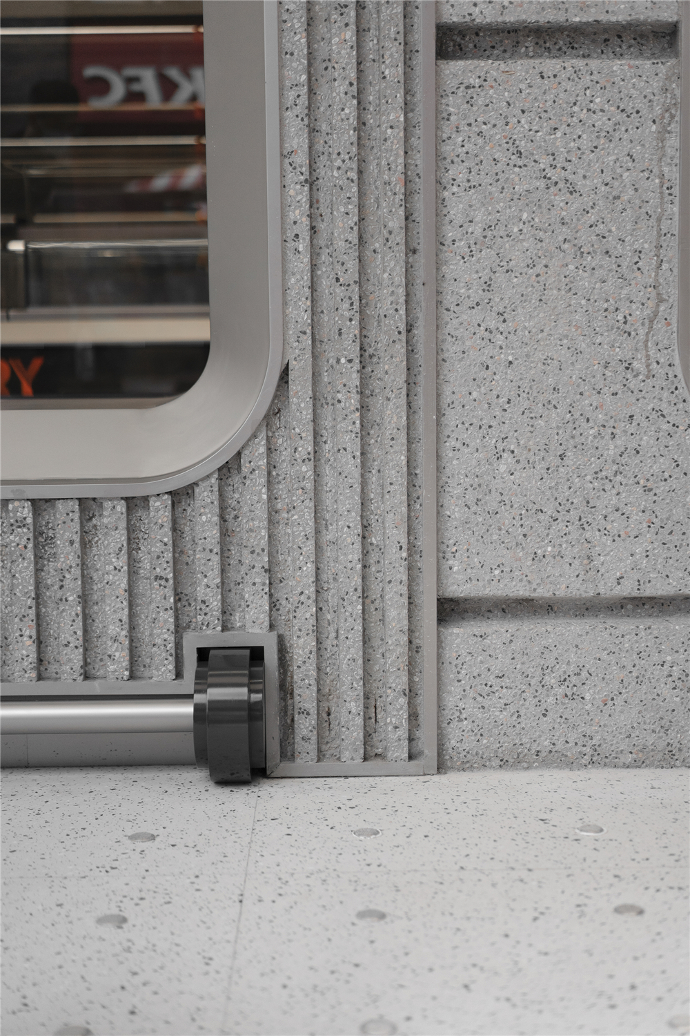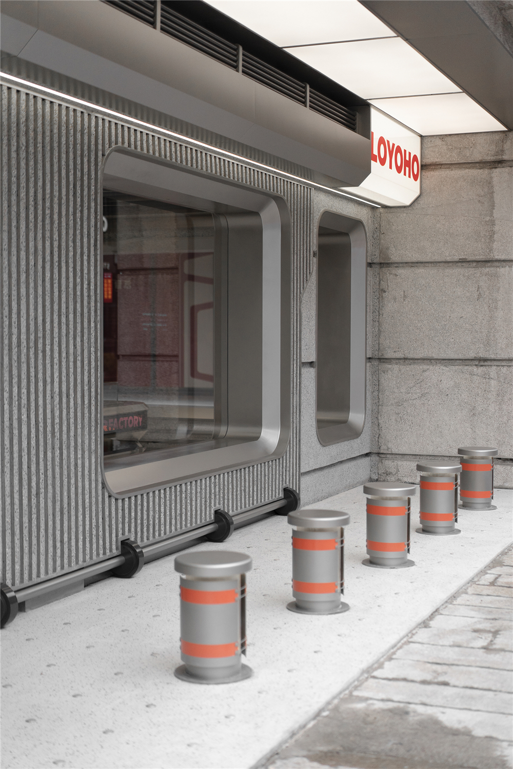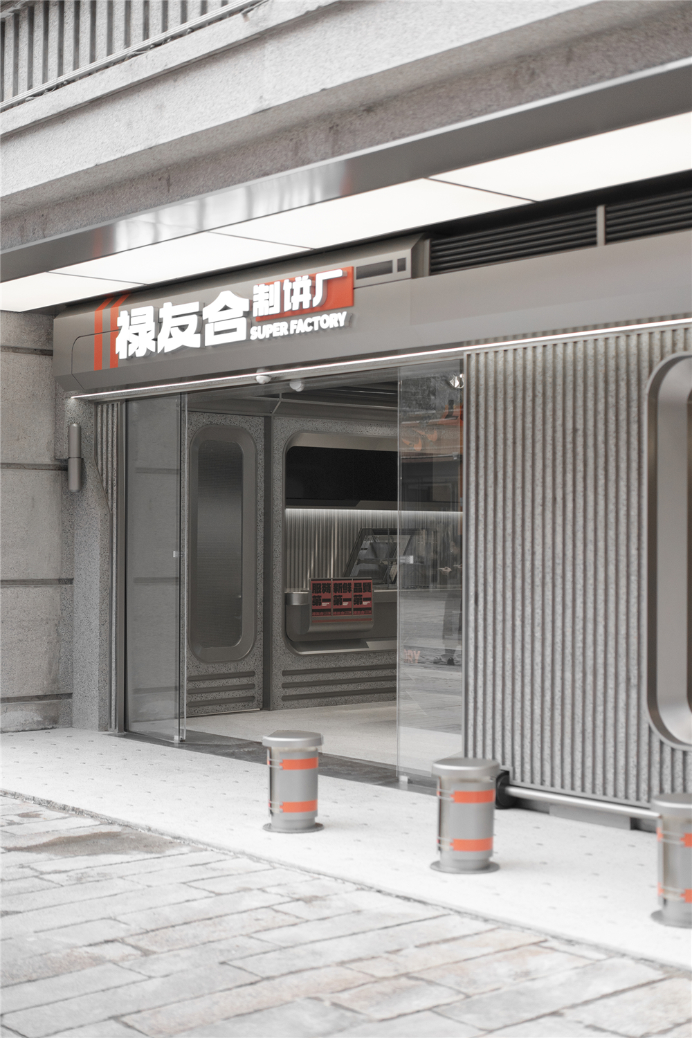 结合原建筑的材质肌理,我们把其厚重的质感保留且延续到我们新外立面设计中。在厚重的基础上加入了重工的机械结构,开始逐步工厂化。金属工业质感的门头,裸露的电缆结构链接发光灯箱,内推的设计能给客人预留下舒适的停留空间。新的设计不仅恰如奇妙的“自然融合”进老建筑的肌理中,更让老建筑焕发出年轻潮流的气息,也为室内空间的设计展开奠定了基调。