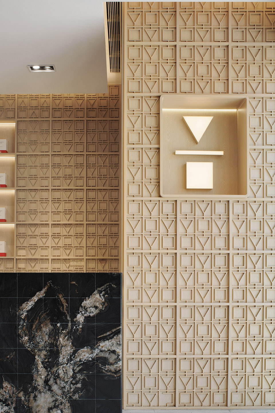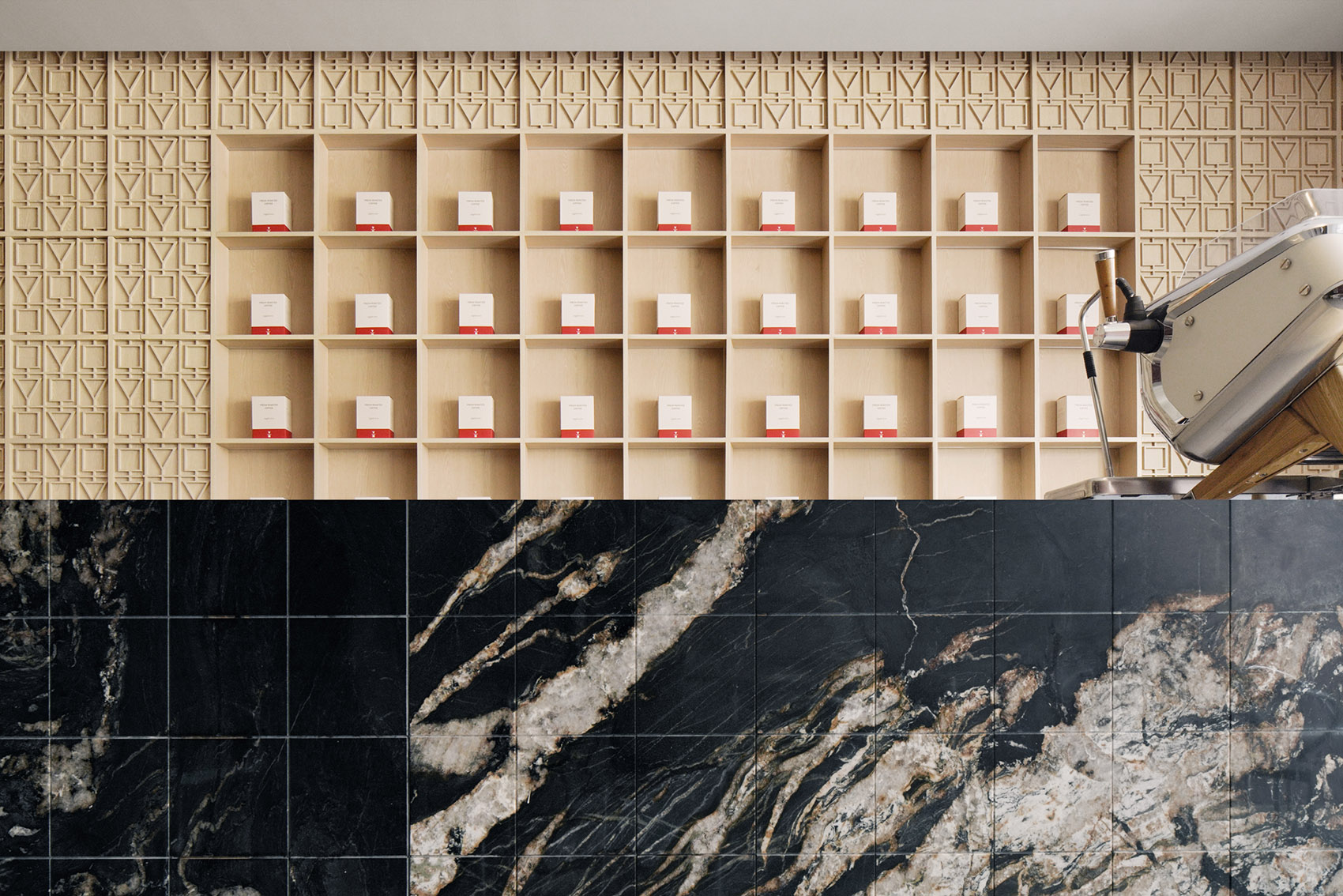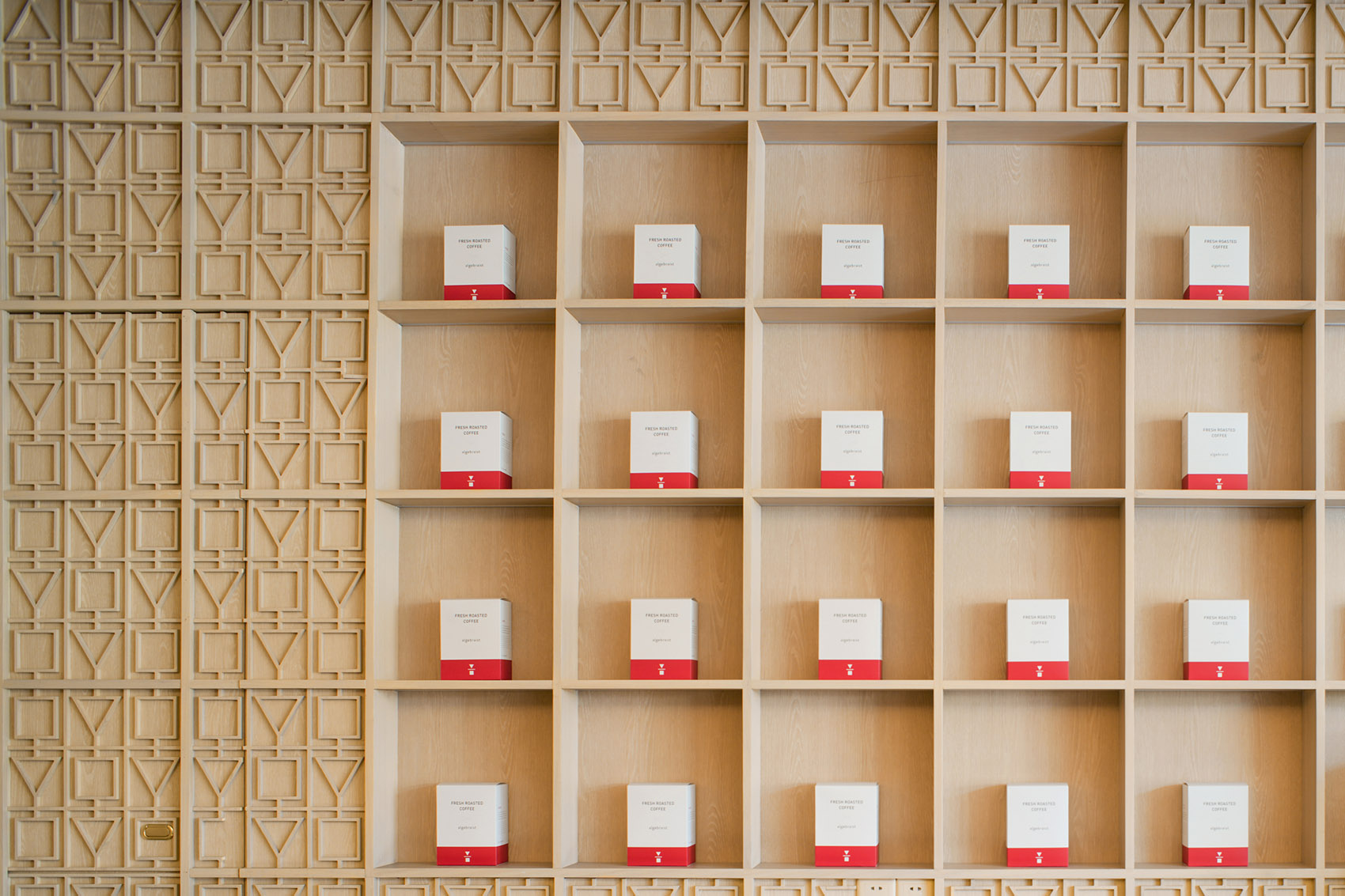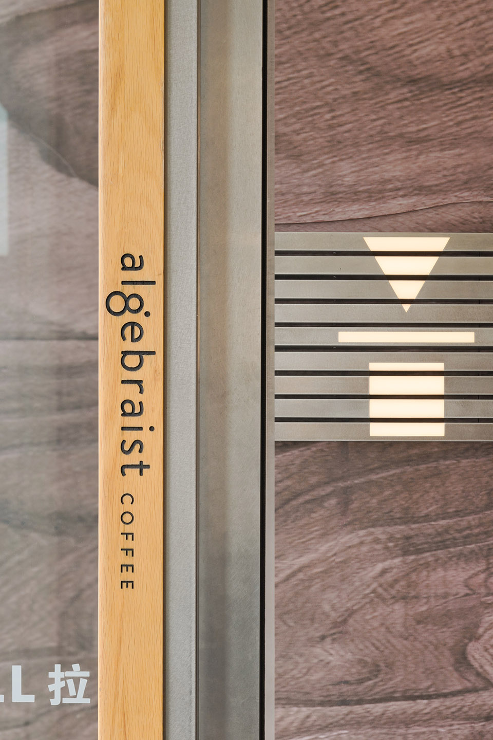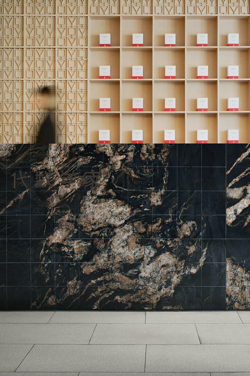 进入门店内部,设计团队使用模块重复和符号解构策略,该空间采用了不同的材料,具有各自的装饰风格与特点,木色的温暖与银白色的未来感在此交融。吧台区域以深色大理石片铺装,高3.2m的实木雕刻版以80x80cm呈矩阵式排列,这些模块质地细腻丰富,使空间富有层次感。阵列式模块化的设计也回应着algebraist代数学家品牌内涵中数学的元素,相印成趣。