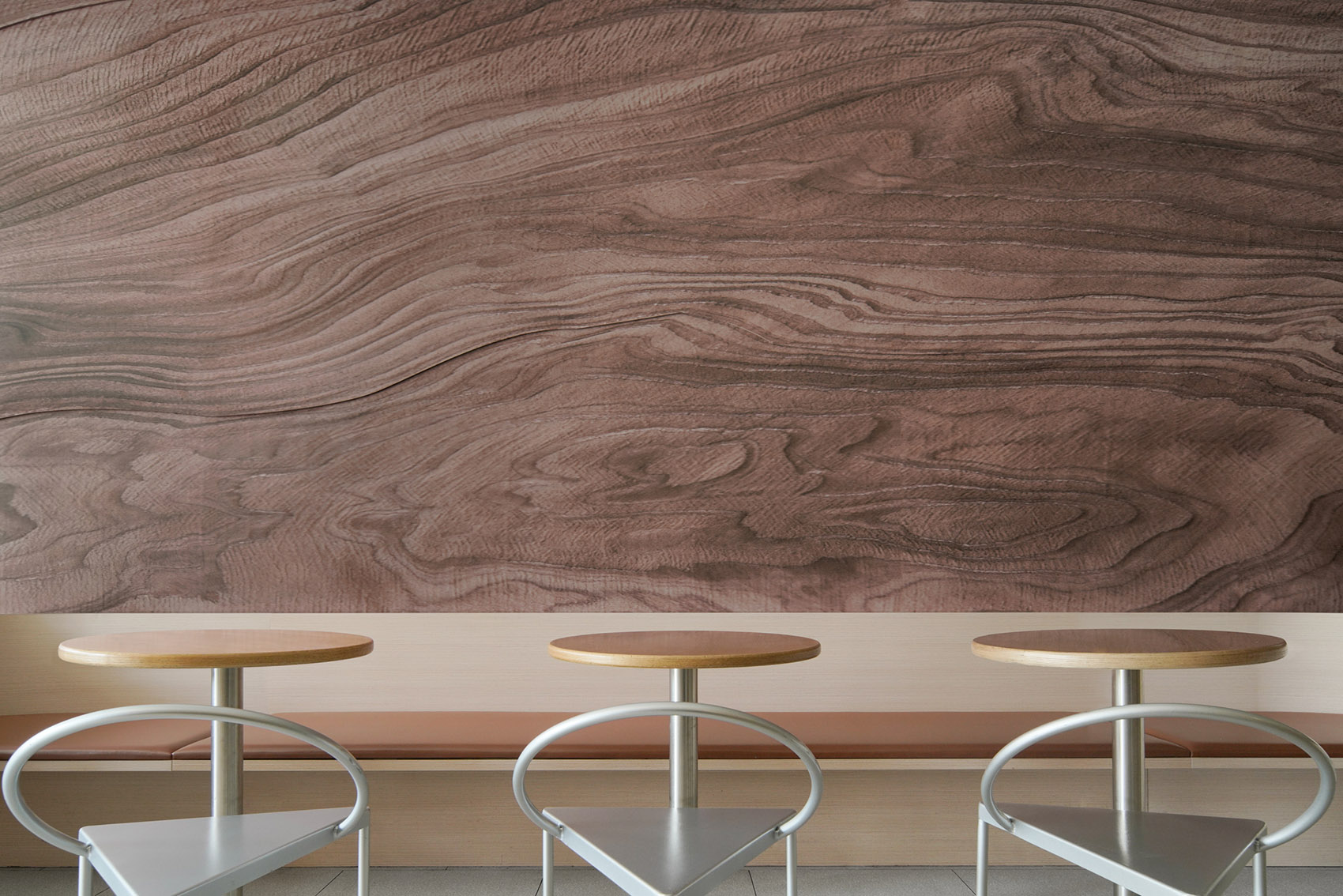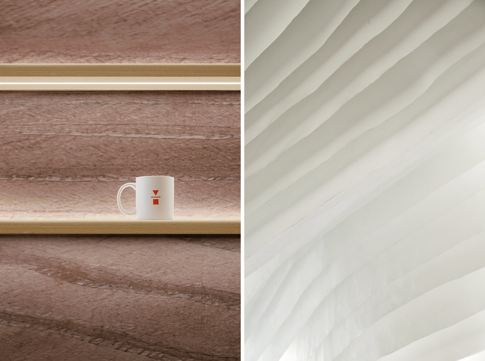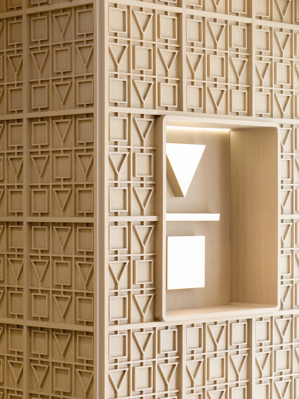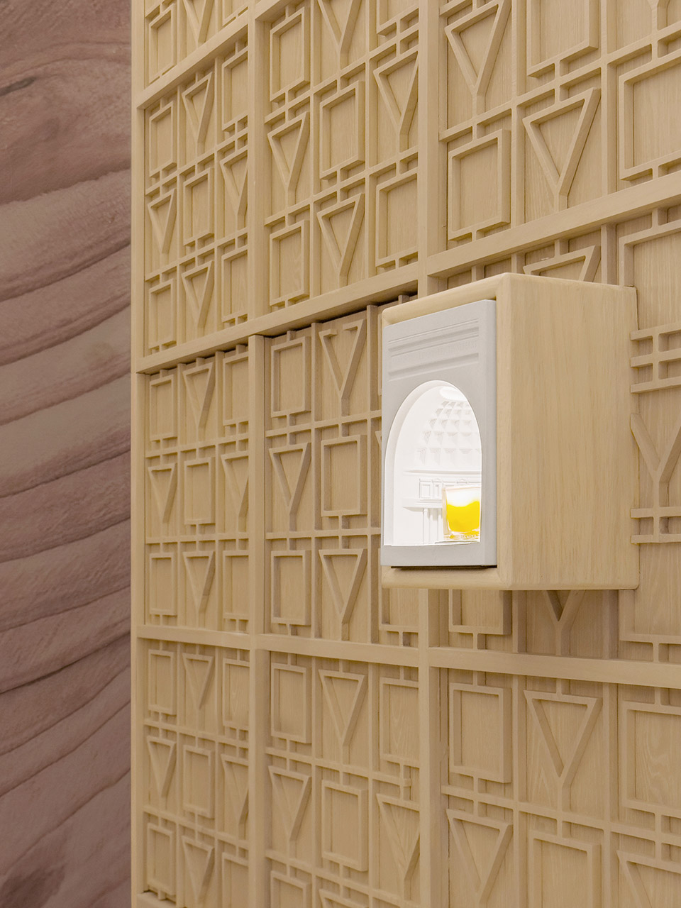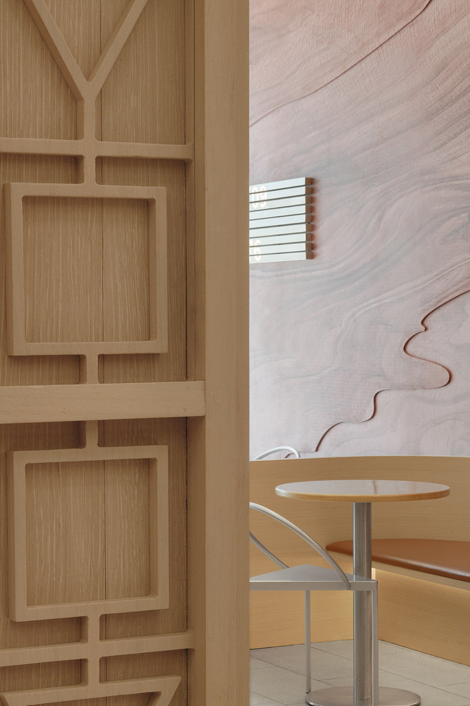 进入门店内部,设计团队使用模块重复和符号解构策略,该空间采用了不同的材料,具有各自的装饰风格与特点,木色的温暖与银白色的未来感在此交融。吧台区域以深色大理石片铺装,高3.2m的实木雕刻版以80x80cm呈矩阵式排列,这些模块质地细腻丰富,使空间富有层次感。阵列式模块化的设计也回应着algebraist代数学家品牌内涵中数学的元素,相印成趣。