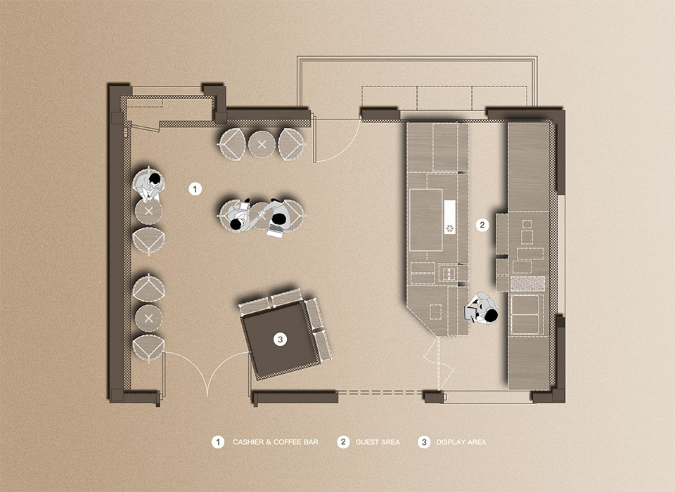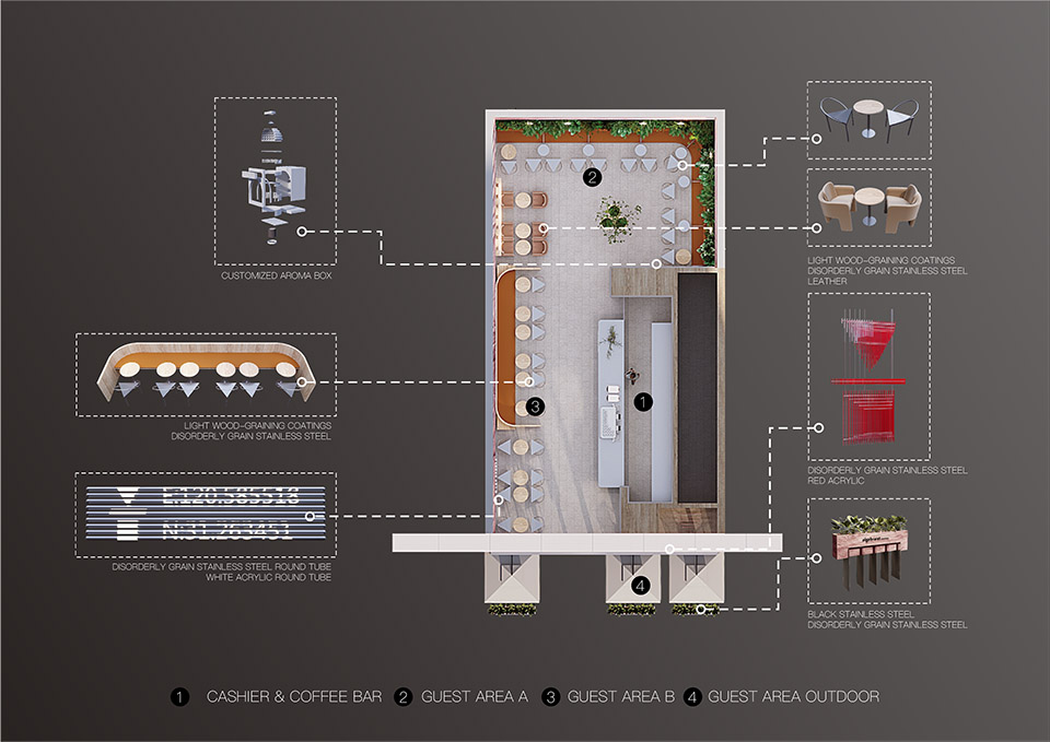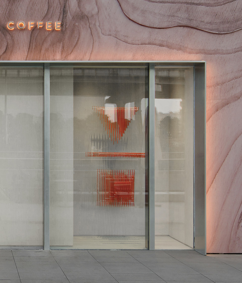 星城天地店位于主干道旁,是代数学家入驻长沙的首店。高达10米的门头成为视觉吸引的绝对亮点,最大程度上引发消费者的好奇心。设计提取咖啡文化中的特点,在材料应用上进行创新,外立面浮雕感纹路采用砂岩雕刻和彩绘进行3D打印,模拟咖啡的自然流动之感。