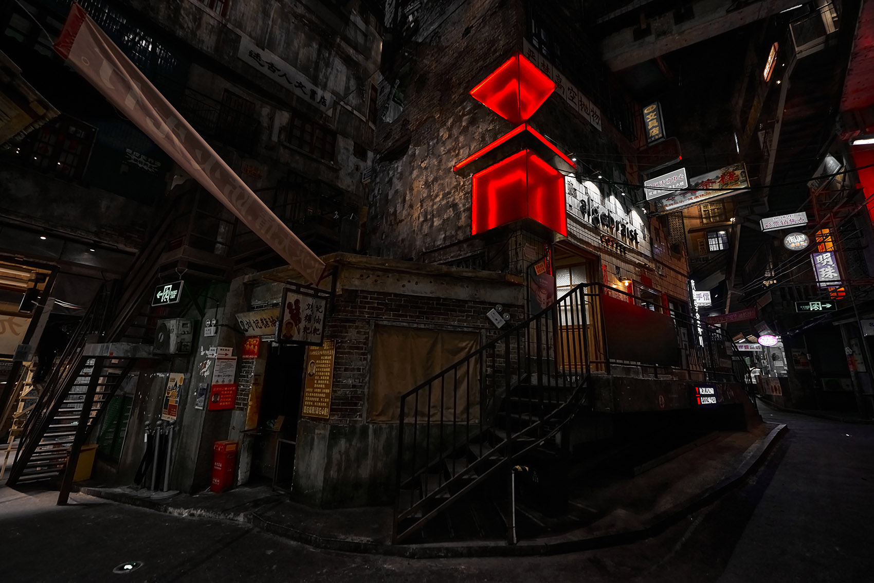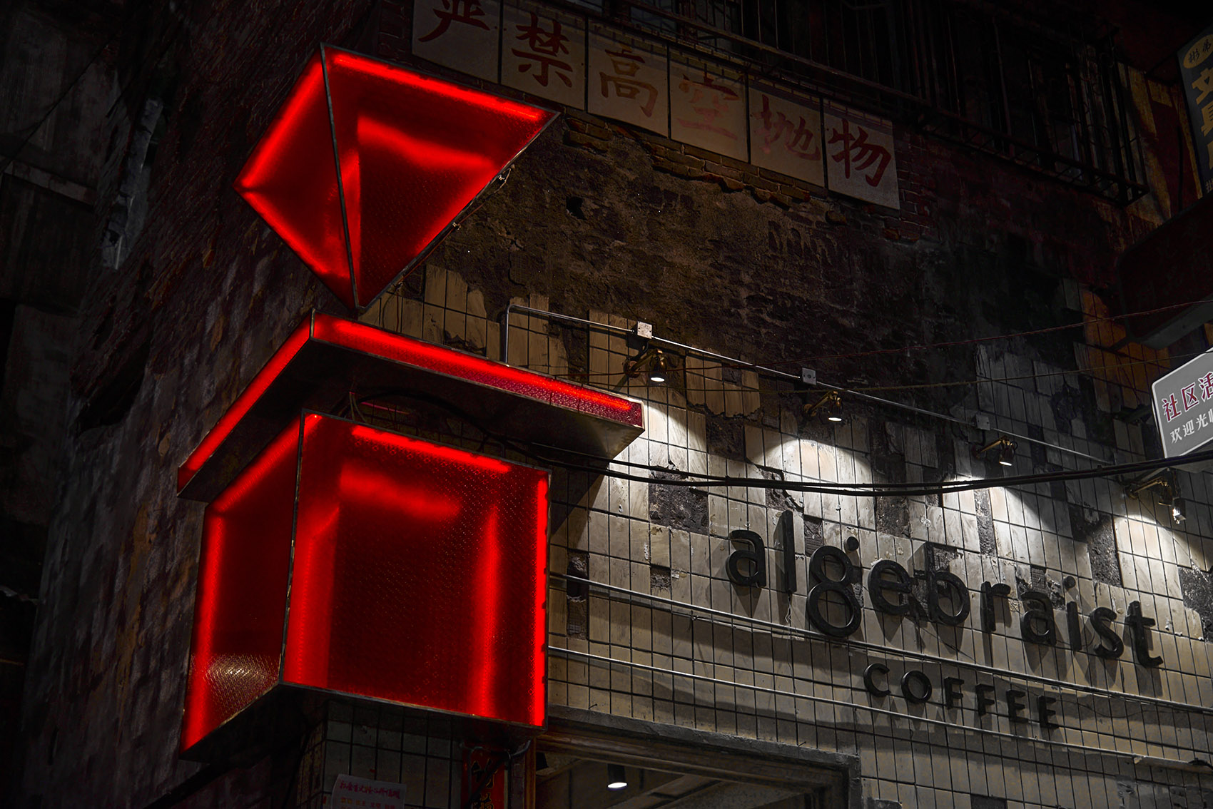 项目所在的超级文和友是长沙必打卡的多业态小型创意商业区,咖啡业态的引入适配了年轻人的生活品味和消费习惯。设计尊重场地环境,捕捉城市的脉络与肌理,在保留老长沙在地复古的氛围感同时,注入舶来品咖啡的精致感,与在地文化巧妙融合。瓷砖外立面上方,闪烁着红色霓虹的品牌Logo置入场景之中,与街区内其他灯牌形成视觉对冲,吸引着街道上熙攘人流的目光。