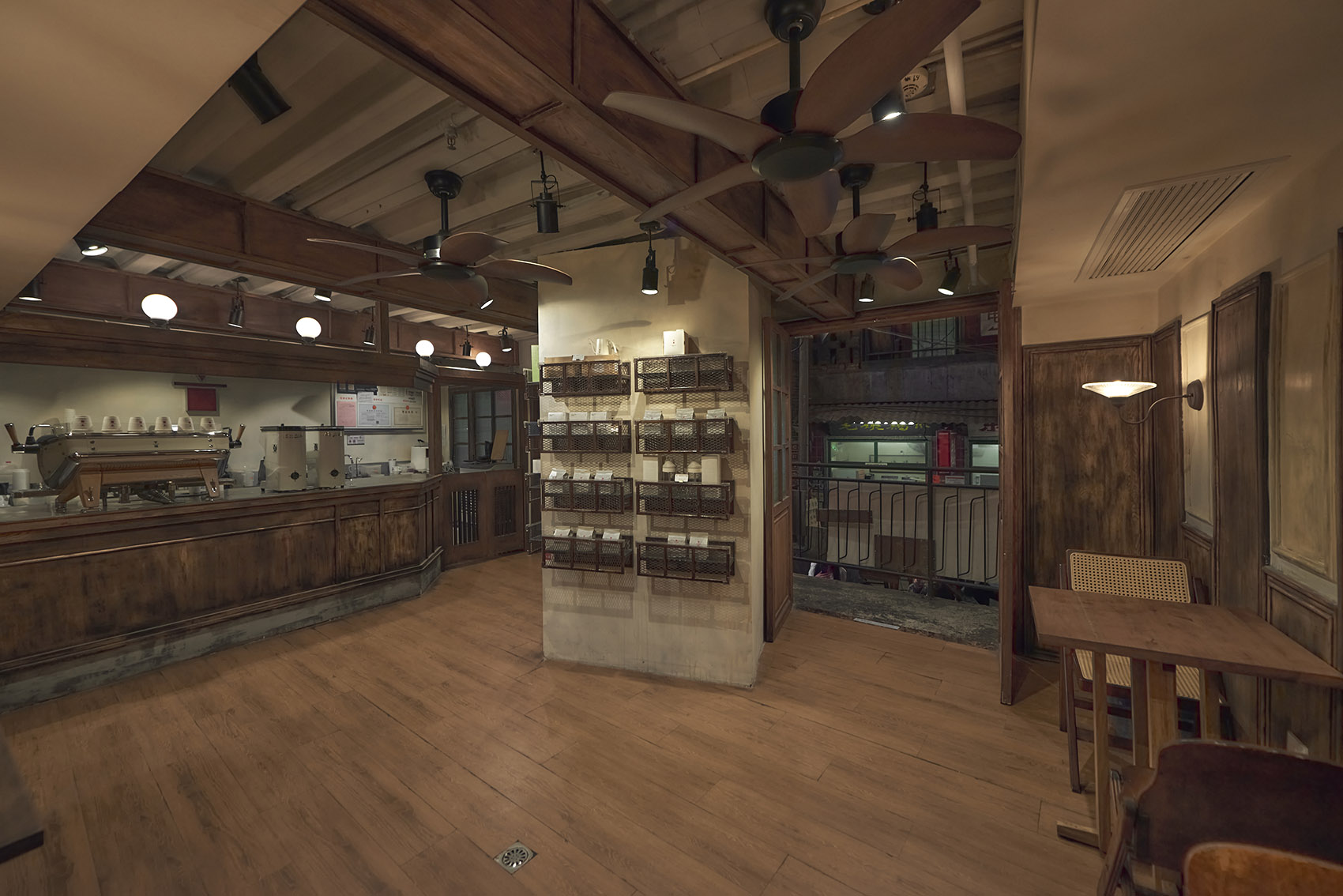 室内的打造以80年代Vintage复古元素为主题,昏暗的暖色调灯光,木质地板和窗门搭配怀旧风的吊扇,浓厚的氛围感引发消费者的情感共鸣。设计方和戏剧场景搭建的施工团队合作,店内的桌椅板凳道具都经过精挑细选,为往来打卡的游客编织一段电影般的叙事之旅。在这个低矮的空间中,与三两好友闲坐,回溯老长沙街区灯火阑珊的历史感,品尝一口幸福时尚的咖啡味,慢下来感受岁月静好的感觉。设计将空间与消费体验融合,在这个有机更新的场地中传递温情的力量。