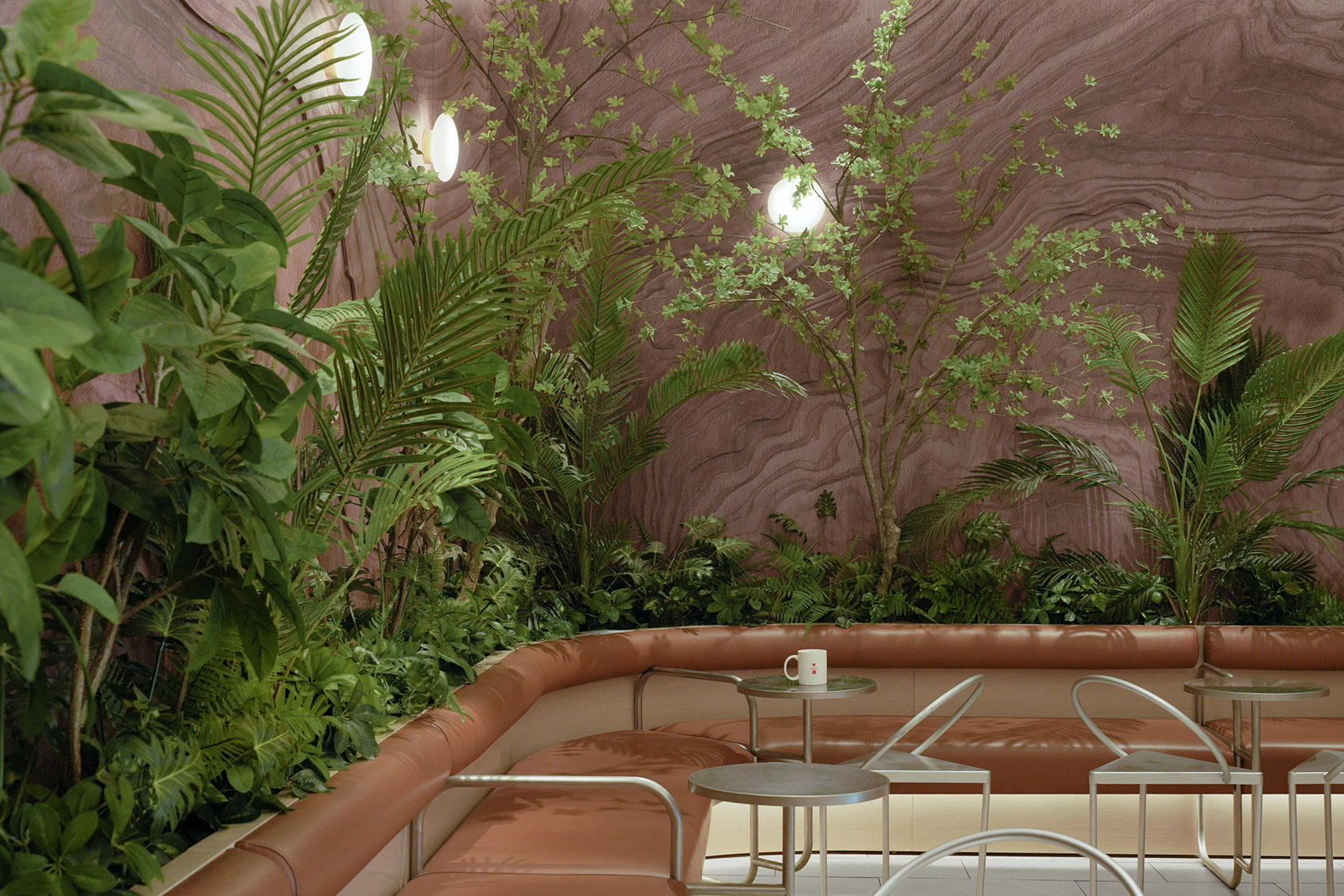设计上杜绝硬朗,以自然的流线贯穿始终。深色墙面延续外立面的设计语言,天花层层铺叠,呈现咖啡澳白的流动感,曲线型的桌面座椅搭配素雅绿植,赋予空间清新温暖的氛围。