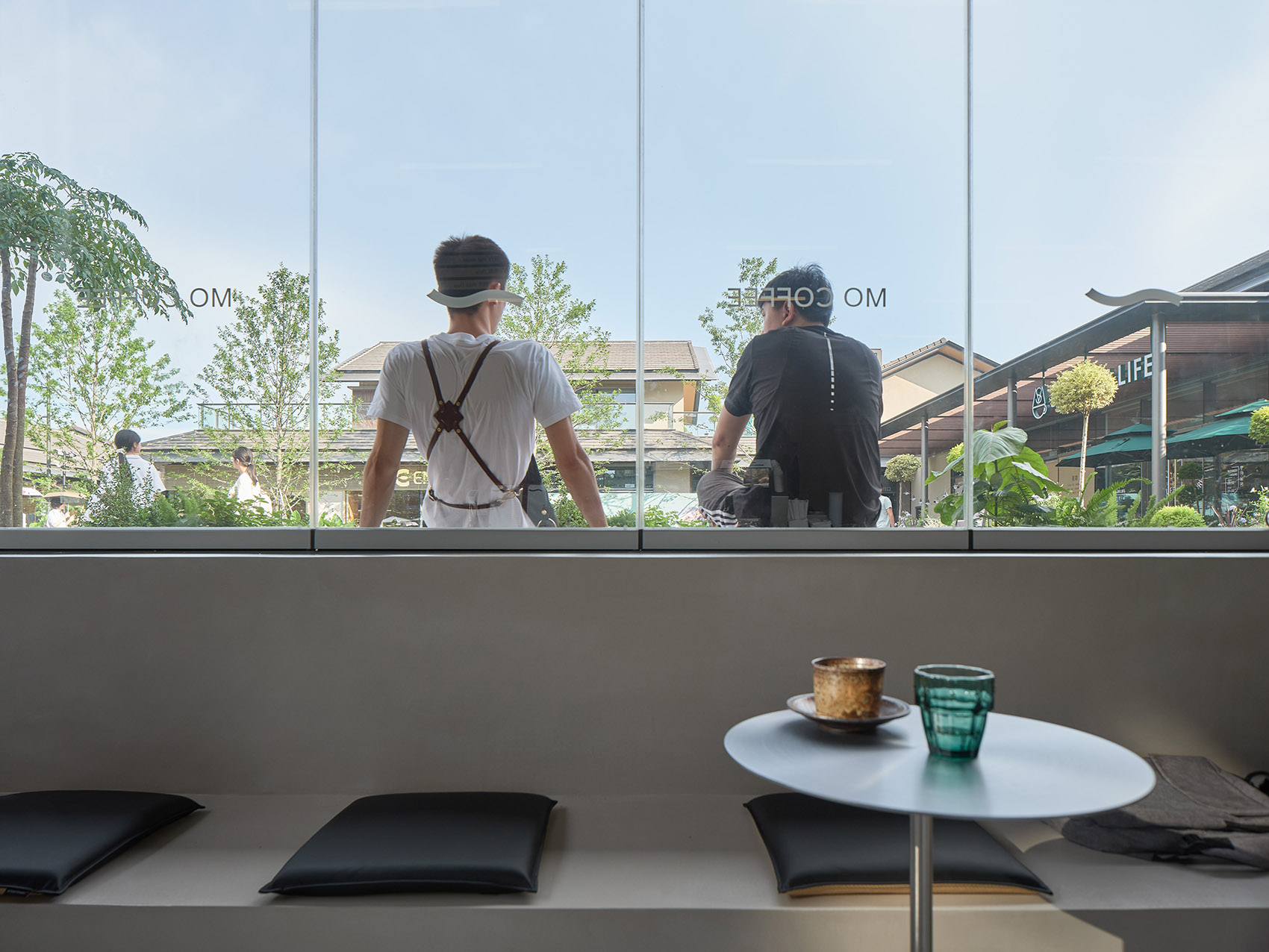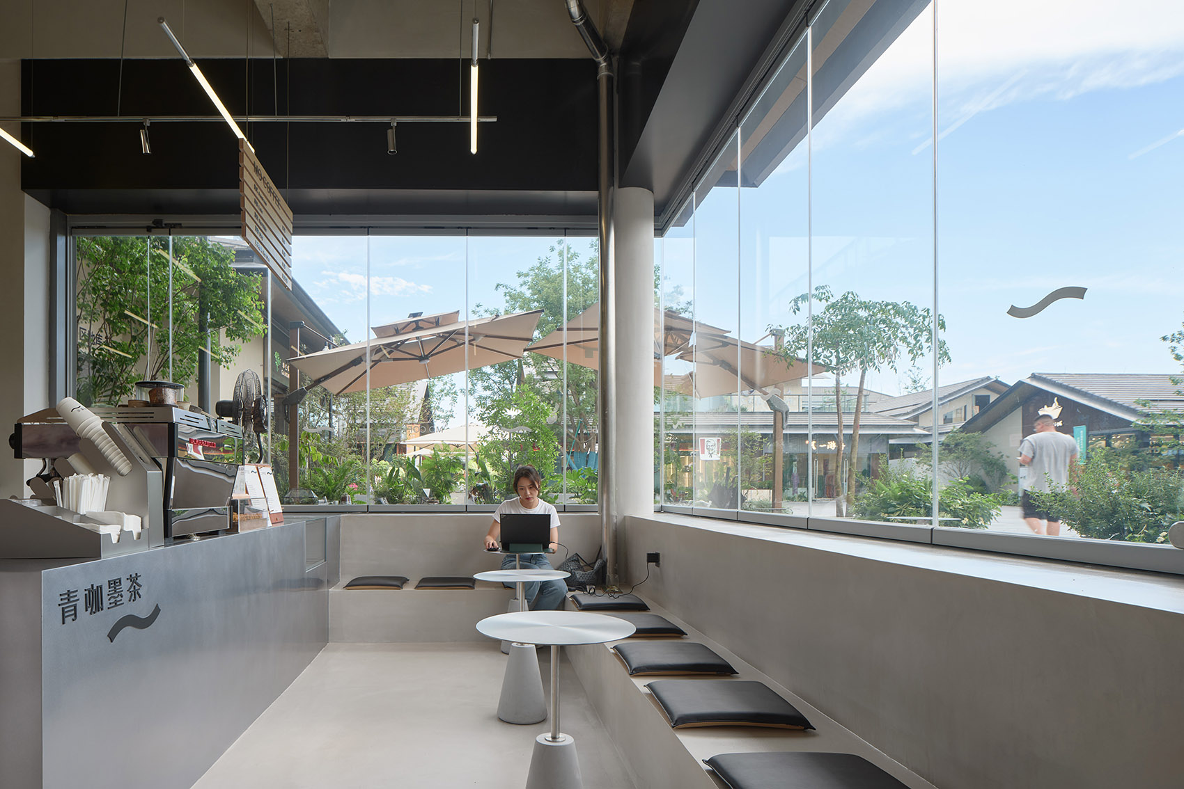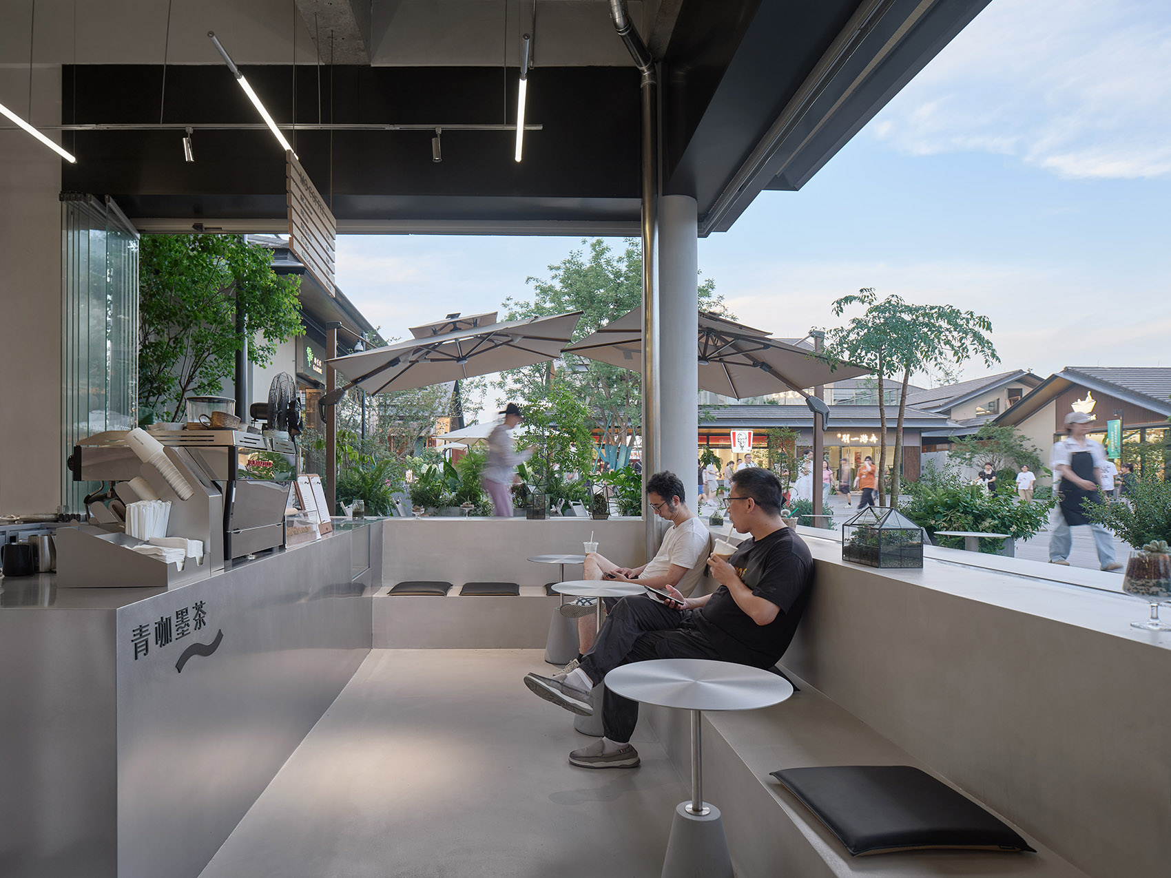 咖啡店位于杭州玉鸟集,面向广场与旱喷,是当之无愧的C位。设计时间正处于春夏之交, 户外微风是任何人工设计都无法比拟的舒适体验,让人想起童年在树荫下喝下一碗凉凉 的茶,清爽干净。