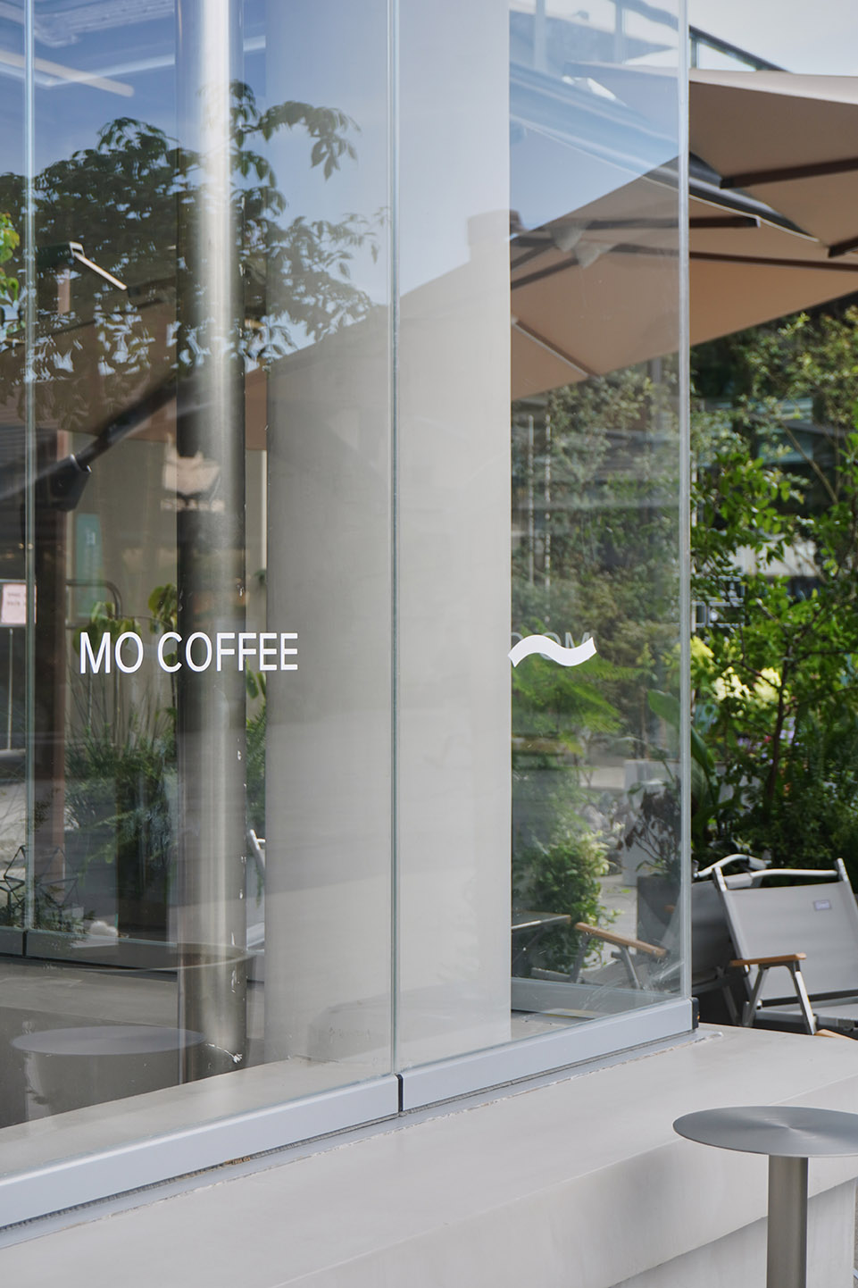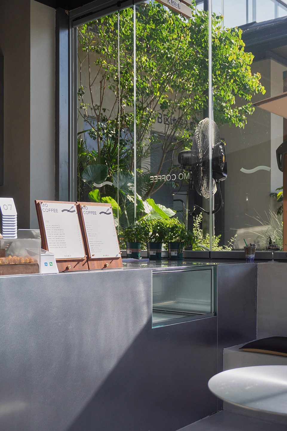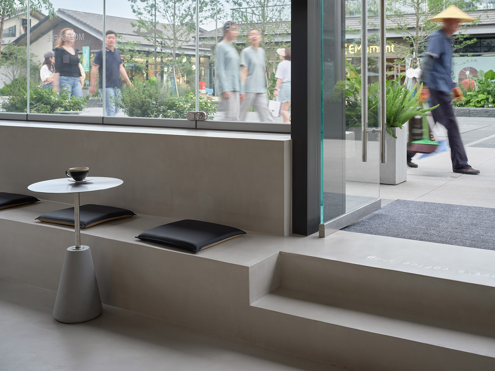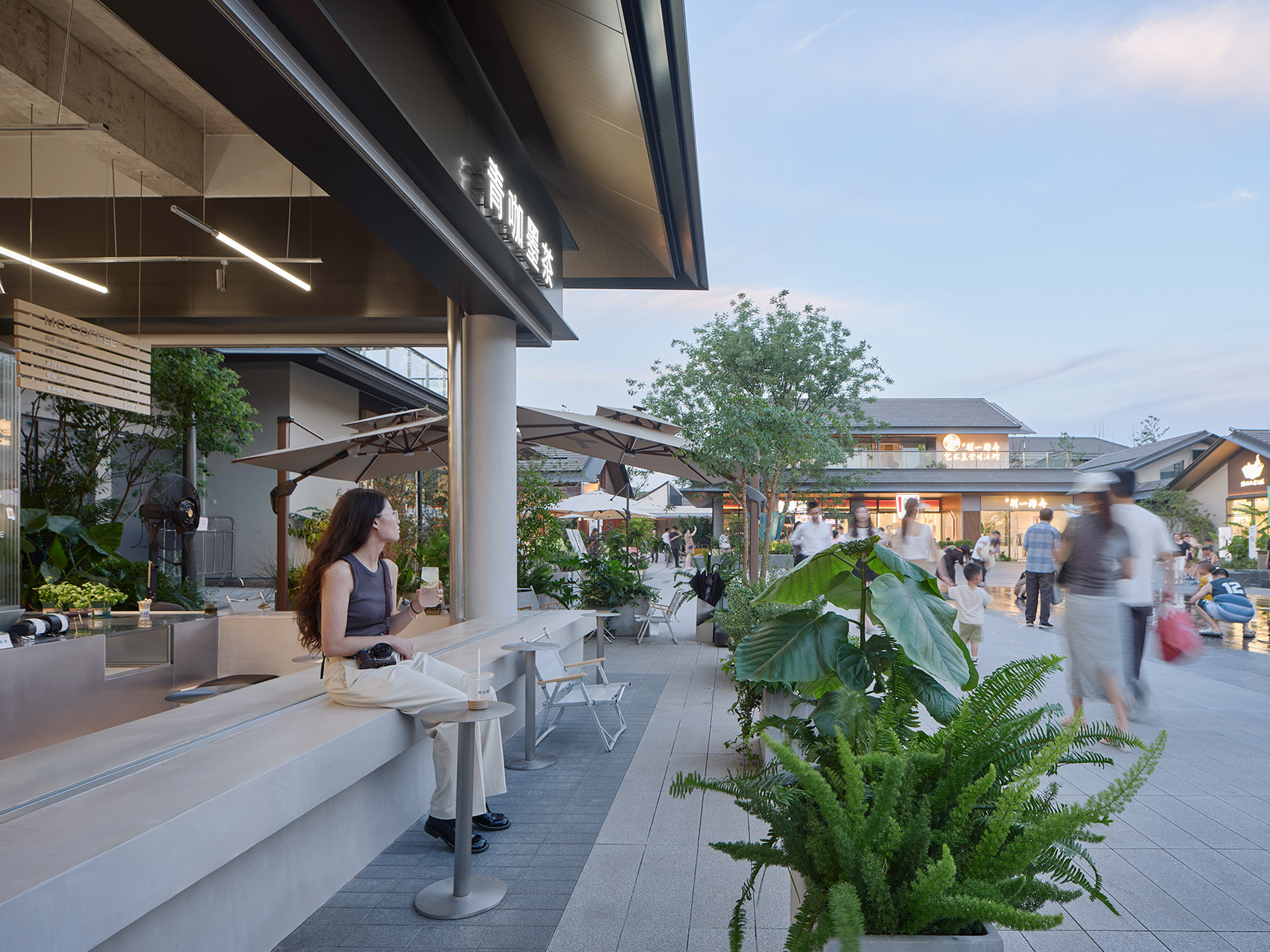咖啡店位于杭州玉鸟集,面向广场与旱喷,是当之无愧的C位。设计时间正处于春夏之交, 户外微风是任何人工设计都无法比拟的舒适体验,让人想起童年在树荫下喝下一碗凉凉 的茶,清爽干净。