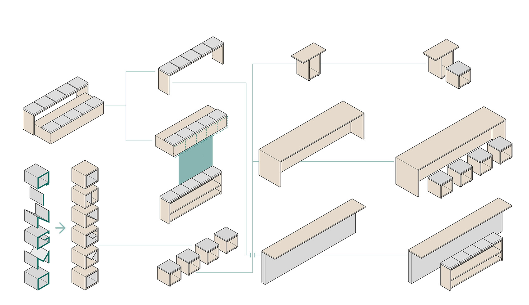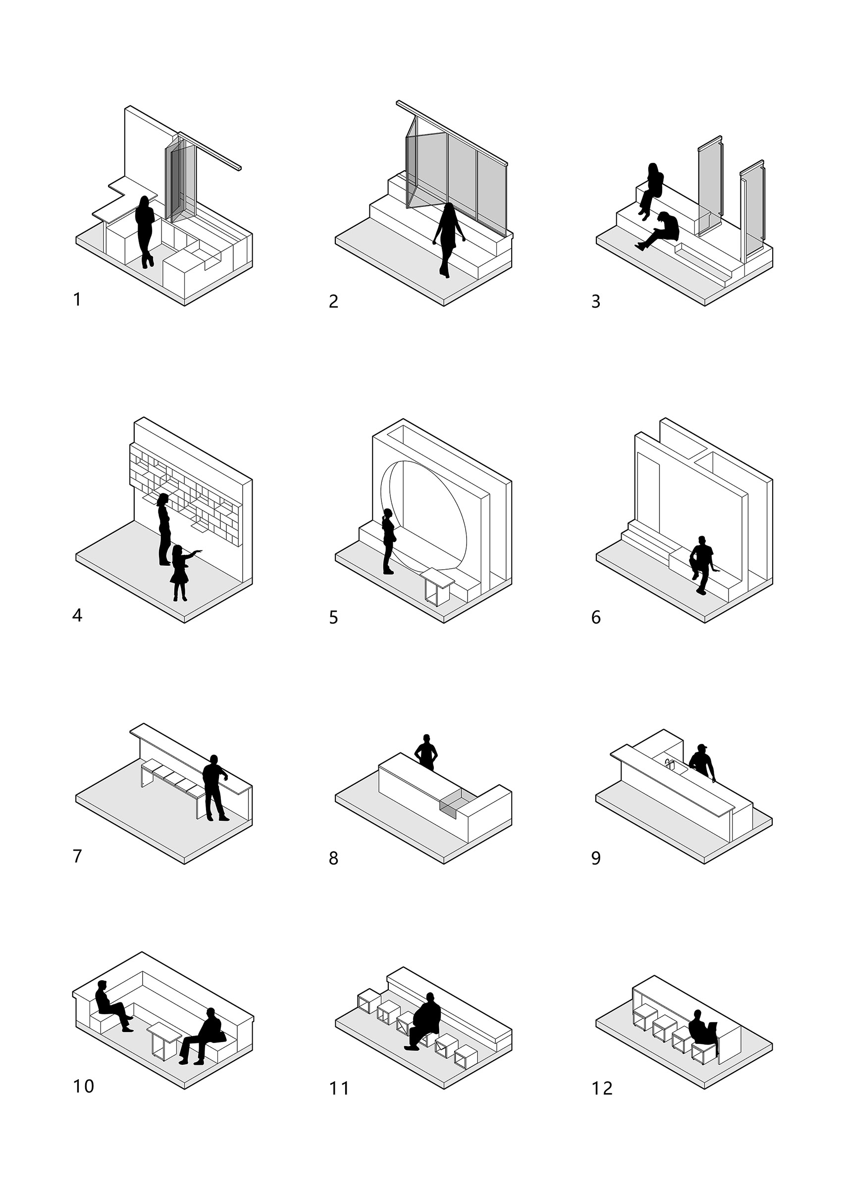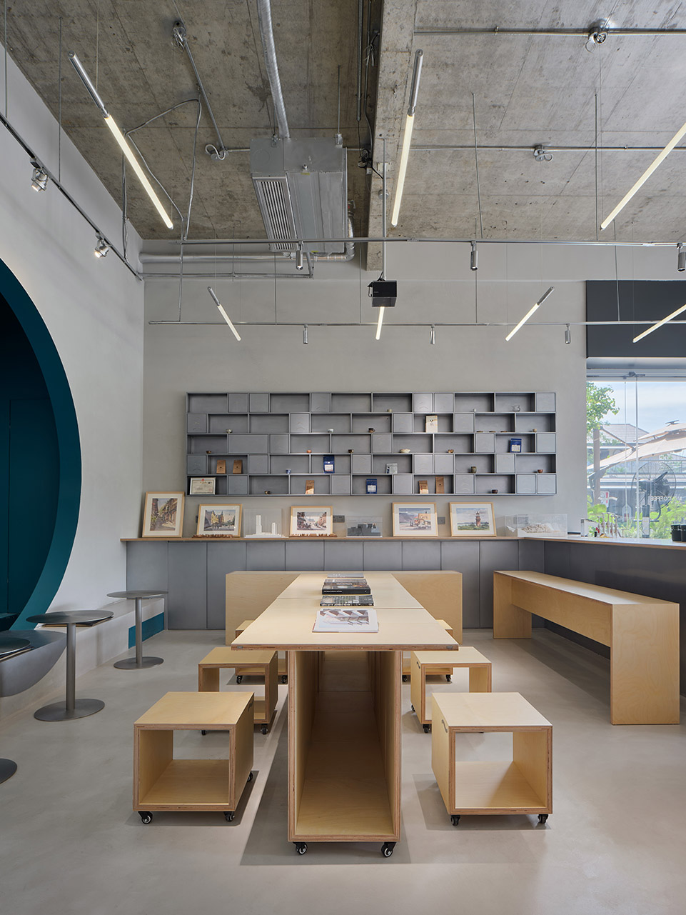 建筑师的咖啡店往往会承担除经营外的其他可能,如对谈、讨论、展览等。因此店内的桌、椅、凳、阶都由统一材料与统一模数制作,不仅朴素简单,也可作为基本单元模块,实现不同使用场景下的灵活切换。