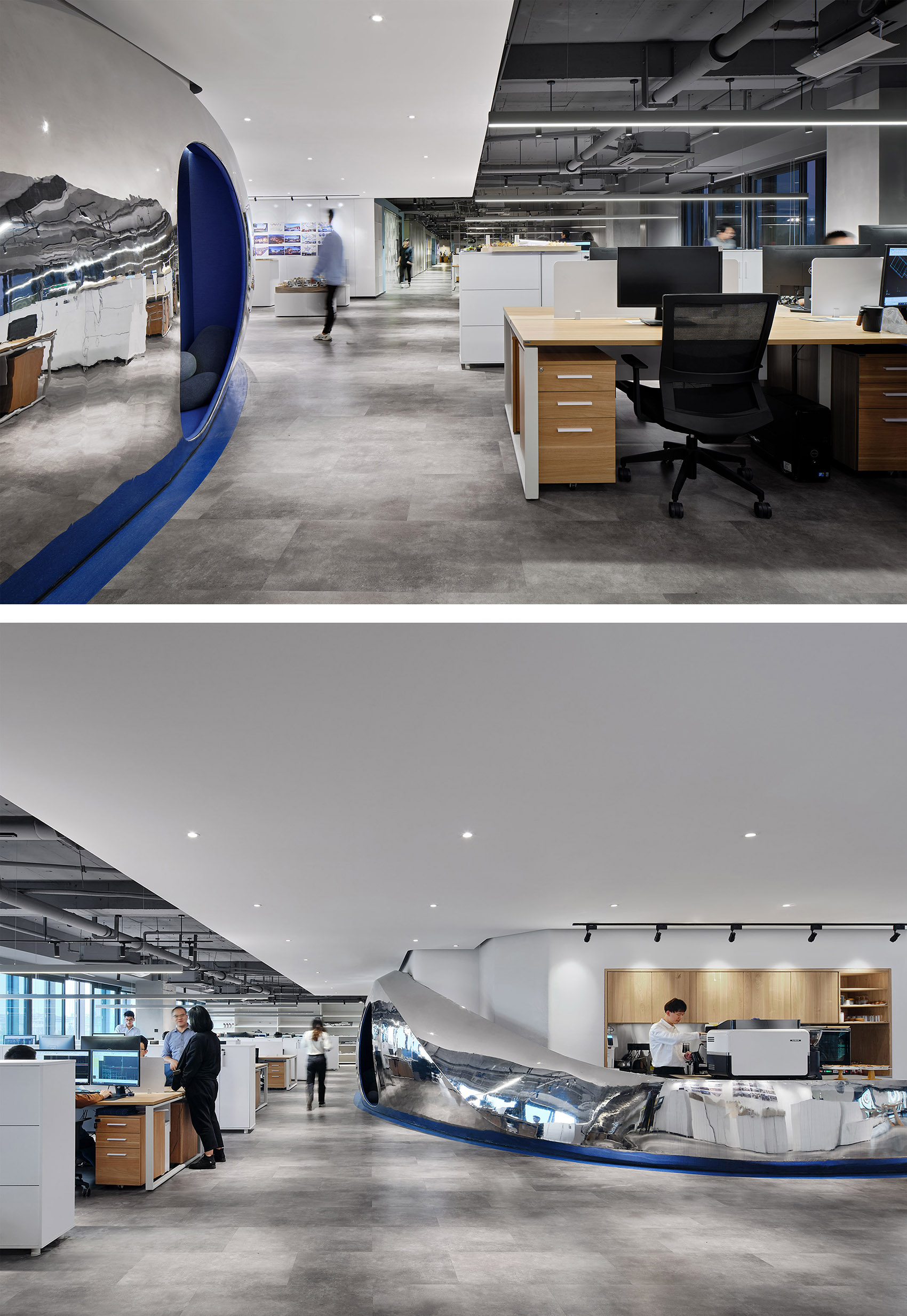 三年前,我们在业主办公室置入迷你咖啡吧,流动的镜面不锈钢激活了核心筒区域。专业咖啡师不仅为同事们制做咖啡,也总是会接到同园区其他公司的“订单”。友邻们纷纷组团来打卡“办公室咖啡”,也带着好奇心围观设计公司的日常。