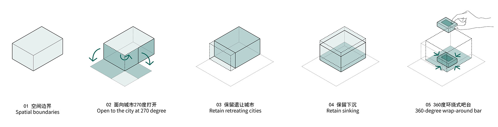 因此设计保留朝向城市广场的270°开放界面,玻璃用来抵御夏季的暴晒与冬季的严寒,而在不冷不热的好天气,折叠玻璃移门可完全打开,为人们留住初夏的风。