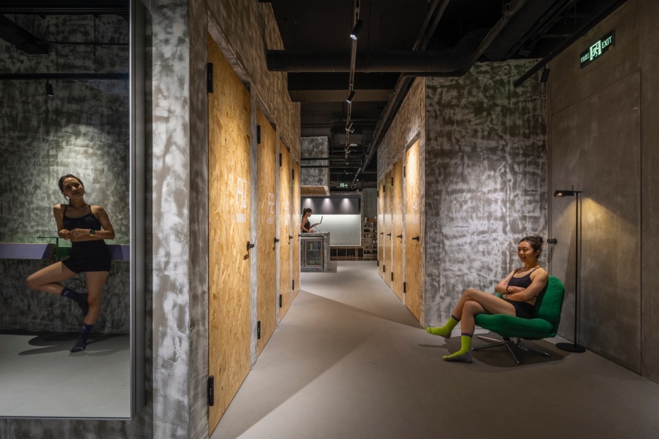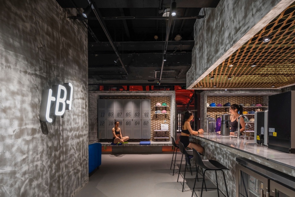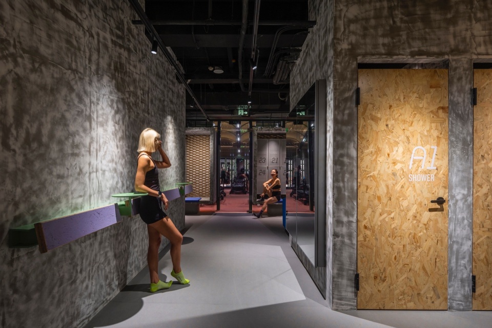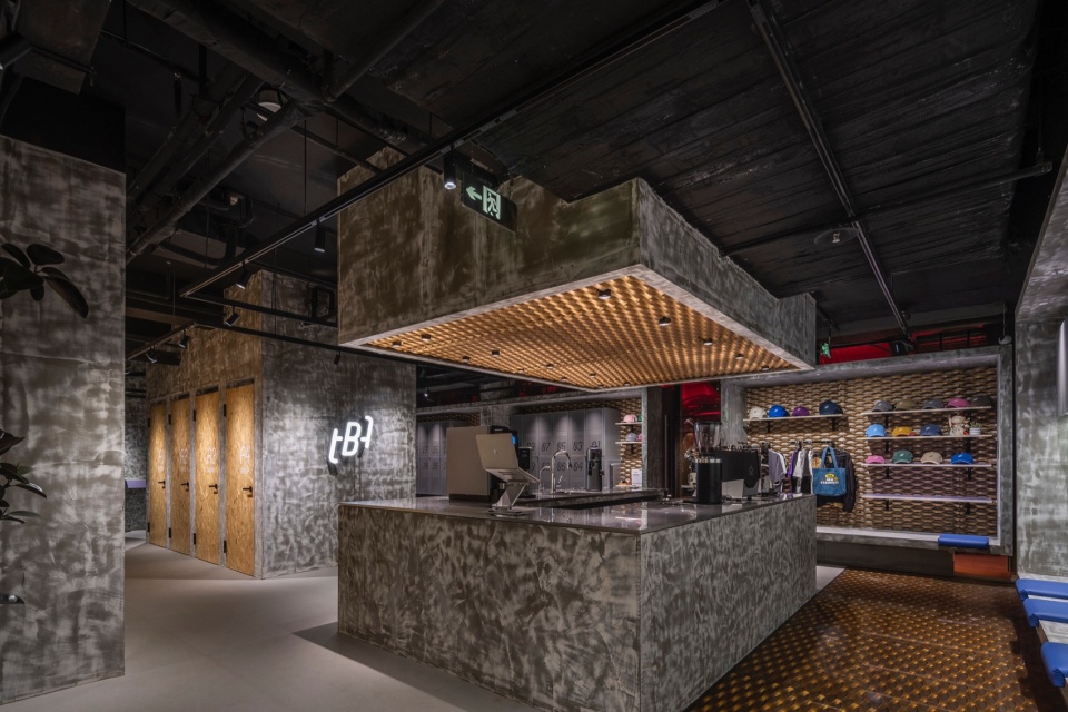 在公区设计中,我们弱化传统健身空间的功能感,通过灵活体块划分营造流动而松弛的动线,让人能自由穿行、停留与交流。裸顶结构、无对缝材料与舒适家具共同营造出轻松自在的氛围,鼓励人们在这里放松身心。空间中也保留了老店的部分材料——金色拉网板被树脂封存,被裁切拼接,变成地面、天花与收纳背板;旧柜体拆下的刨花板则成为新的置物架与靠背。这些“老元素”以新的方式融入空间,不是为了怀旧,而是为熟悉的情感保留一份温度。功能完善的大吧台与开放的LAB区增强了空间的互动性,也为学员提供更丰富多样的使用体验。