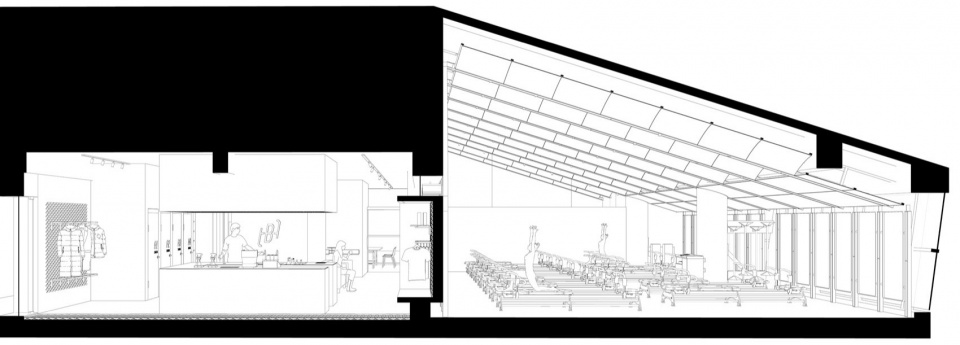团课教室则呈现出截然不同的气质。原始斜顶通高的场地,被我们以定制钢构架结构重新演绎,使空间自然地向上生长,传递出探索身体潜能与精神升华的力量,鼓励学员在专注的同时不断突破自己的极限。功能性元素——照明、镜面、设备——被巧妙嵌入结构中,既不喧宾夺主,又有序统一。而涂有经典绿色的钢构件,则借鉴了欧洲旧建筑的色彩,带来一抹沉稳厚重的历史质感。