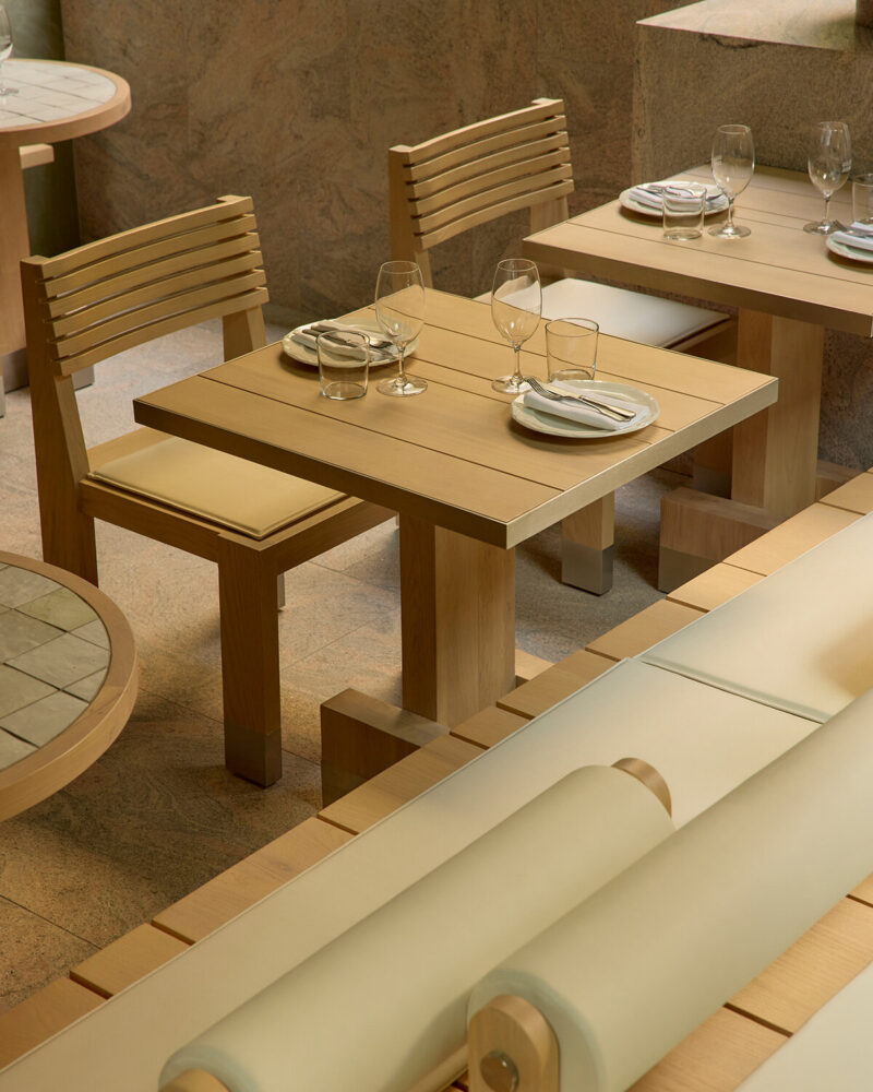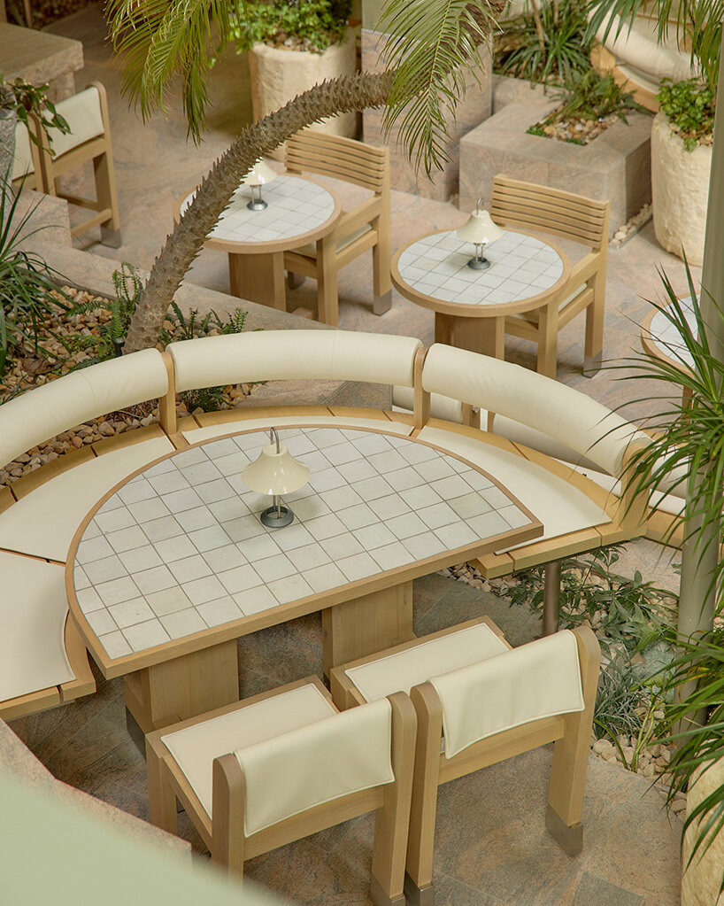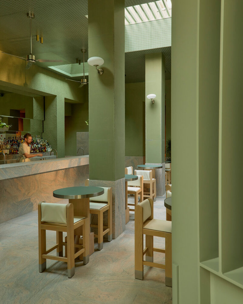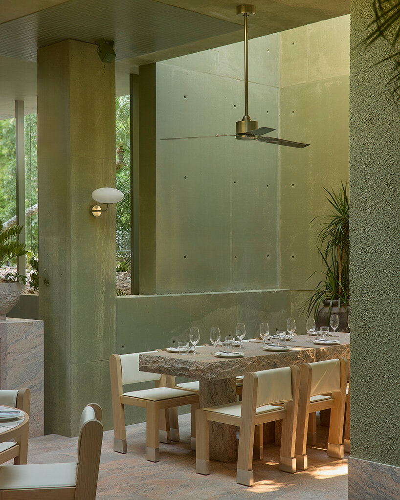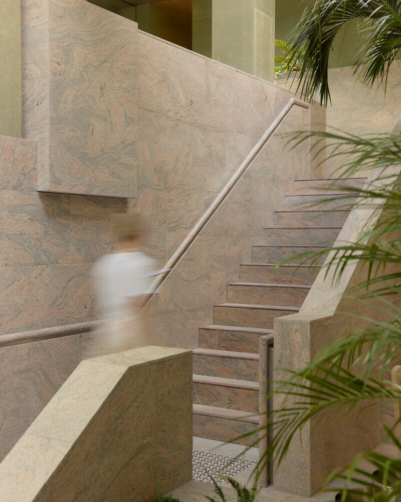 在材质运用上,整个场所既展现出坚固质感,又兼具可触摸的温度。粉色花岗岩、不锈钢装饰细节与大面积混凝土表面,被绿植以及透过天窗和穿孔构件洒入的自然光柔化。设计中还融入了定制家具、石材洗手池、专属吊扇及为项目量身打造的照明系统,充分体现出事务所对细节把控与整体融合的追求。