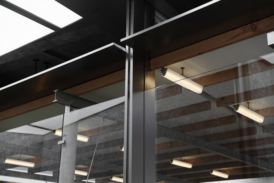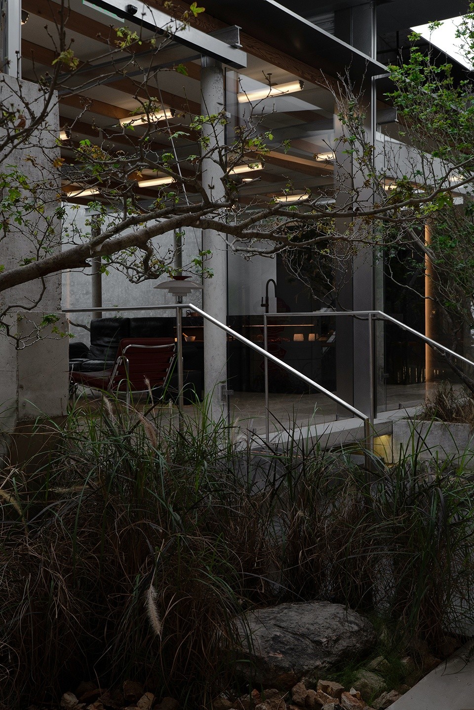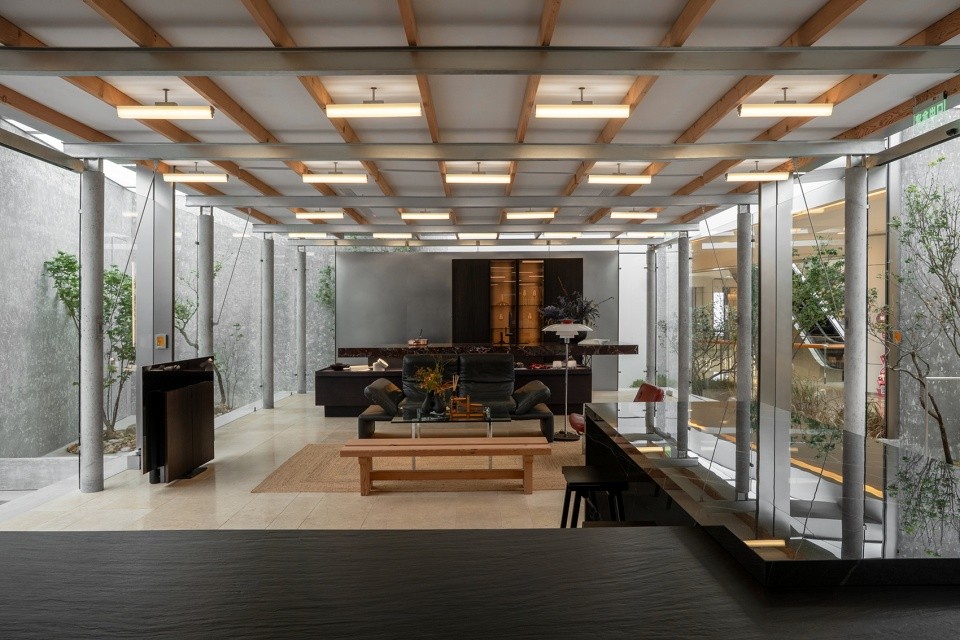 设计灵感来源于建筑大师密斯·凡德罗设计的范斯沃斯住宅。这座坐落于福克斯河畔的经典住宅以简洁的几何构成、通透的结构形式和对空间细节的极致追求而闻名。我们将这种建筑思维引入品牌体验中心设计中,将其视为一个建筑项目来打造,而不仅仅是一个传统的室内设计案例。在这个空间中,我们植入了一个独立的建筑框架结构,赋予空间以“建筑化”的特质,同时创造出开放与包容的场域。这个框架既是功能的载体,也是形式的表达,它与空间的材料、光线和产品展示形成了深度对话。