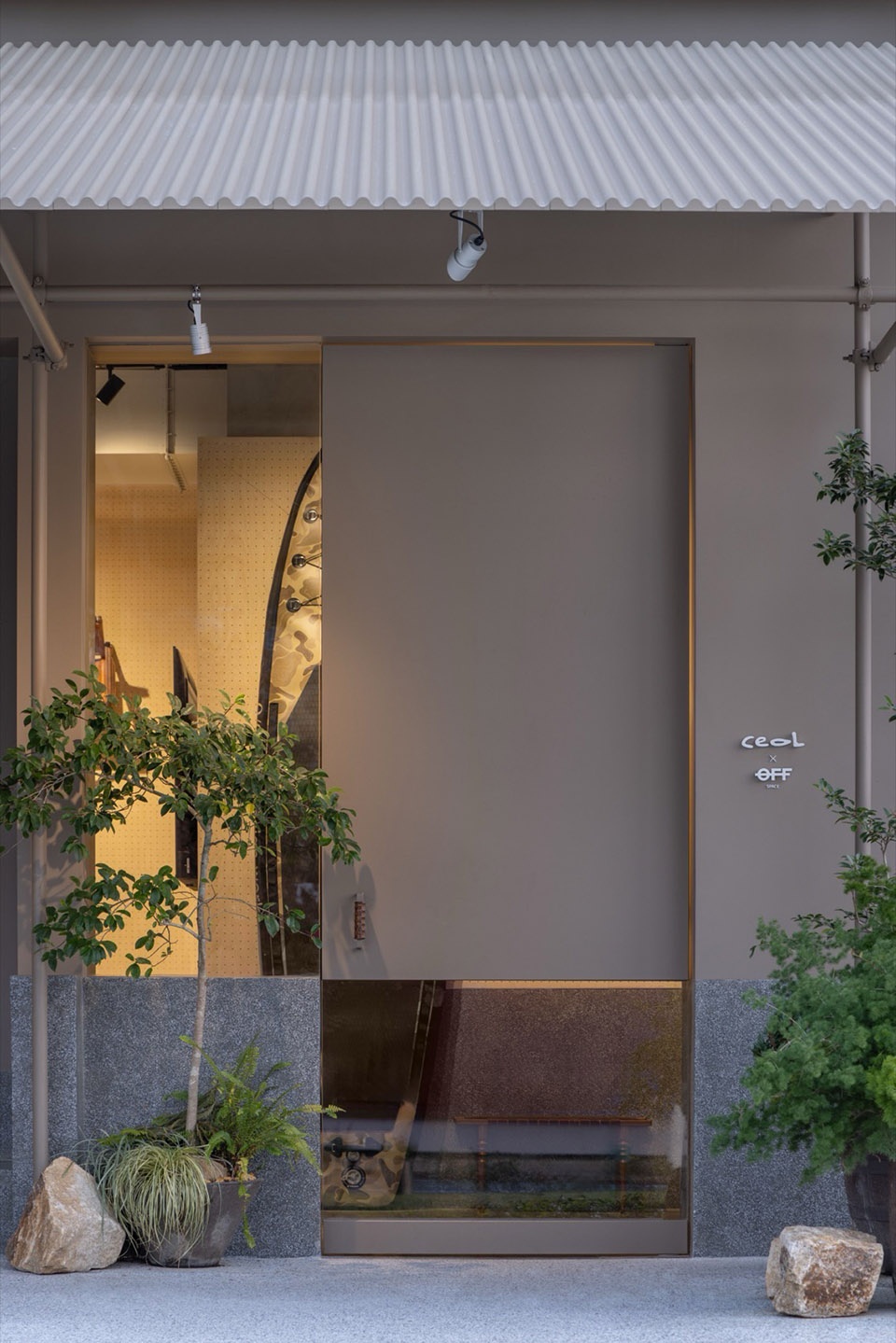 灰色水磨石的腰线向外延伸至入户大门,搭配玻璃和金属材质,形成一个虚实结合的几何立面,对内部店务视觉半通透,规整划一,灵动趣味。