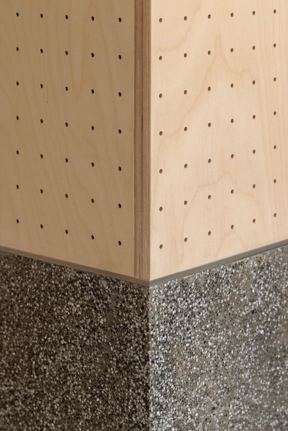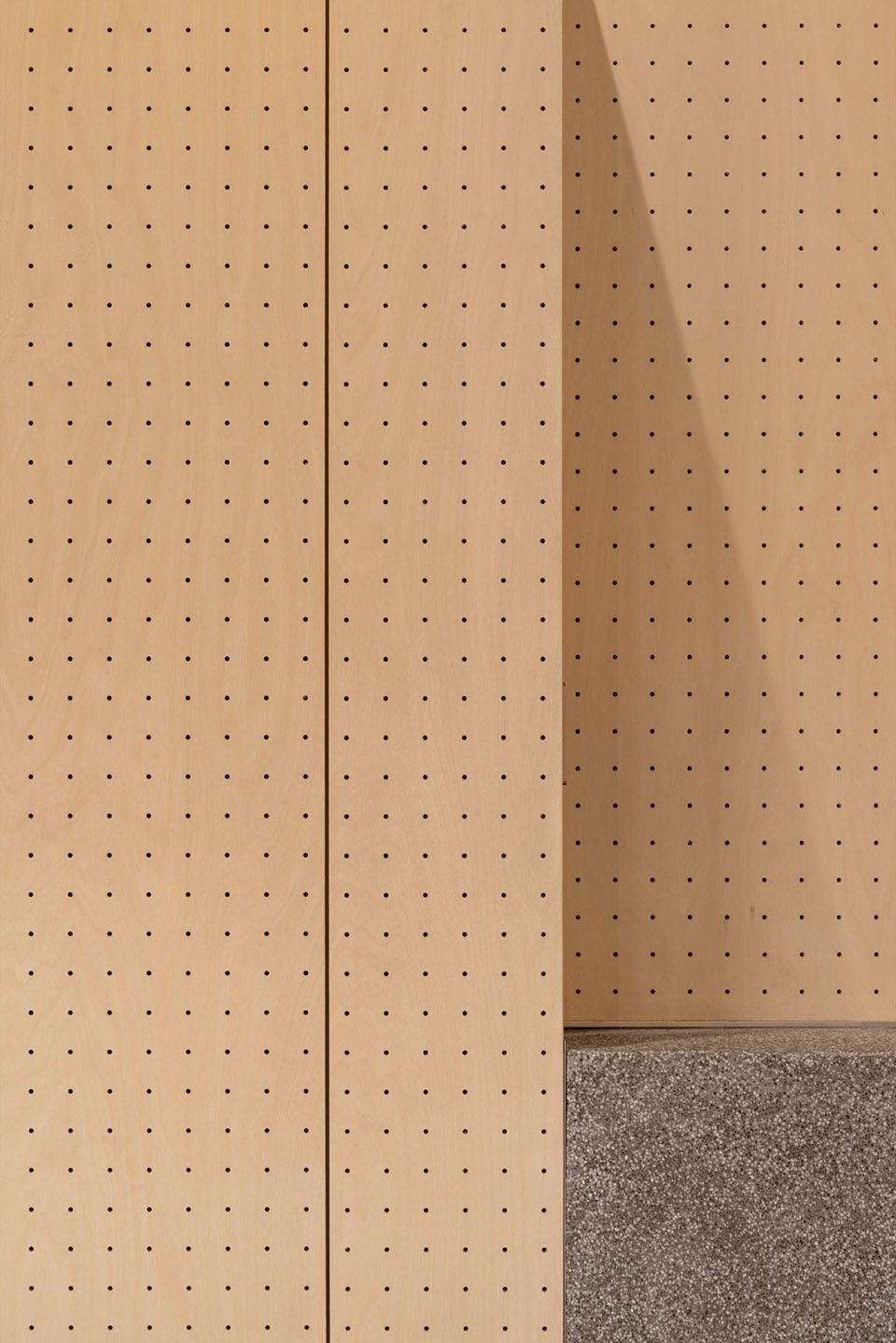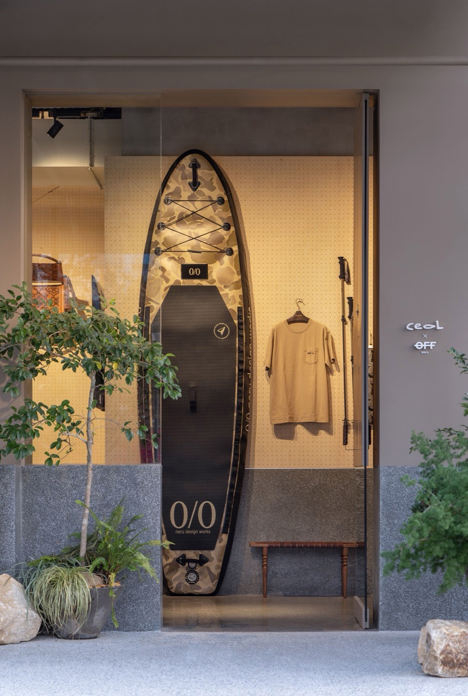 Ceol是OFF杭州首家联名店,店铺设计延续了OFF SPACE的沙色主基调,采用大量海洋板包裹。有别于本店的整墙洞洞板,Ceol店将地面金刚砂水磨石材质向上延伸至立面腰线,高度与吧台齐平,同时吧台也选用水磨石打造,从视觉角度将空间切分为简洁利落的上下两部分。