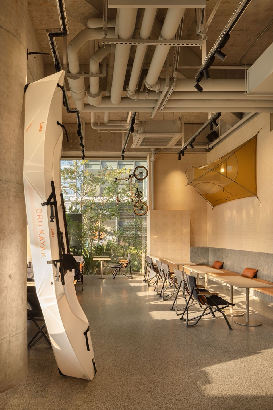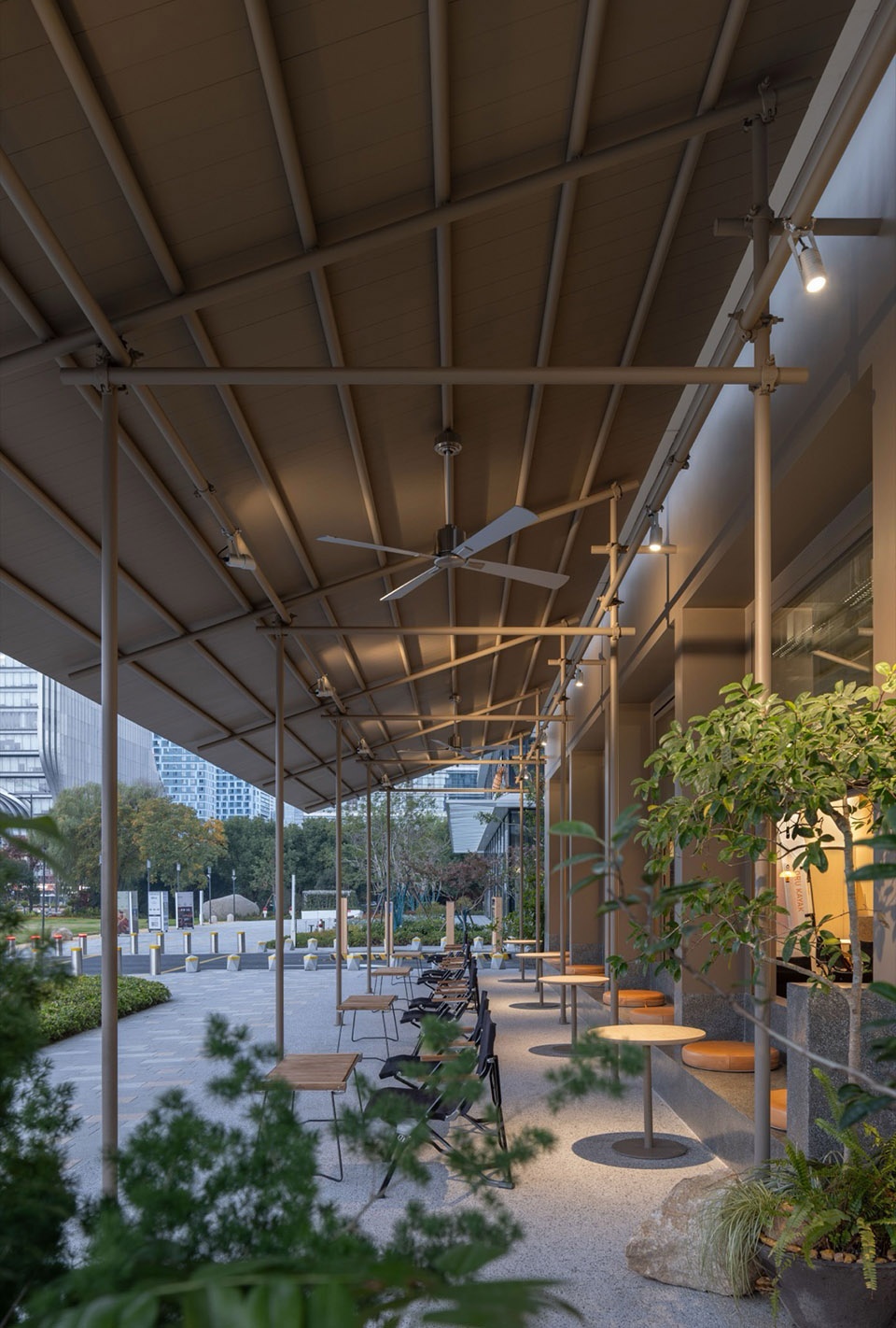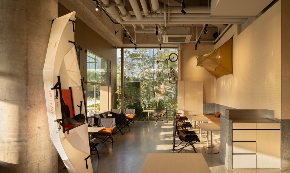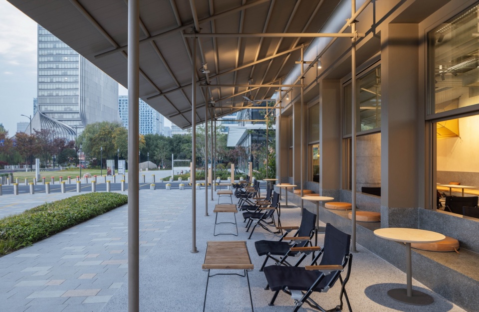 我们遵循建筑的玻璃幕墙框架结构,将店铺立面均分为五等份,左侧四份用于客座区,右侧一份设为入口。客座区的玻璃采用电动上下升降窗,自如切换室内外空间的边界,并以此升降窗为媒介,将客区分为室内落座区、户外卡座区、户外落座区,将有限空间最大化利用。