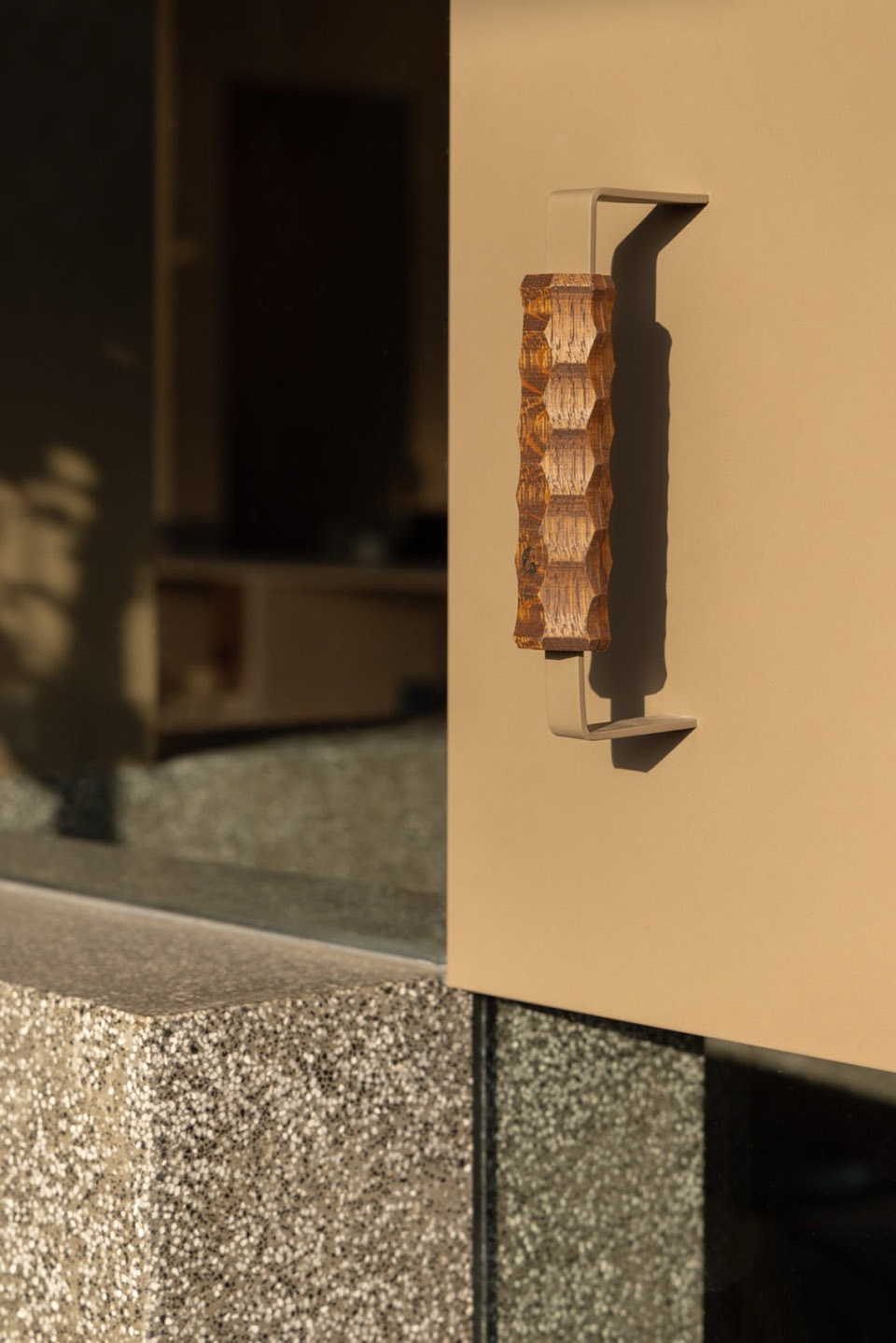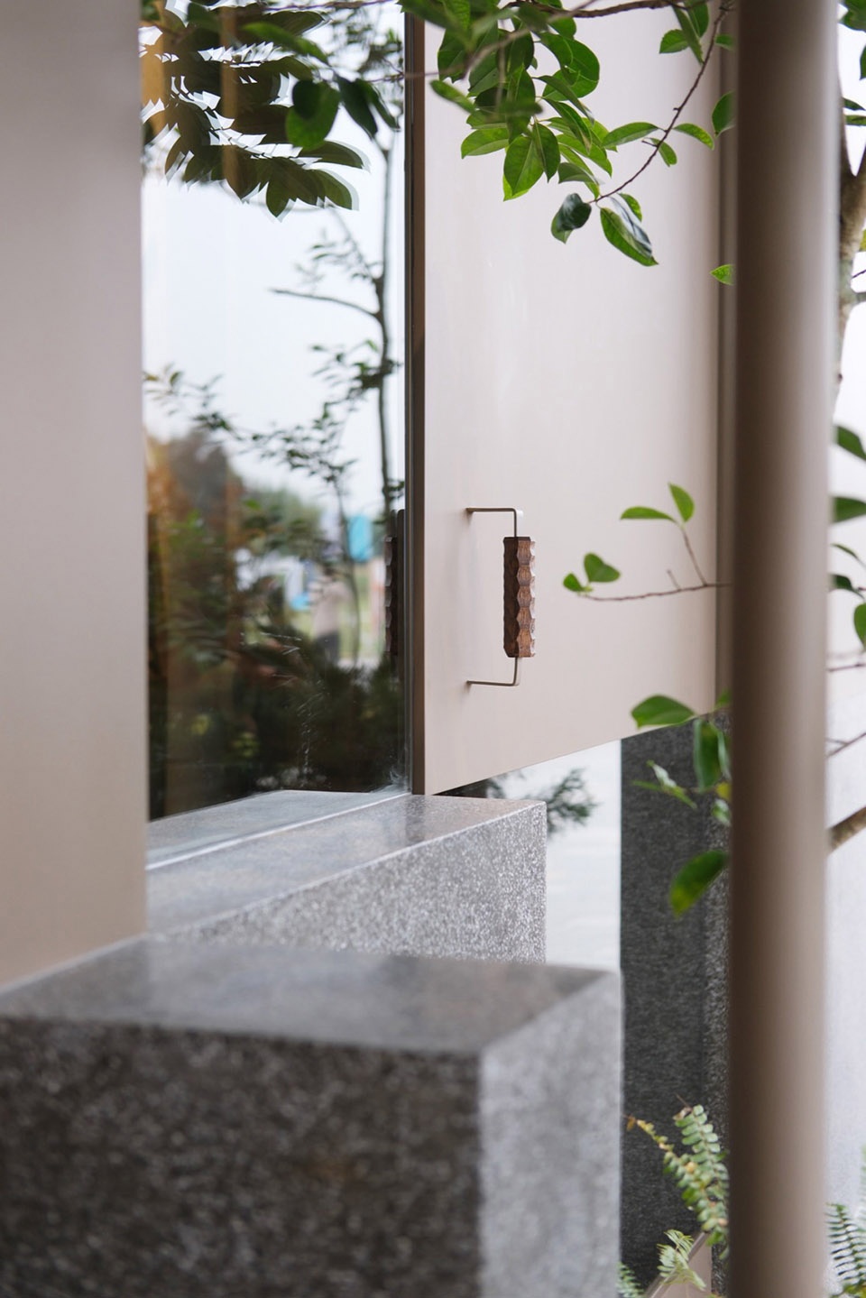 ▼灰色水磨石的腰线向外延伸至入户大门