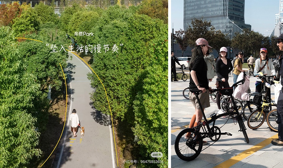亲橙Park位于杭州未来科技城,紧挨阿里巴巴总部,旁边是之江实验室,对面是字节跳动,钉钉大楼就在Park里,过个马路是vivo全球总部。这里拥有大片湖泊和草地,有人在水中浆板,有人在岸上露营,是一个可呼吸的自然系商业公园。